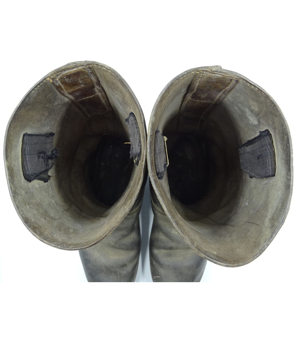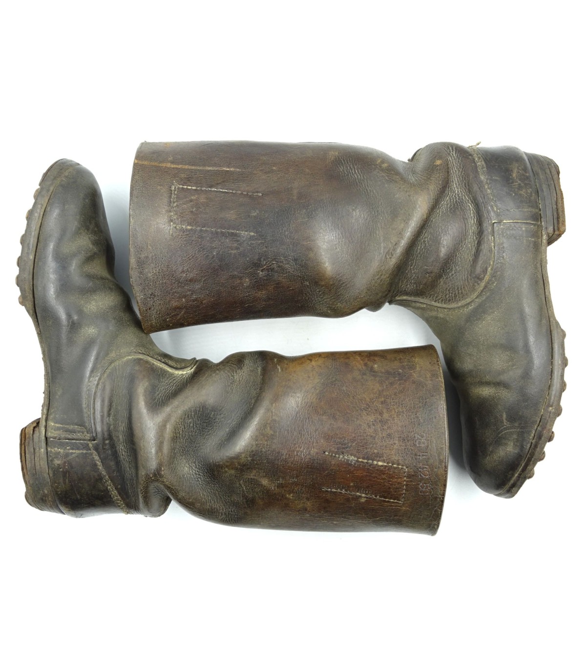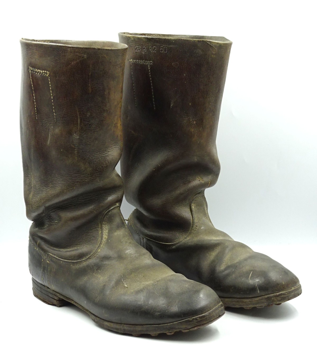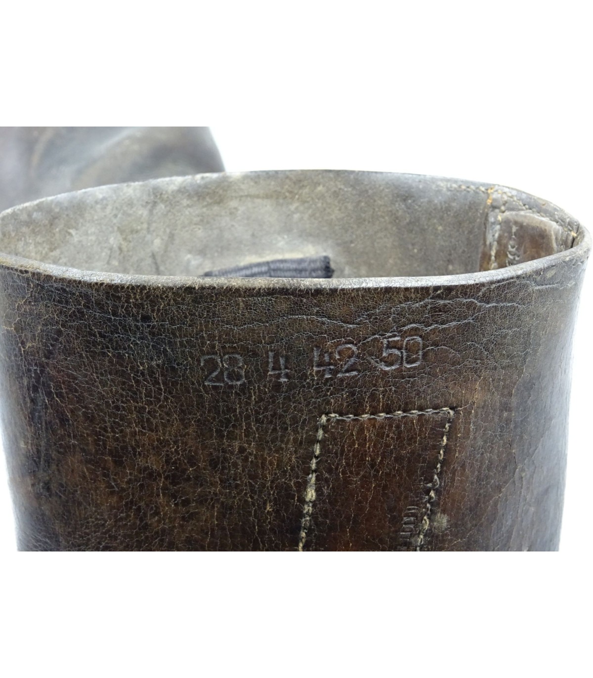 Marschstiefel, surnommées 'Knobelbecher' (cornet à dés) par les Landsers. Modèle court. Fers en U absents, cloutage à peu près complet. Pointure environ 42. Bien marqués en haut de la tige 28.4.42. ABE+.