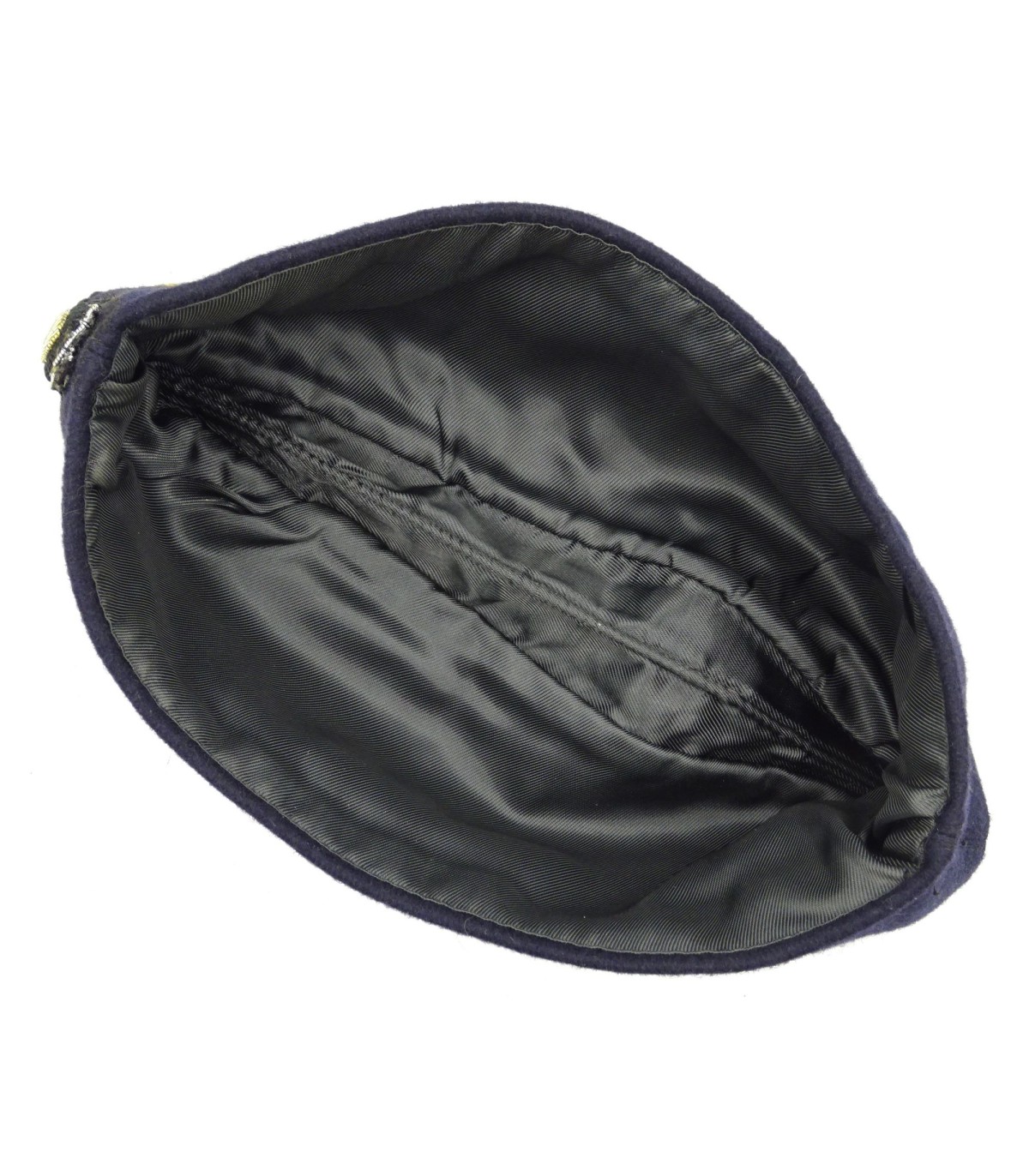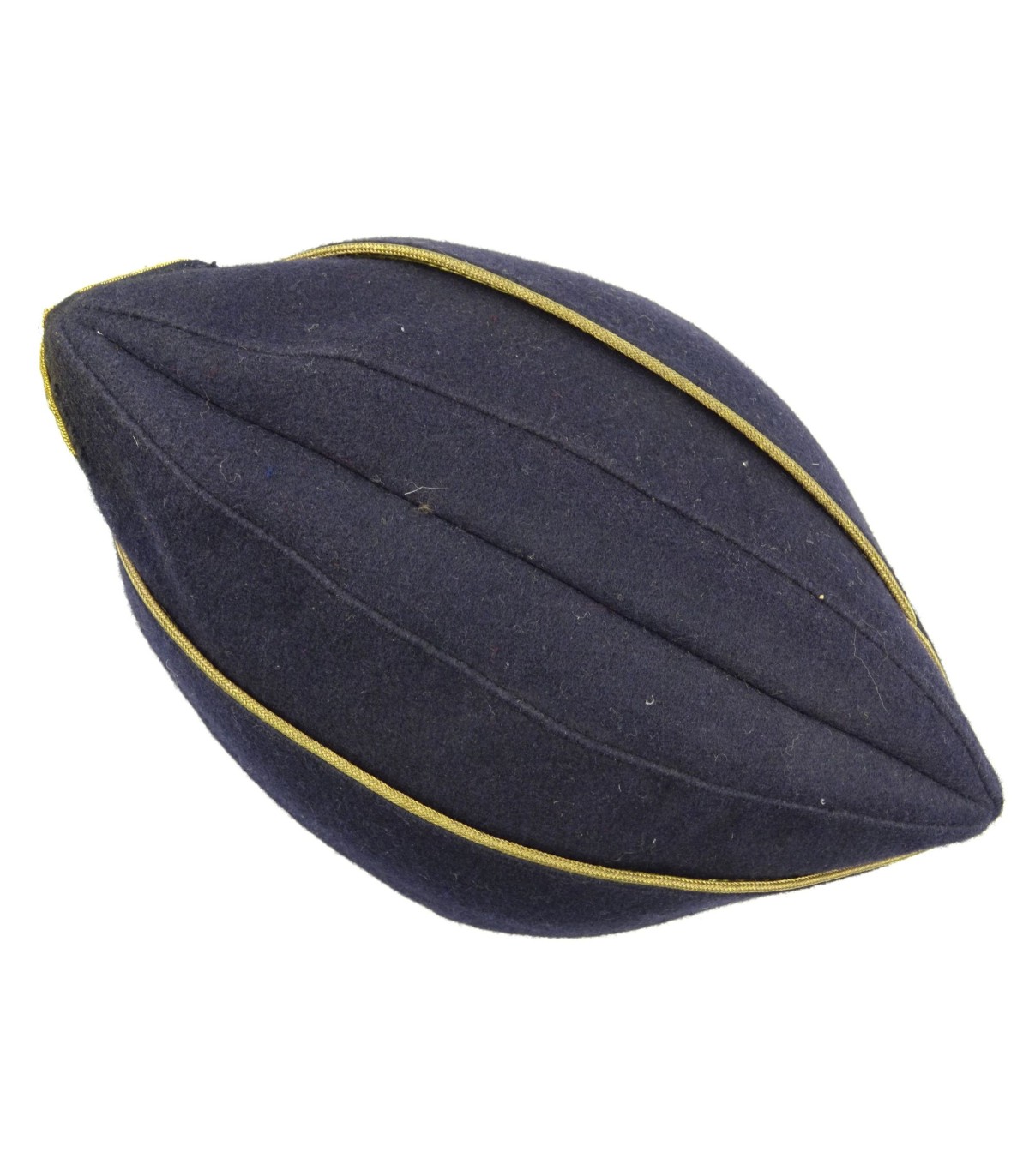 Complet. Drap de laine bleu-marine, passepoil or. Aigle et cocarde brodés main en canetille or. Doublure rayonne noire. TBE.