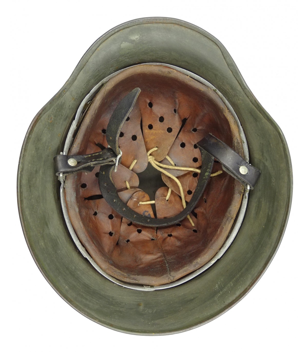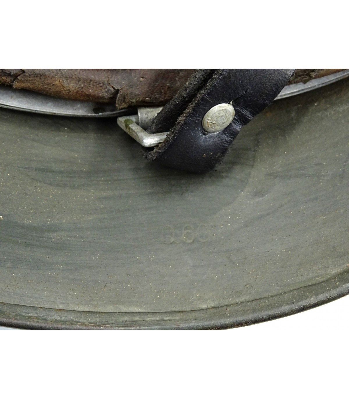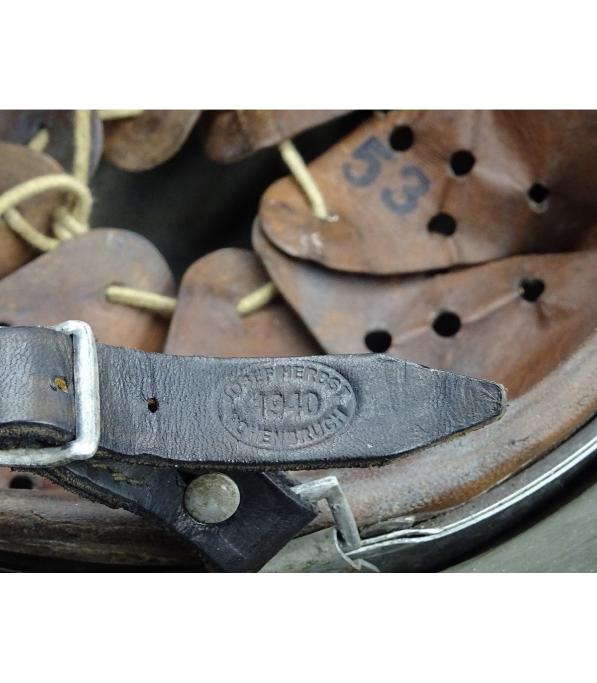 T53. Q60 #2767. Cerclage alu, jugulaire datée 1940. Peinture feldgrau clair grénelée à 90%. Ecusson tricolore réglementairement recouvert. Aigle KM doré à 90-95%. Origine: port français. BE-TBE. Rare.