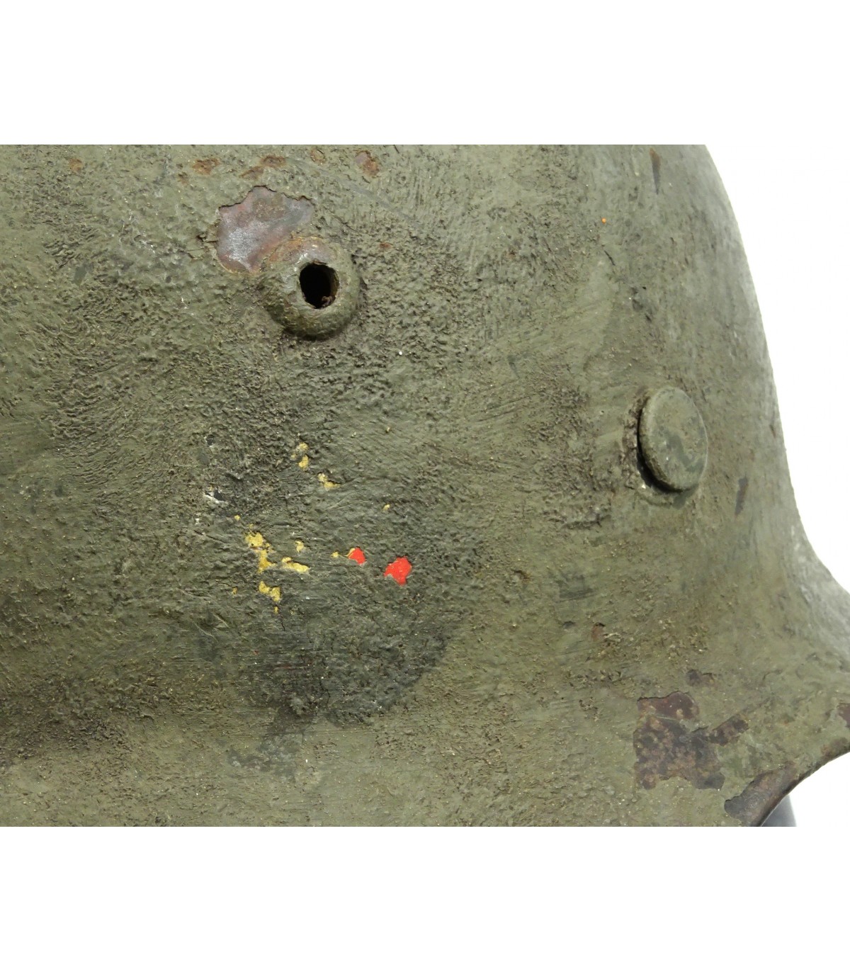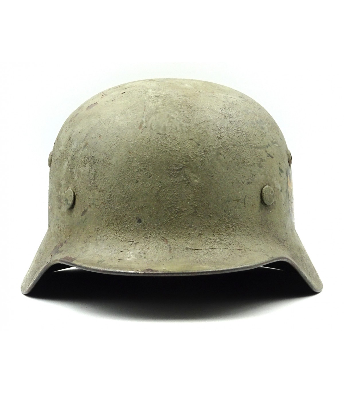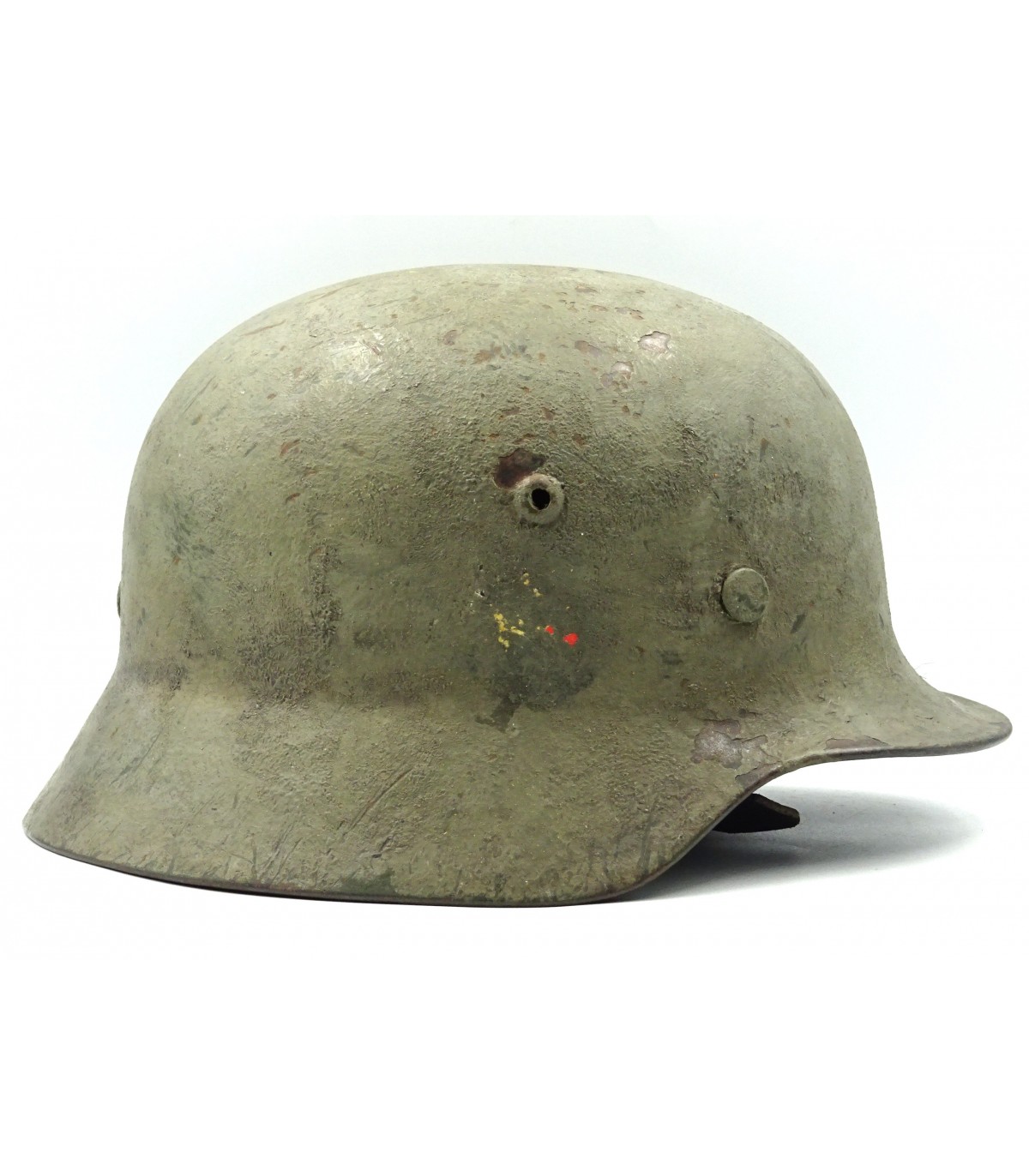 T53. Q60 #2767. Cerclage alu, jugulaire datée 1940. Peinture feldgrau clair grénelée à 90%. Ecusson tricolore réglementairement recouvert. Aigle KM doré à 90-95%. Origine: port français. BE-TBE. Rare.