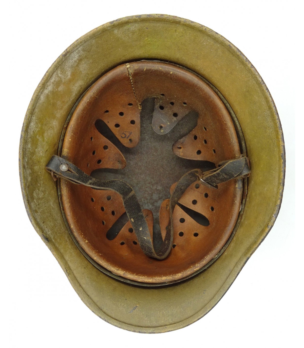 T57. Marquages de coque recouverts par le camouflage. Jugulaire et cuir de coiffe souples. Betonnage et camouflage à près de 100%. Rare dans cet état. TBE.
