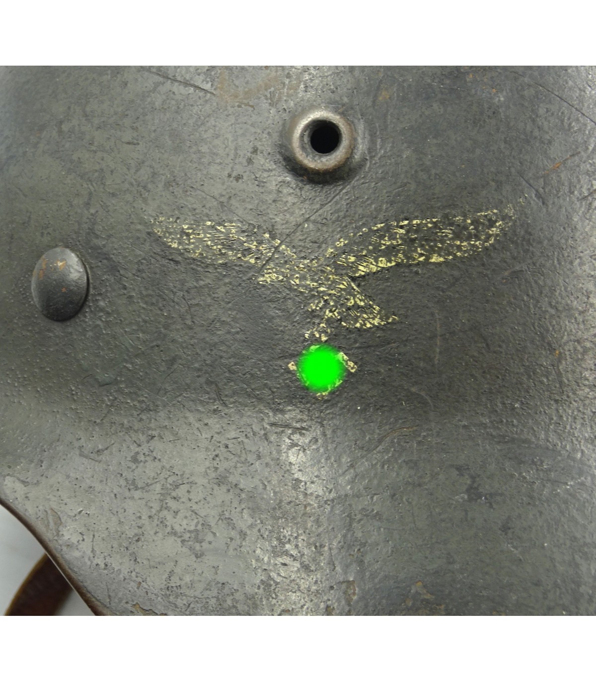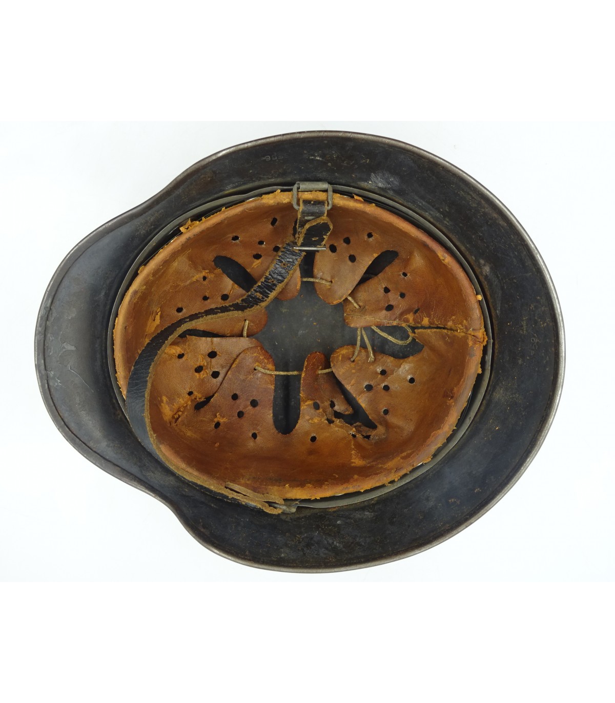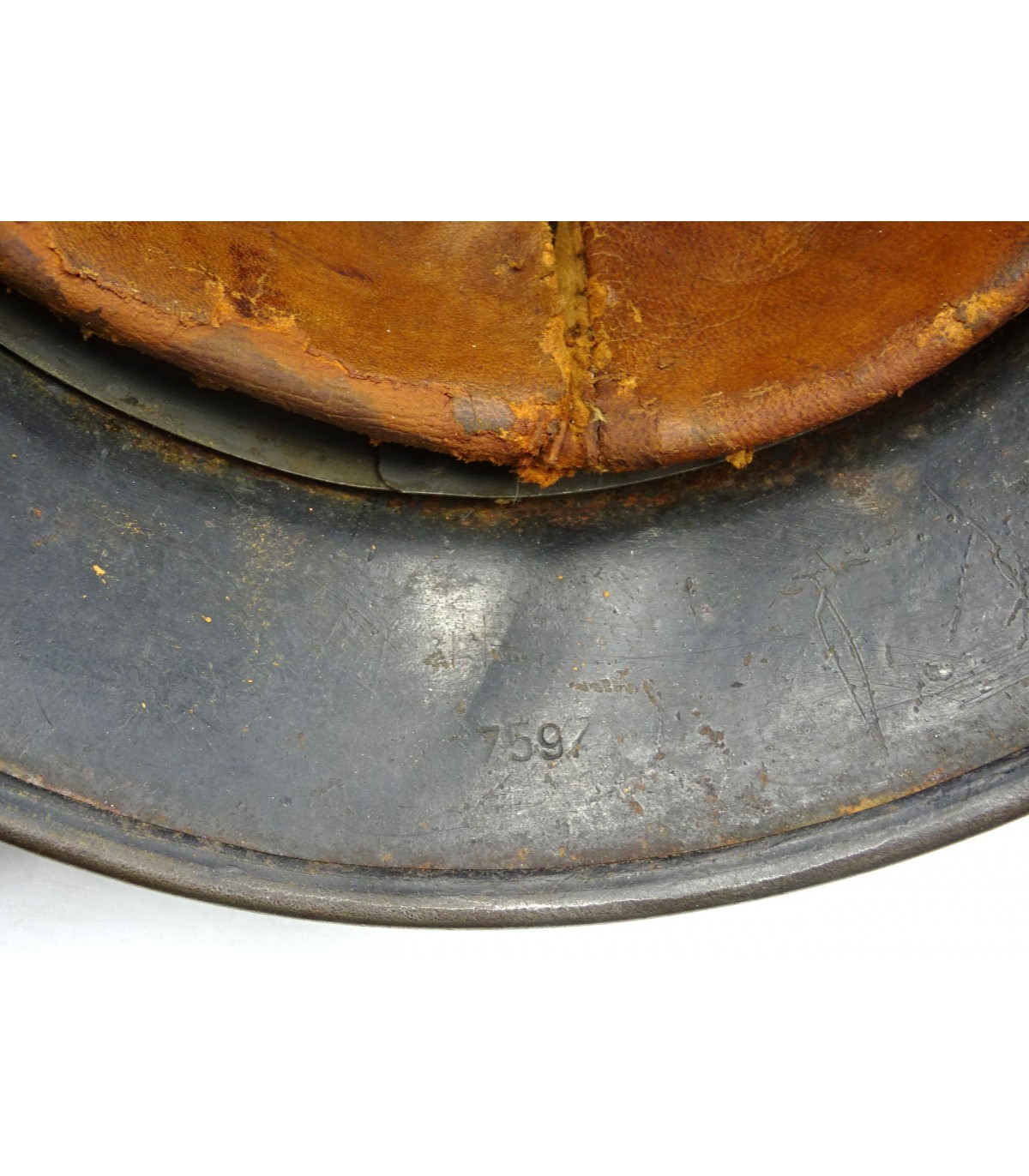 Complet. SE66 #7597. taille 58. Bonne peinture feldgrau à 70-80%, aigle à 40%. La teinte feldgrau de ce casque indique qu'il était en dotation dans une unité de combat au sol type Felddivision. Cuir de coiffe ABE, sinon BE.