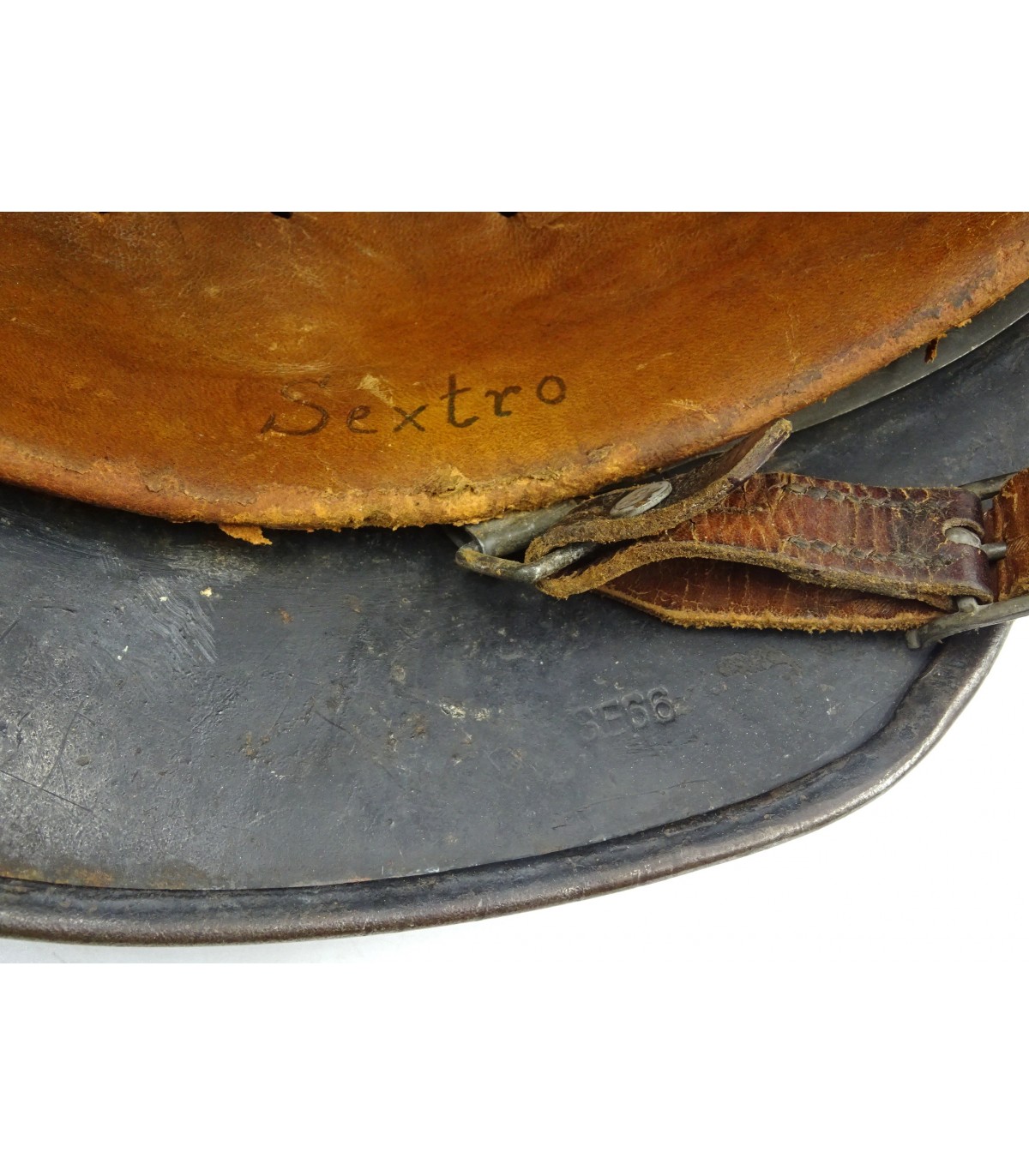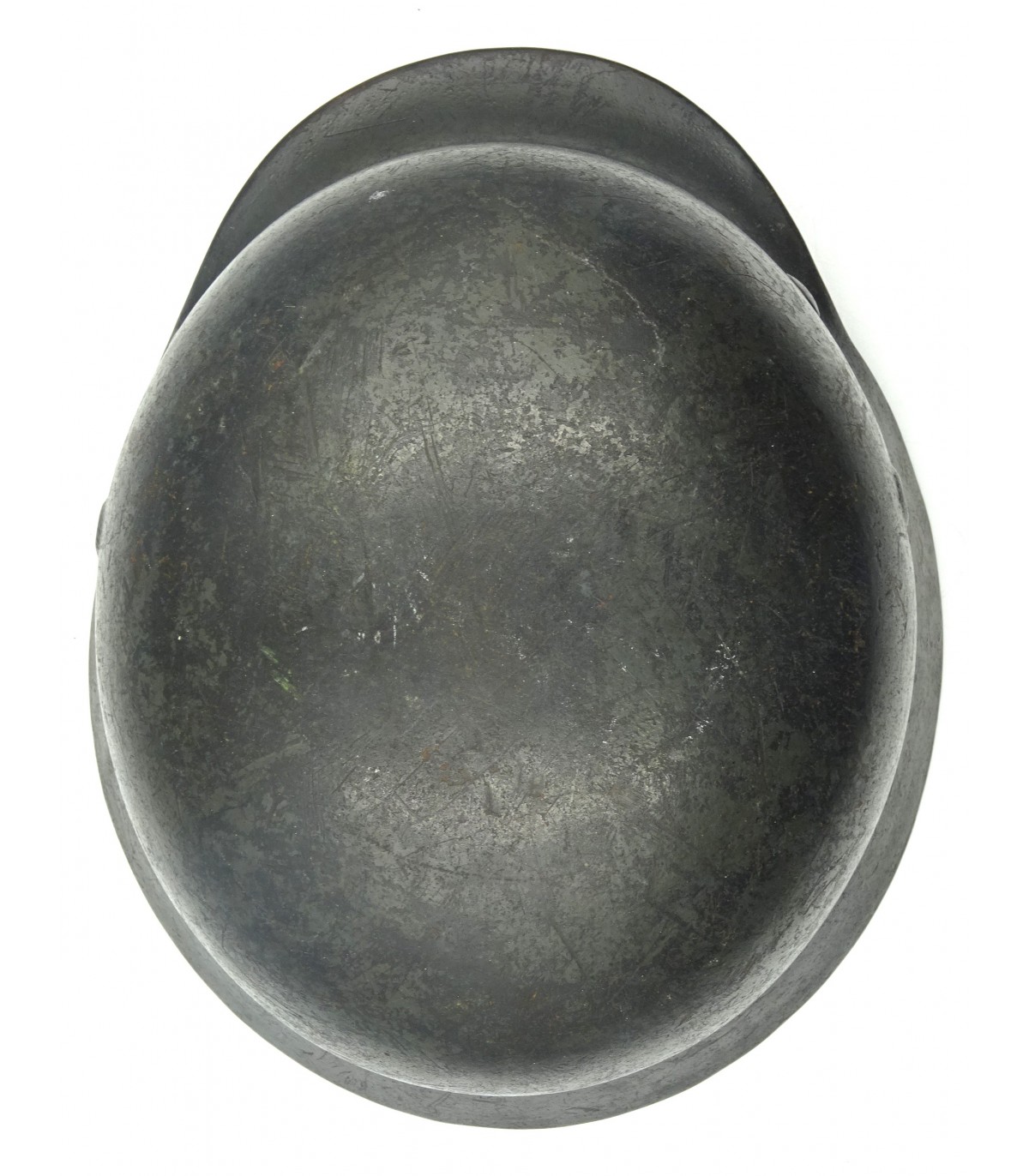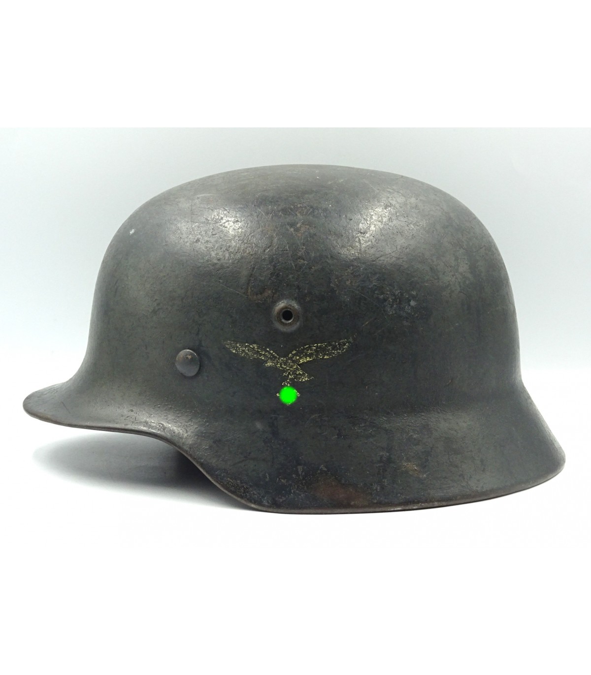 Complet. SE66 #7597. taille 58. Bonne peinture feldgrau à 70-80%, aigle à 40%. La teinte feldgrau de ce casque indique qu'il était en dotation dans une unité de combat au sol type Felddivision. Cuir de coiffe ABE, sinon BE.