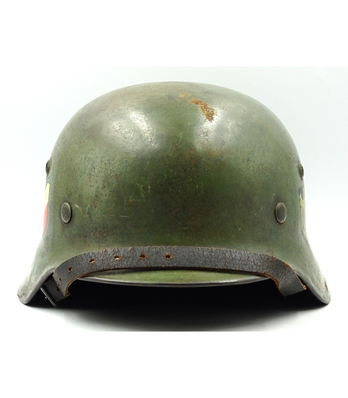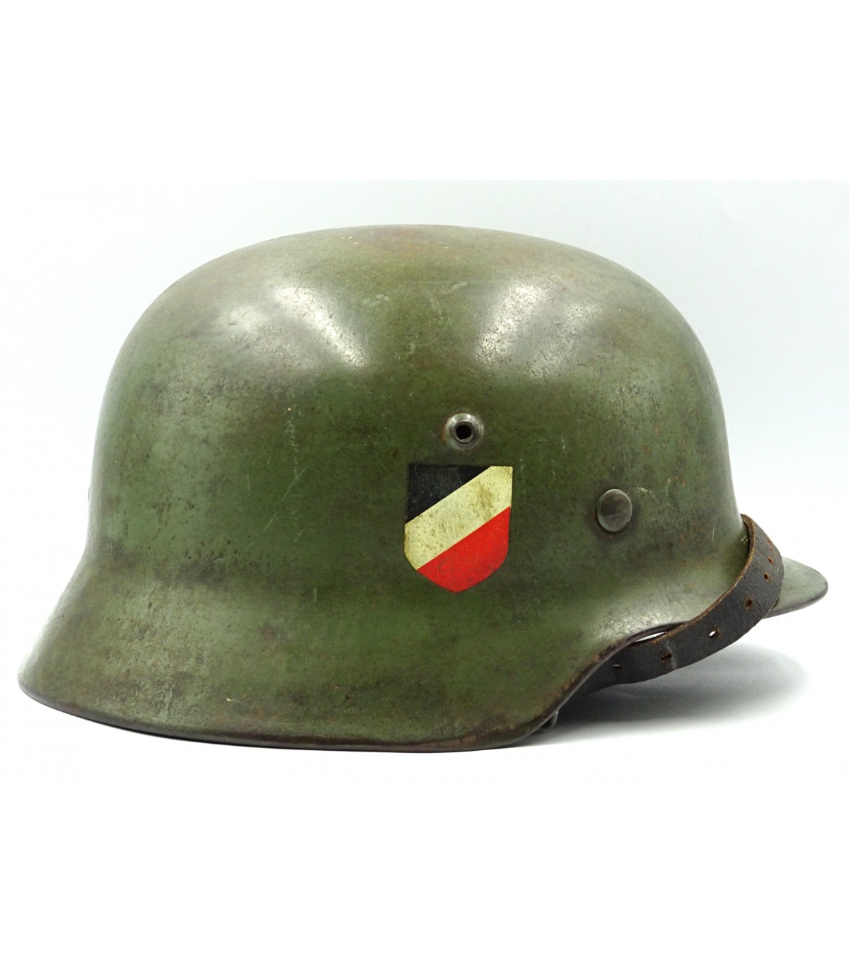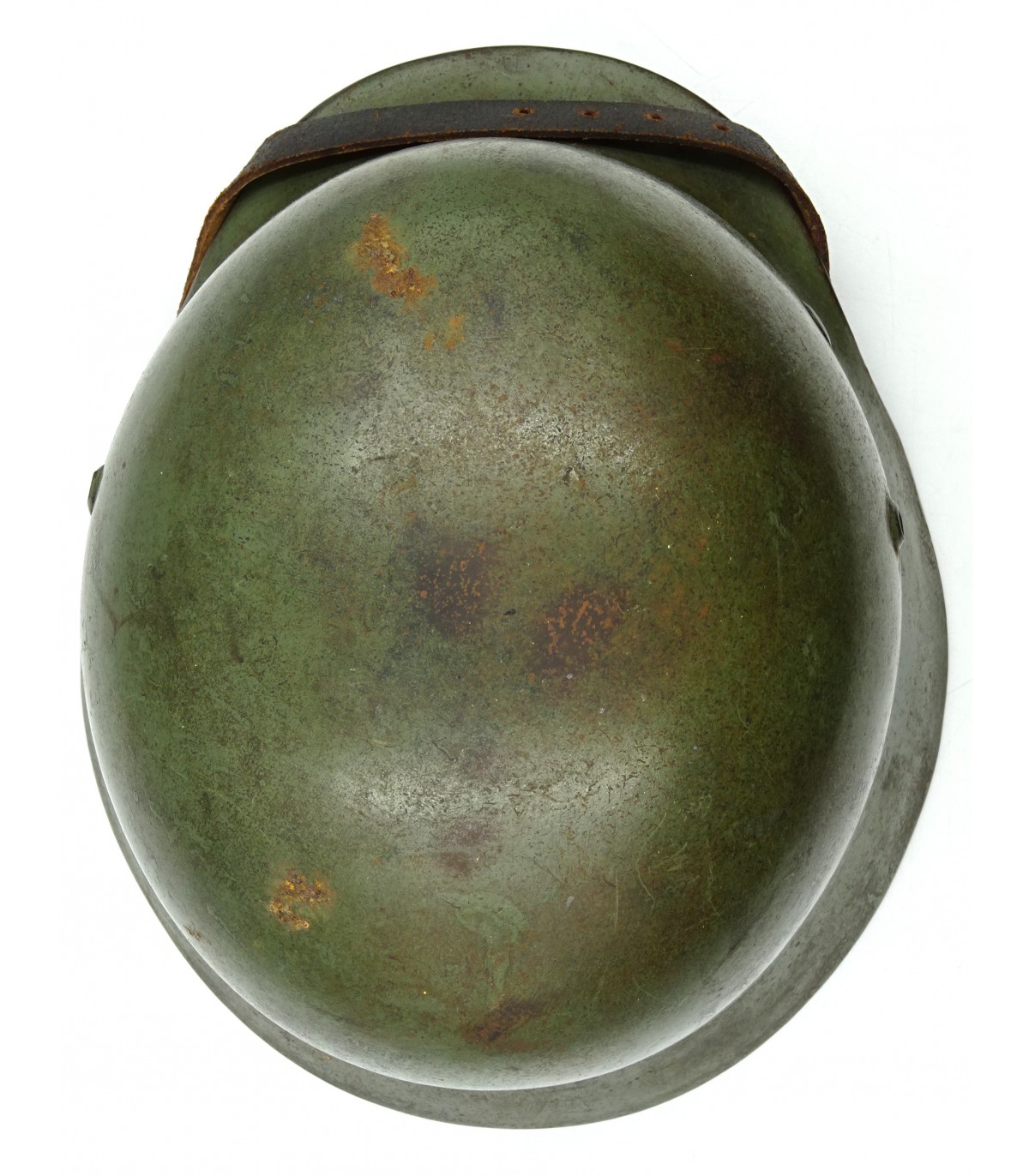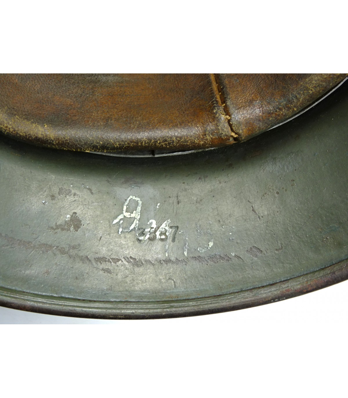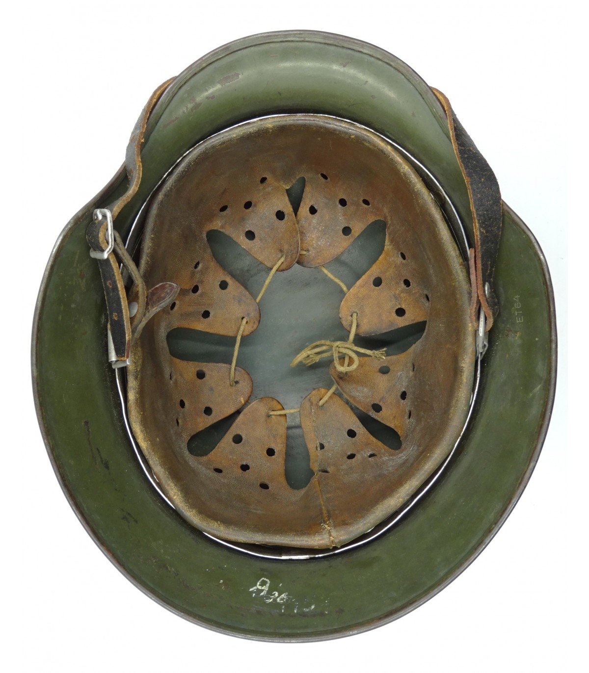 Complet. ET64, N°3587. Peinture vert-pomme à 90%, aigle à 98%, tricolore à près de 100%. Cerclage alu. Coiffe et jugulaire souples. Très beau casque en TBE.