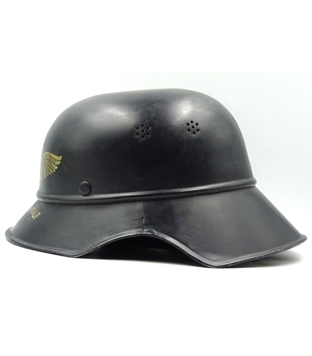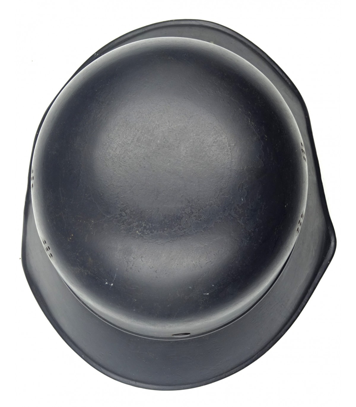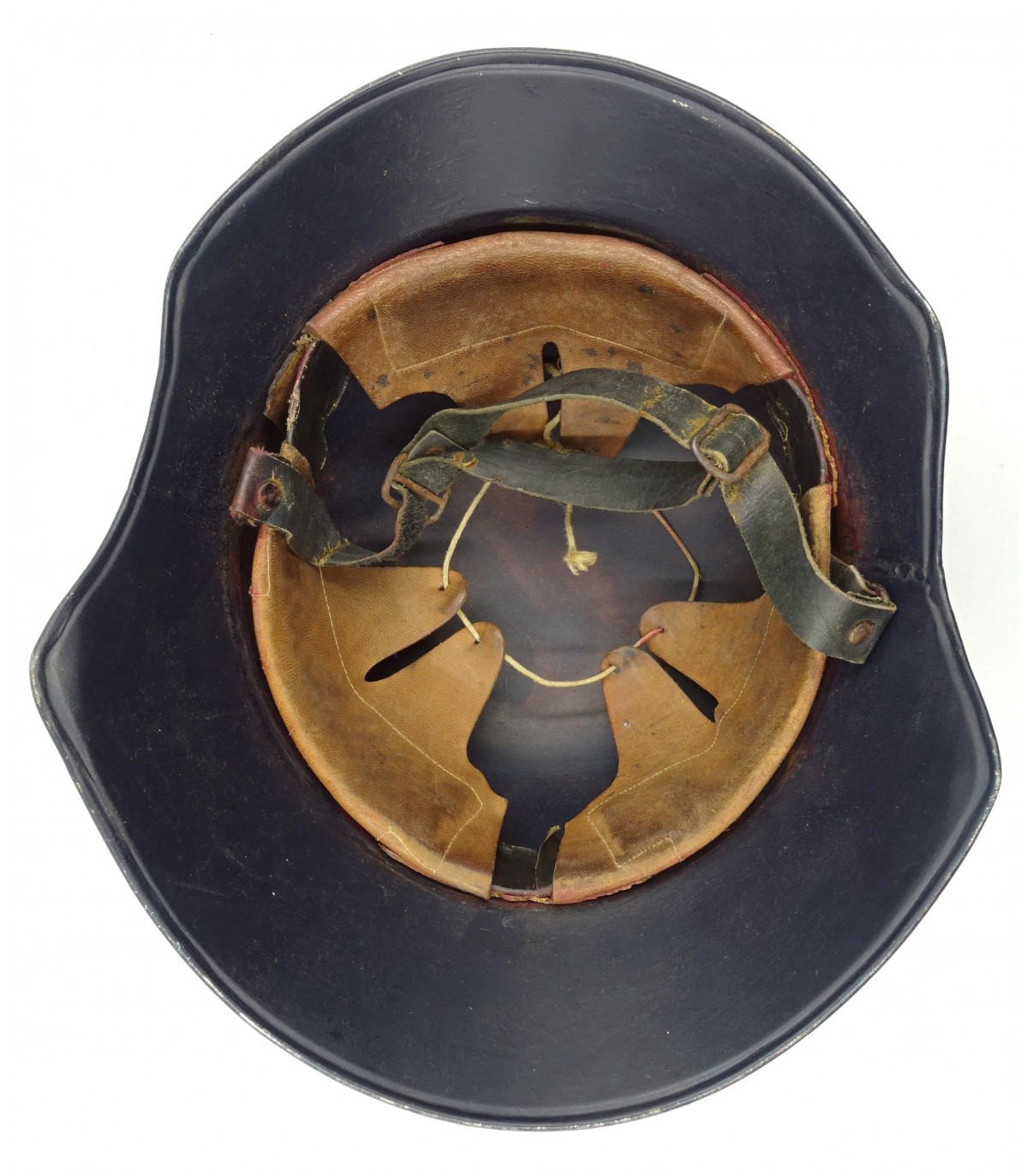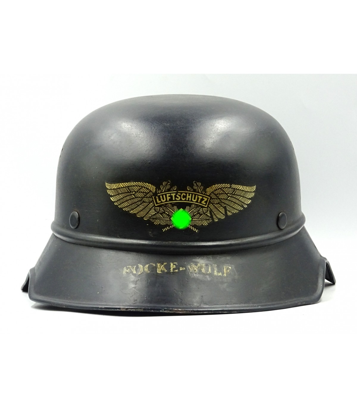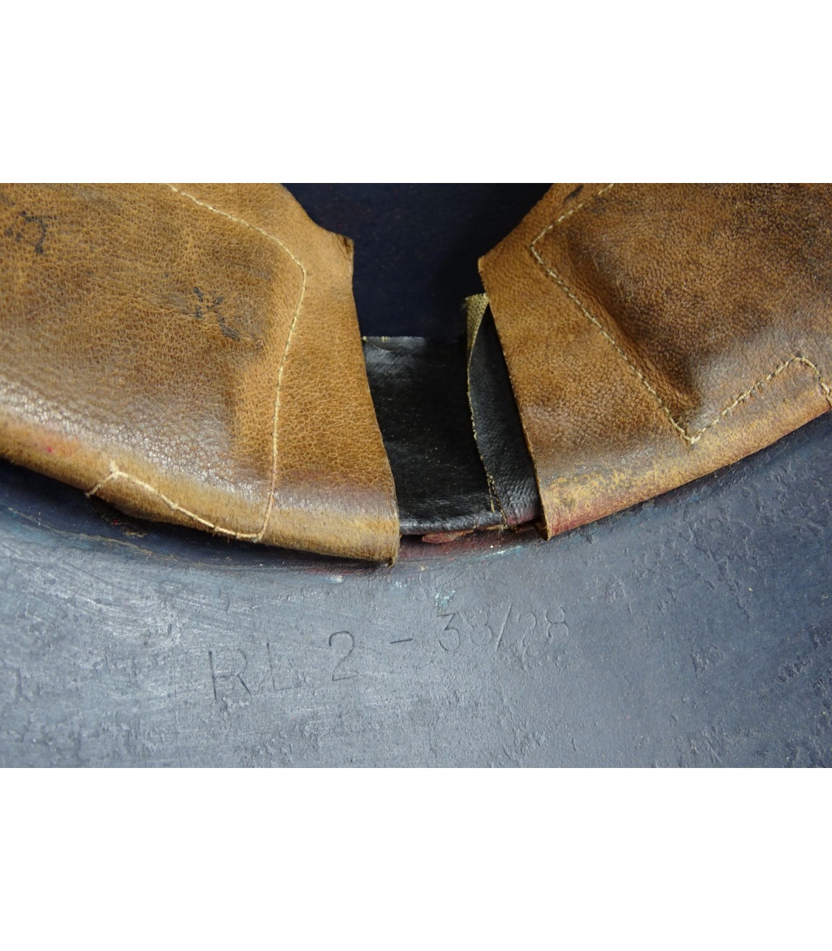 Forme gladiateur. Emblème frontal RLB à près de 98%, marquage Focke-Wulf sur la visière. Complet avec jugulaire et coiffe cuir. BE-TBE.