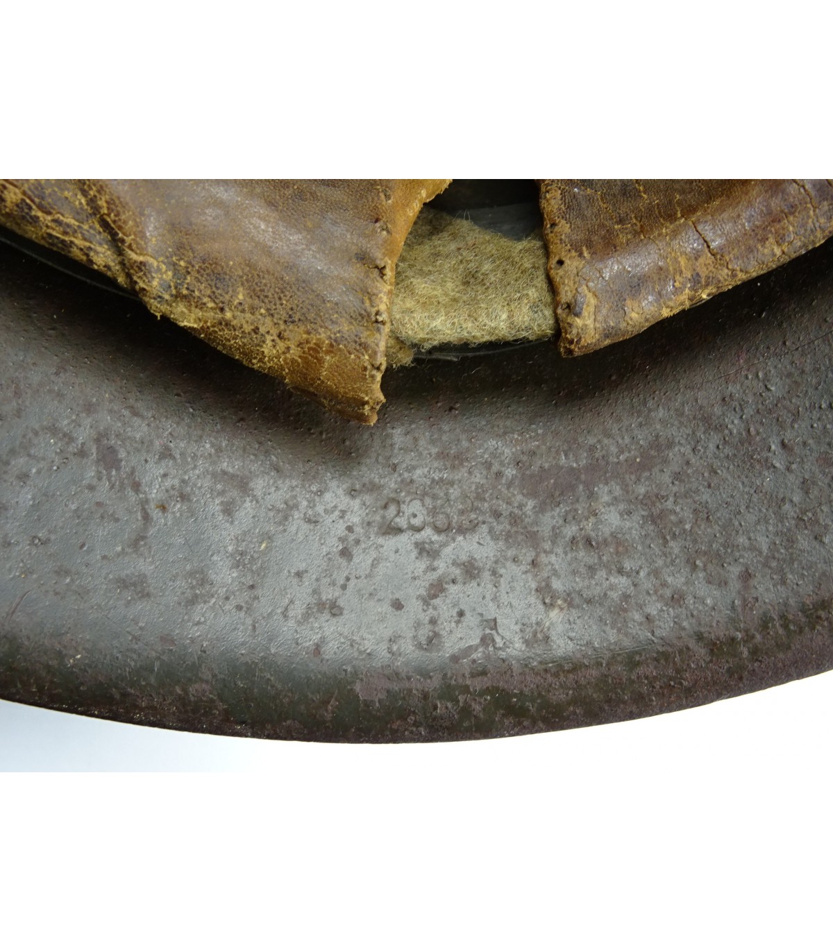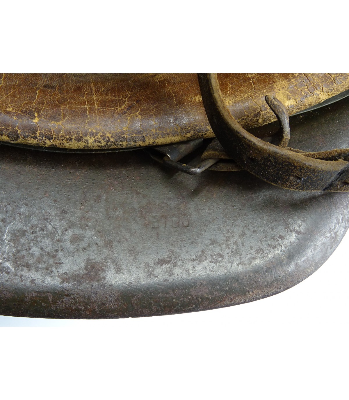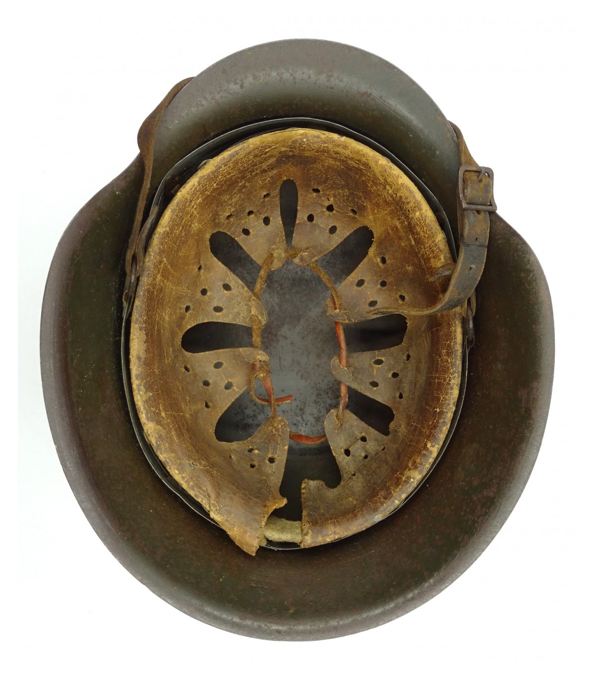 Complet. ET66 #2632. Peinture feldgrau à 90%, aigle WH à 70-75%. Coiffe cuir EM, jugulaire BE marquée. Bon casque 'dans son jus'. BE.