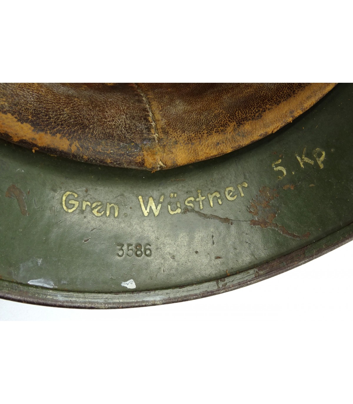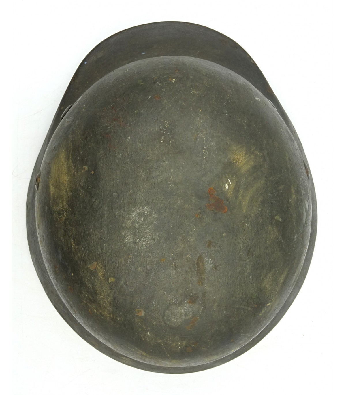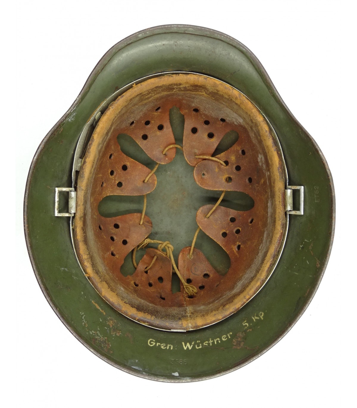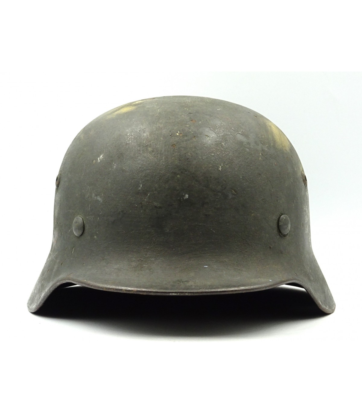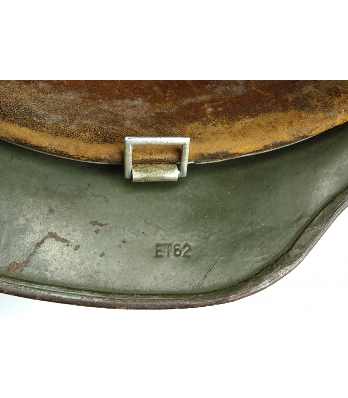 Complet sauf jugulaire. ET62 #3586. Cerclage alu, cuir de coiffe BE-. Ce casque a reçu une peinture réglementaire feldgrau mat qui a recouvert ses insignes, sauf la silhouette de l'aigle WH. BE.