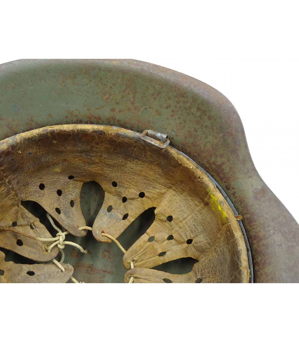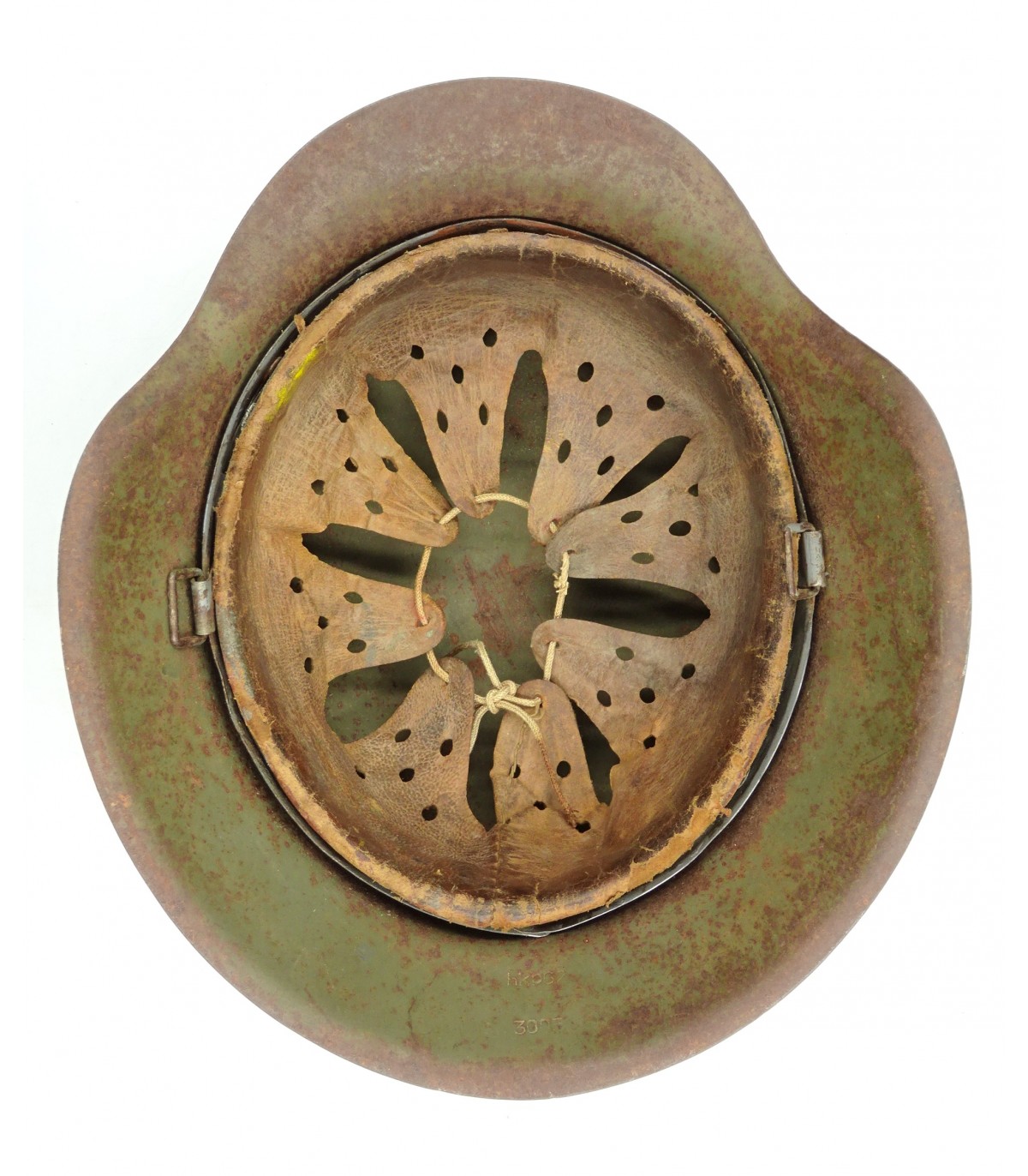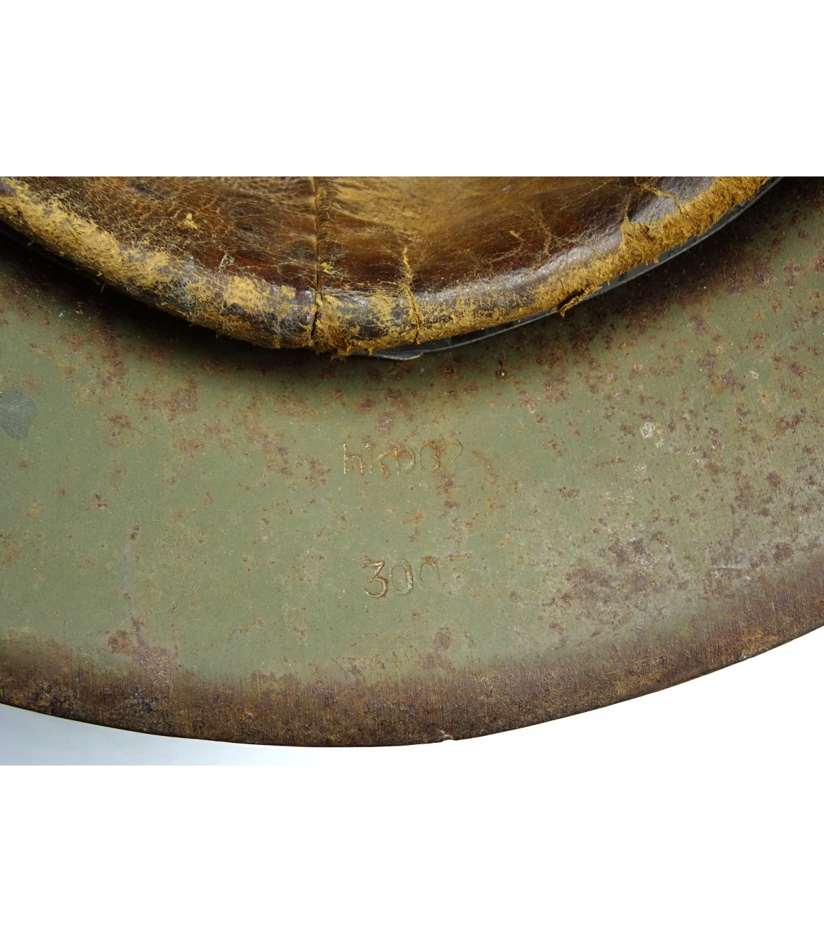 Complet sauf jugulaire. HKP62 #3005, taille 57. Peinture feldgrau à 90%. Cuir de coiffe souple. BE-.