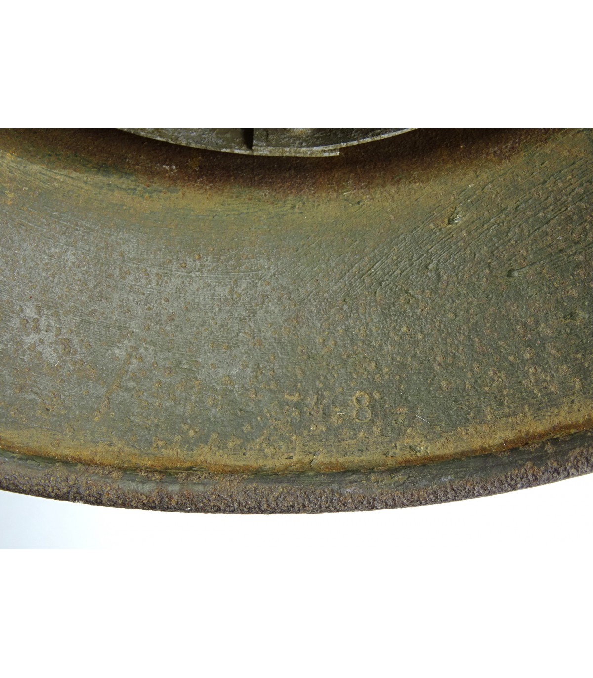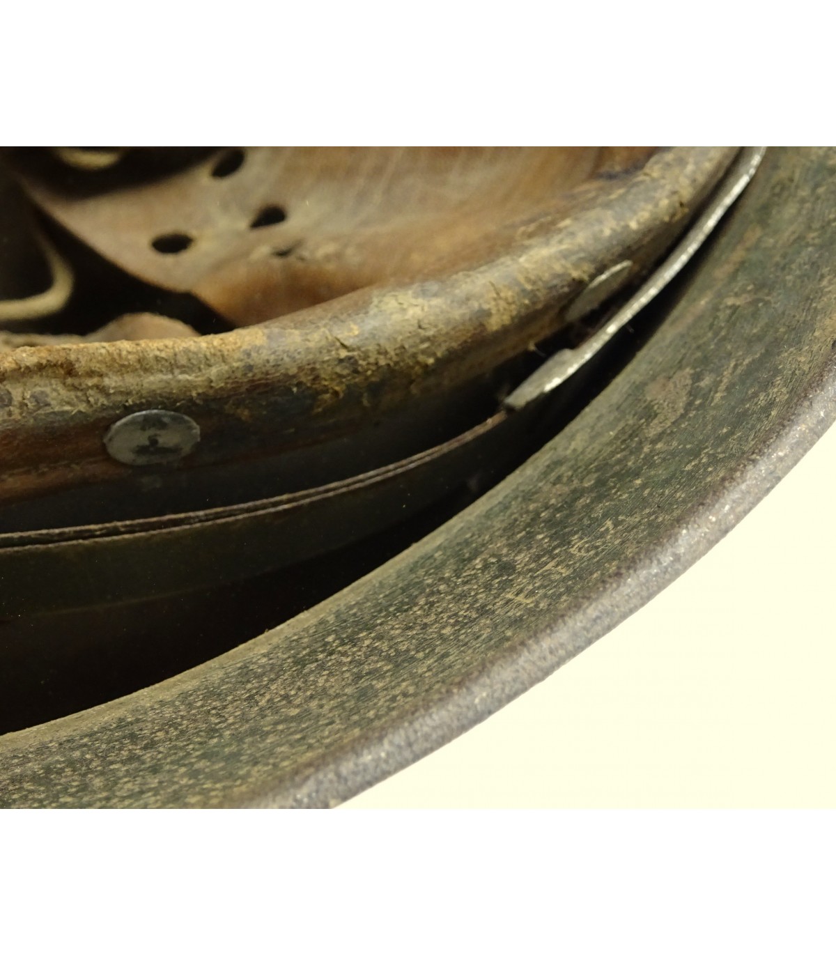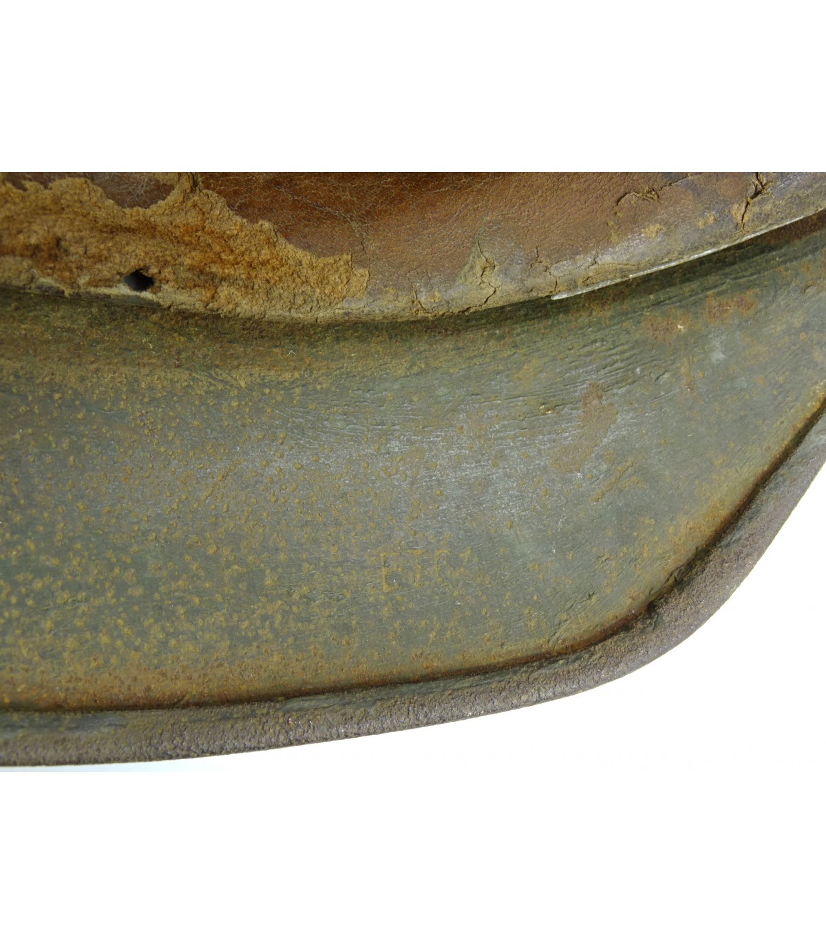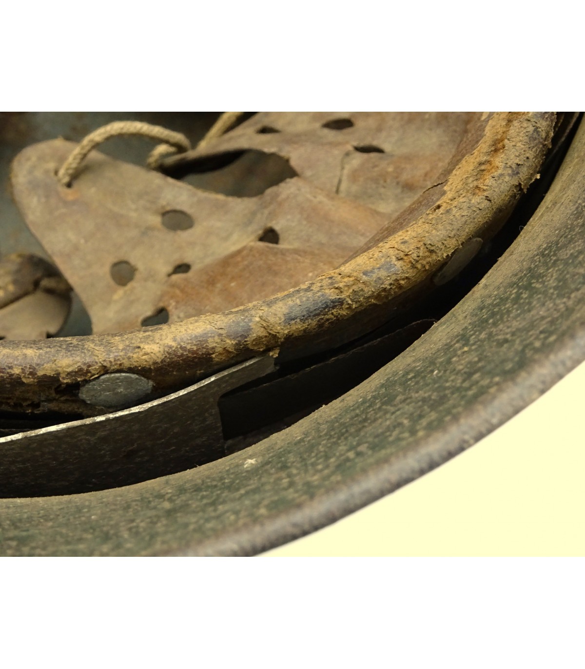 ET64; Jugulaire absente. Ce casque a reçu une peinture de camouflage feldgrau réglementaire qui a recouvert ses 2 insignes. Cerclage alu, un boucleteau absent. Peinture à 60-70%. EM
