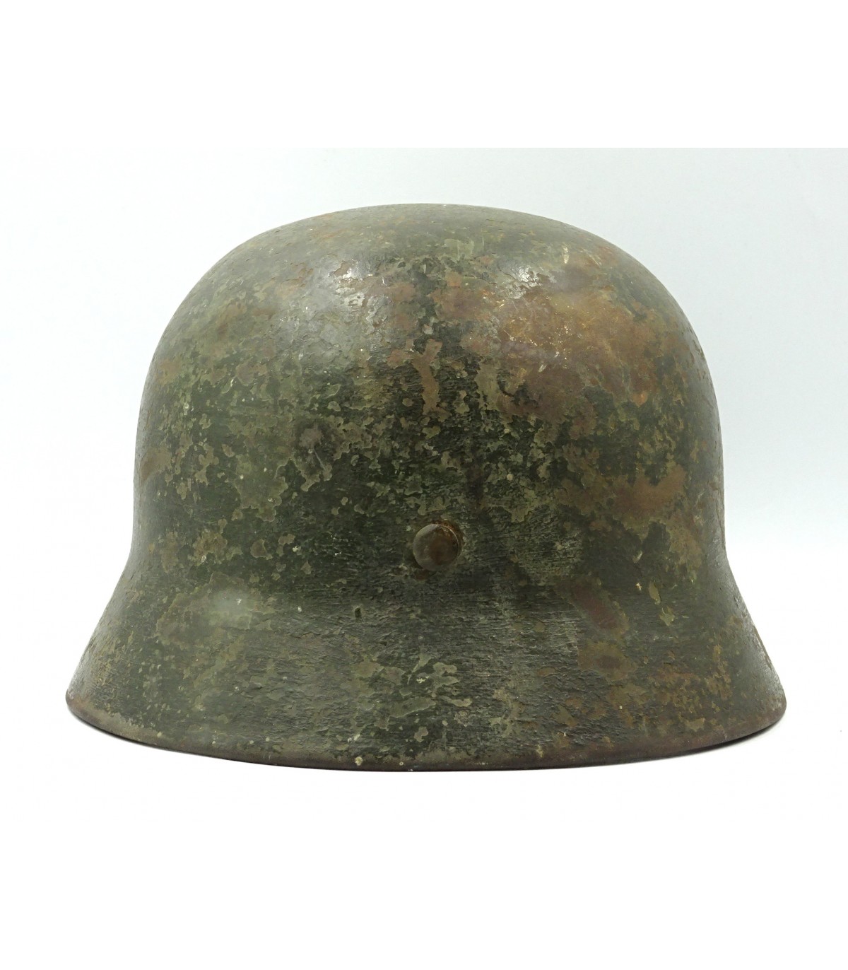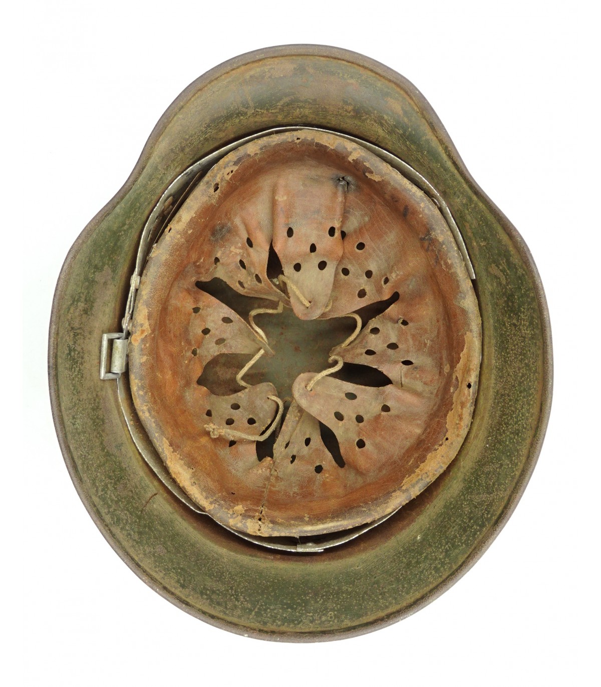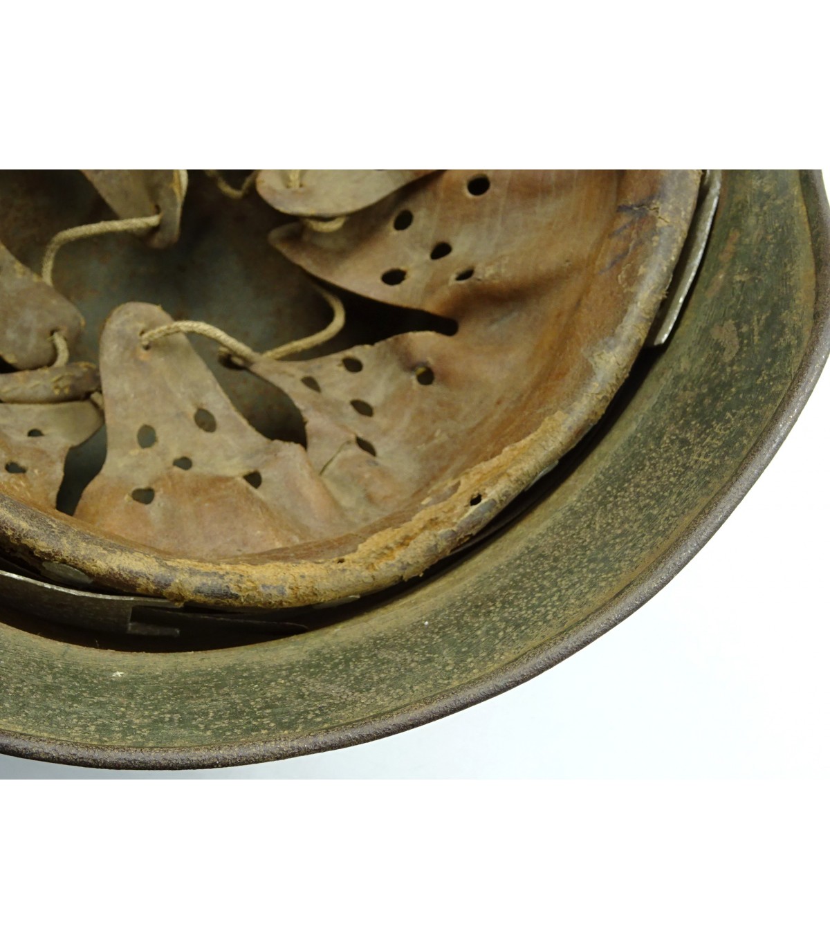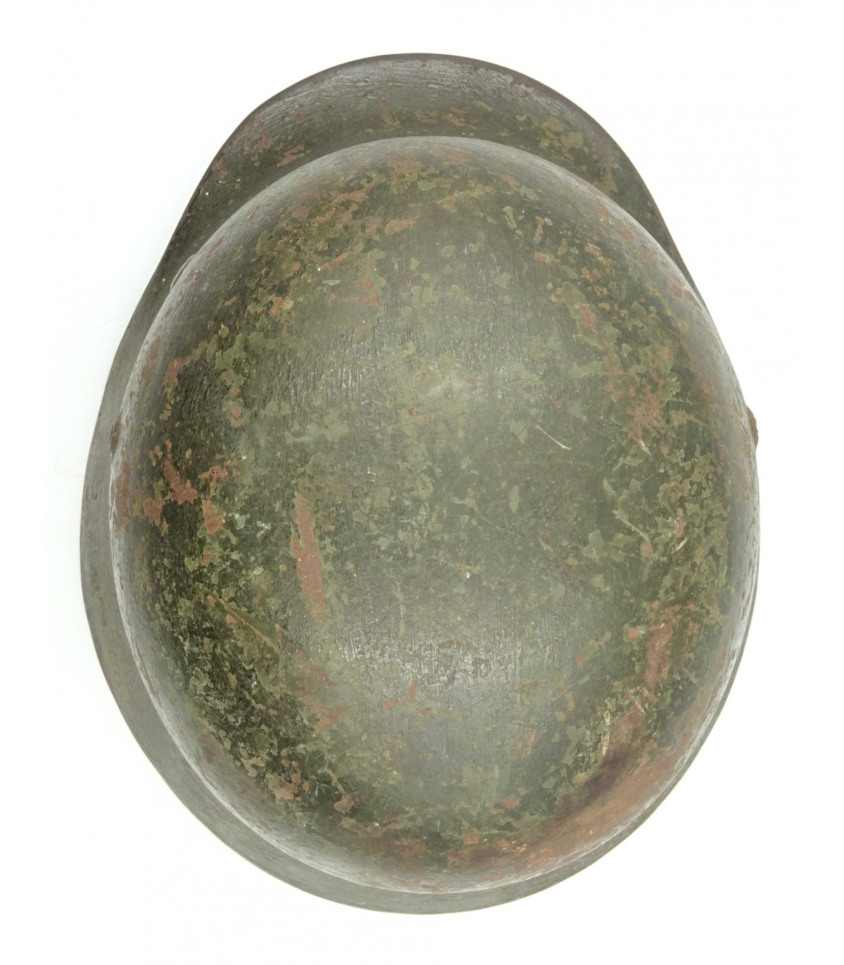 ET64; Jugulaire absente. Ce casque a reçu une peinture de camouflage feldgrau réglementaire qui a recouvert ses 2 insignes. Cerclage alu, un boucleteau absent. Peinture à 60-70%. EM