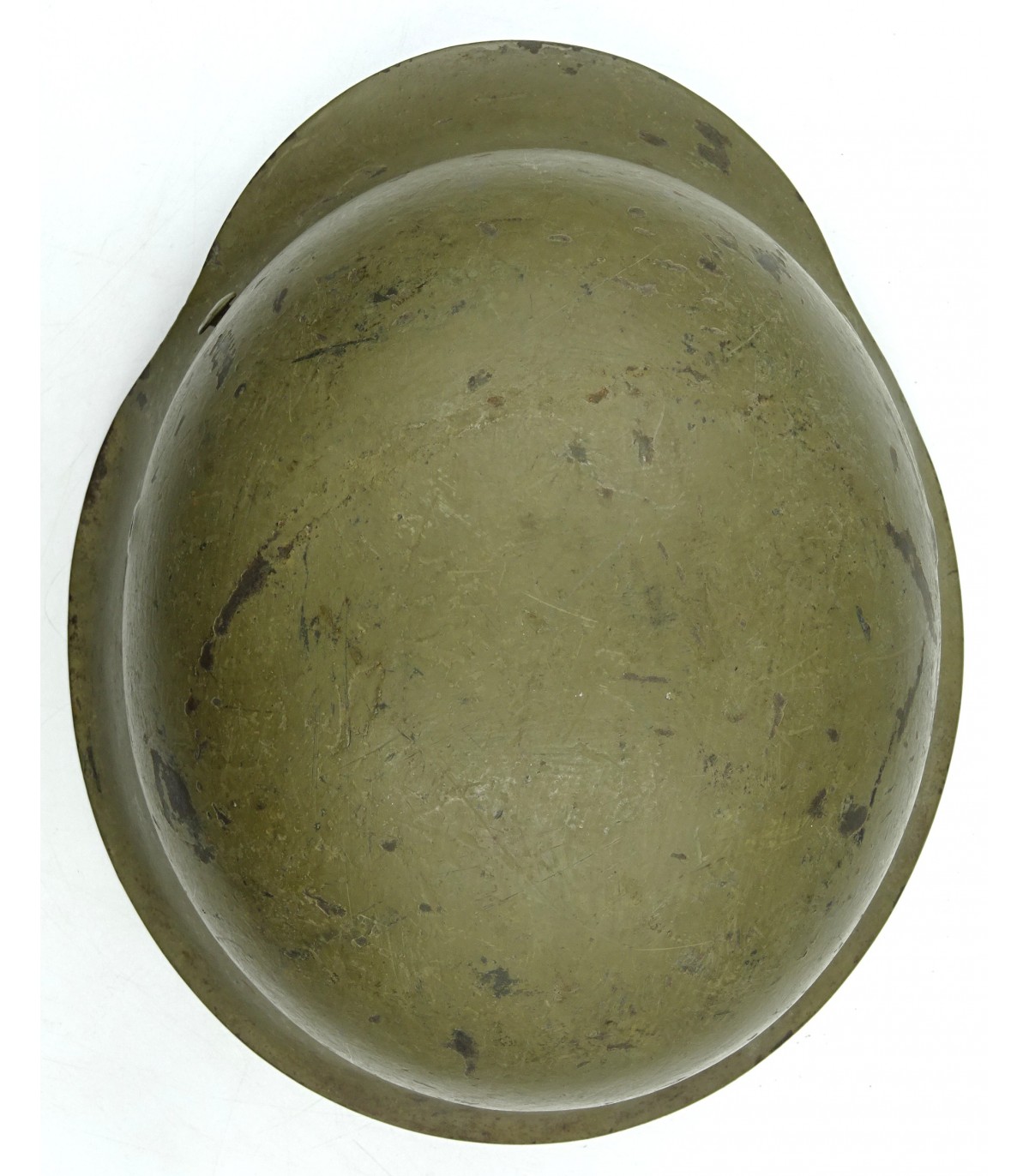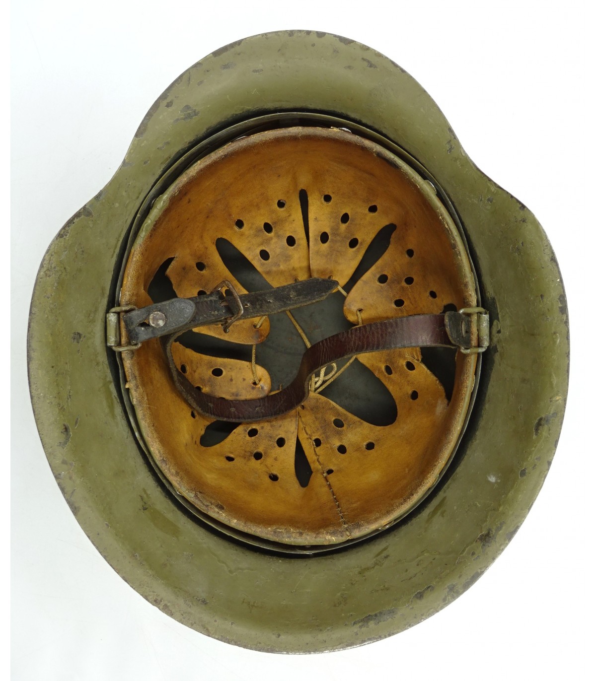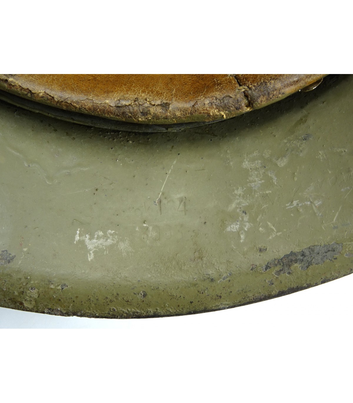 Complet. Ckl 64 #3003, taille 57. Camouflage vert-olive à 90%, aigle à 60-70%. Coiffe cuir à 90%, jugulaire datée 1940. Le fond de la coque, qui n'est pas camouflé, comporte son tampon ovale Abgenommen.. BE.