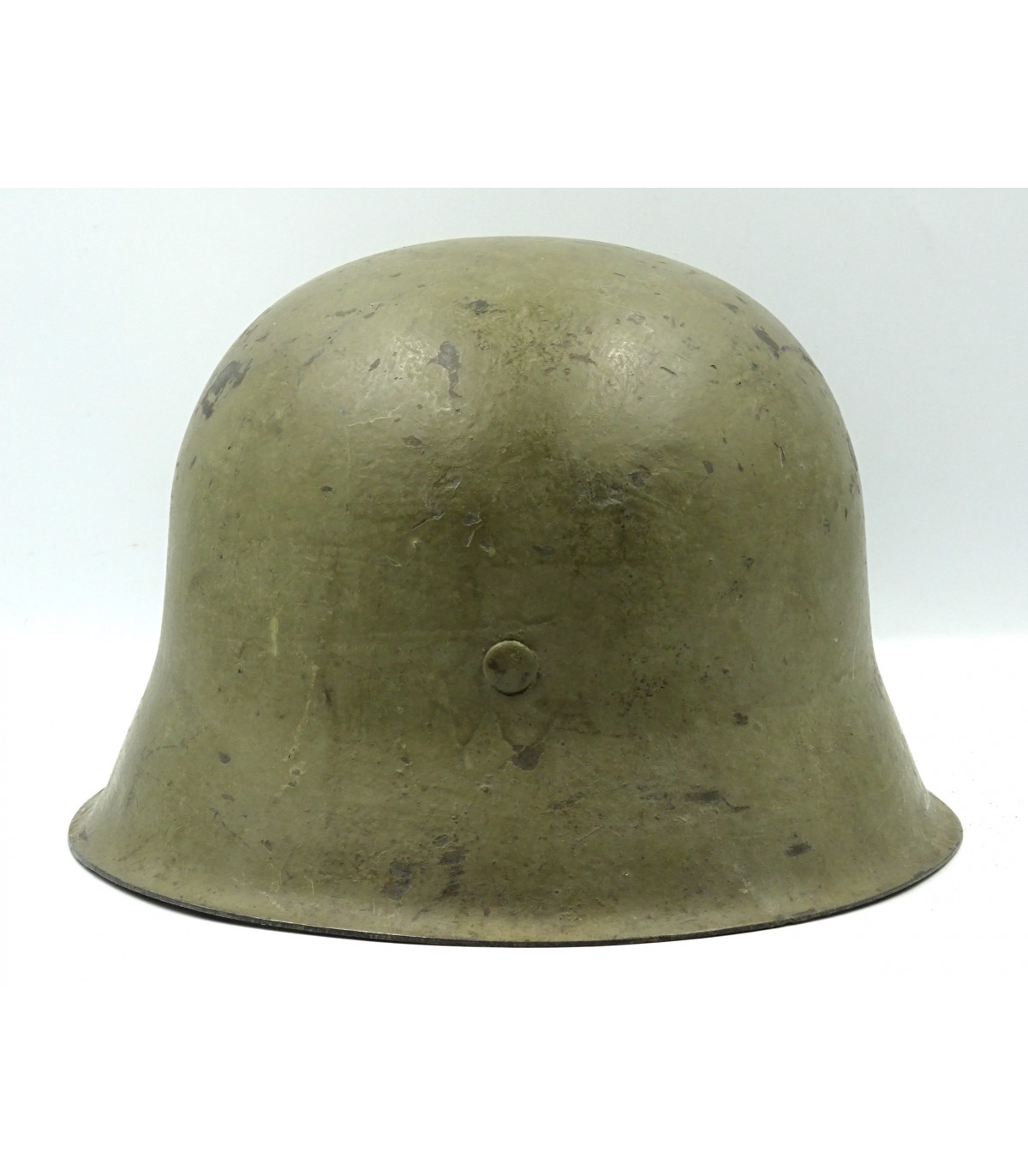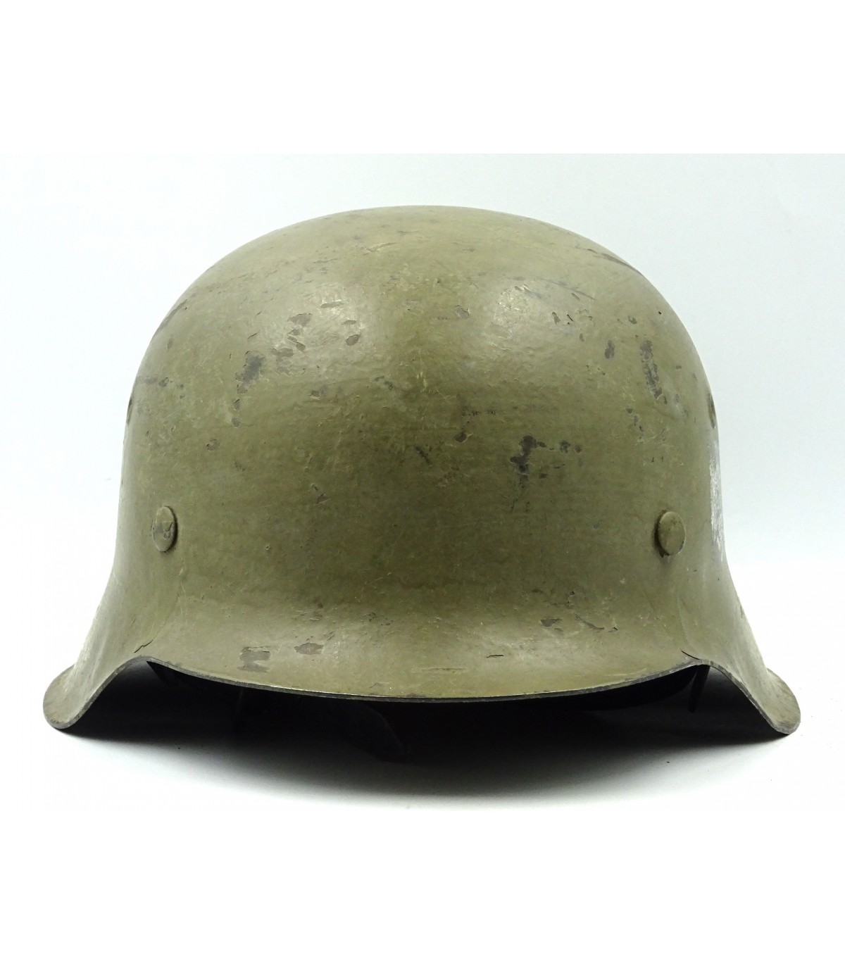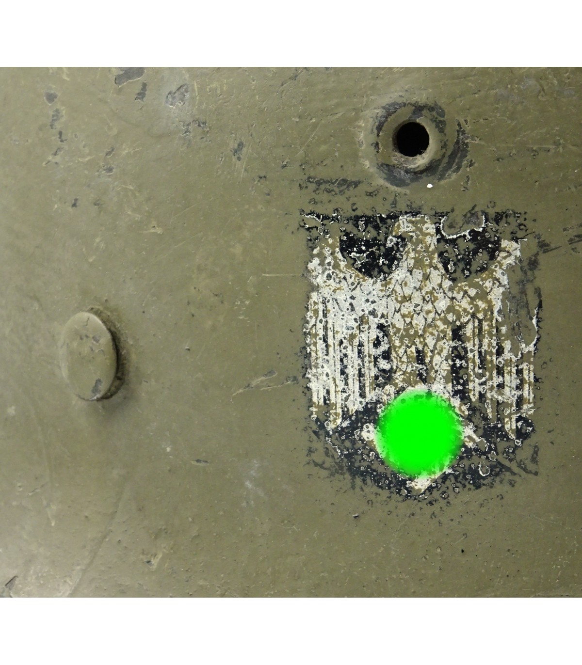 Complet. Ckl 64 #3003, taille 57. Camouflage vert-olive à 90%, aigle à 60-70%. Coiffe cuir à 90%, jugulaire datée 1940. Le fond de la coque, qui n'est pas camouflé, comporte son tampon ovale Abgenommen.. BE.