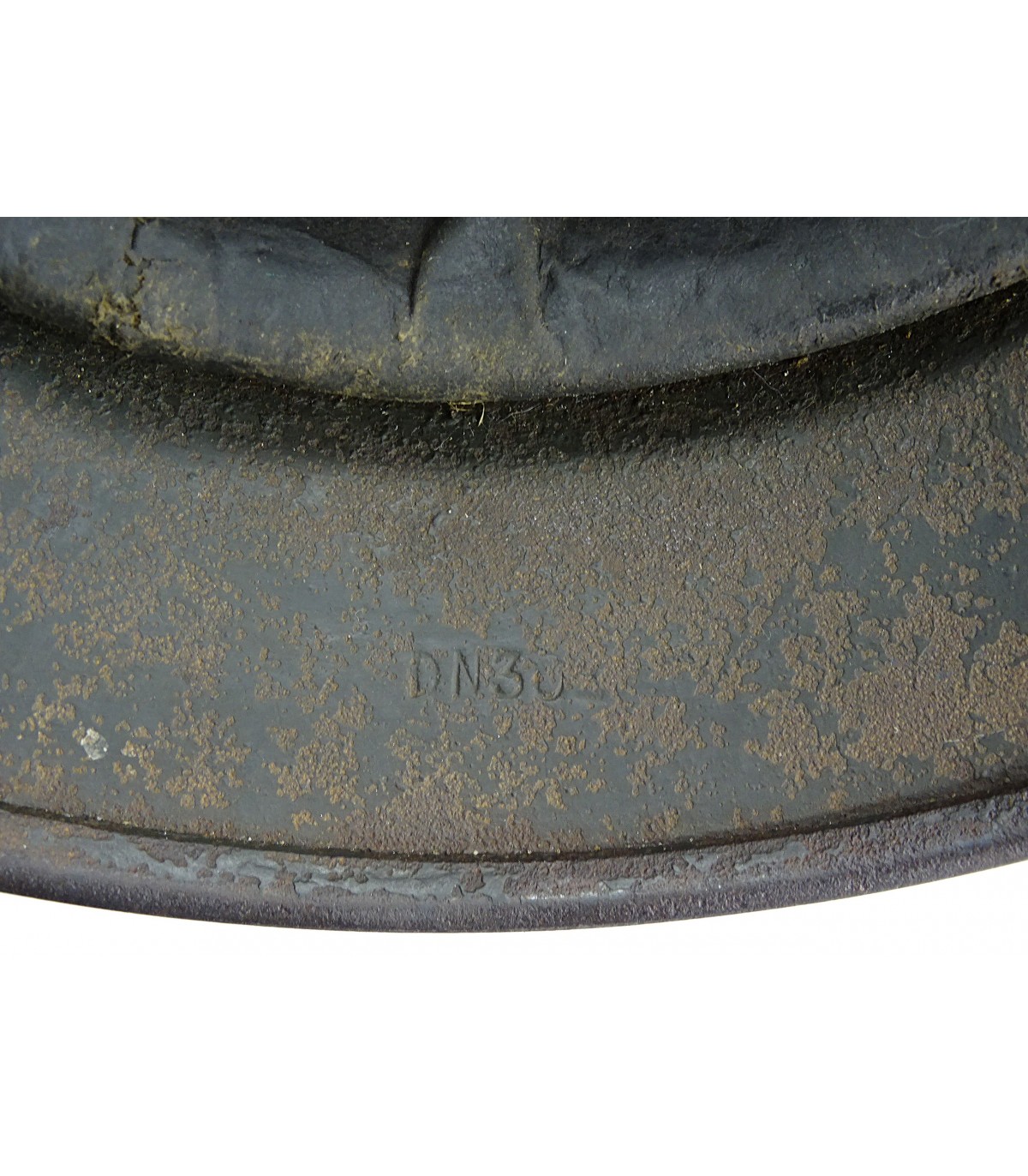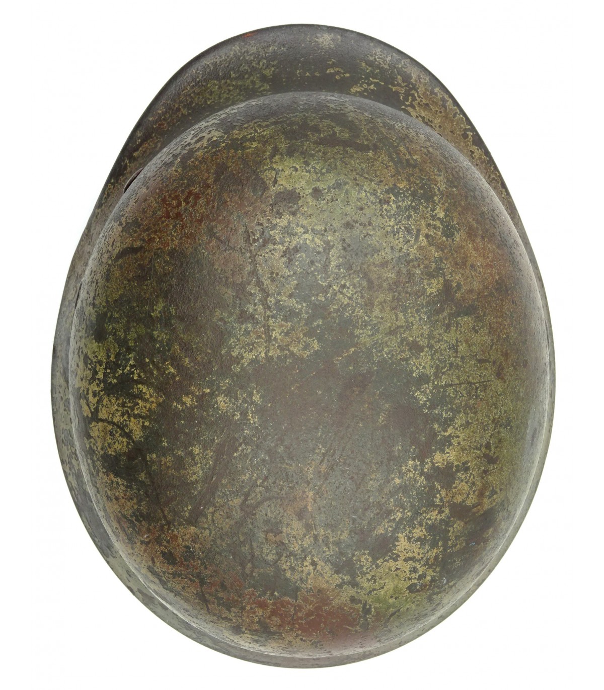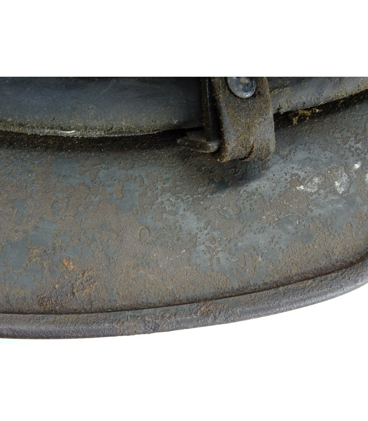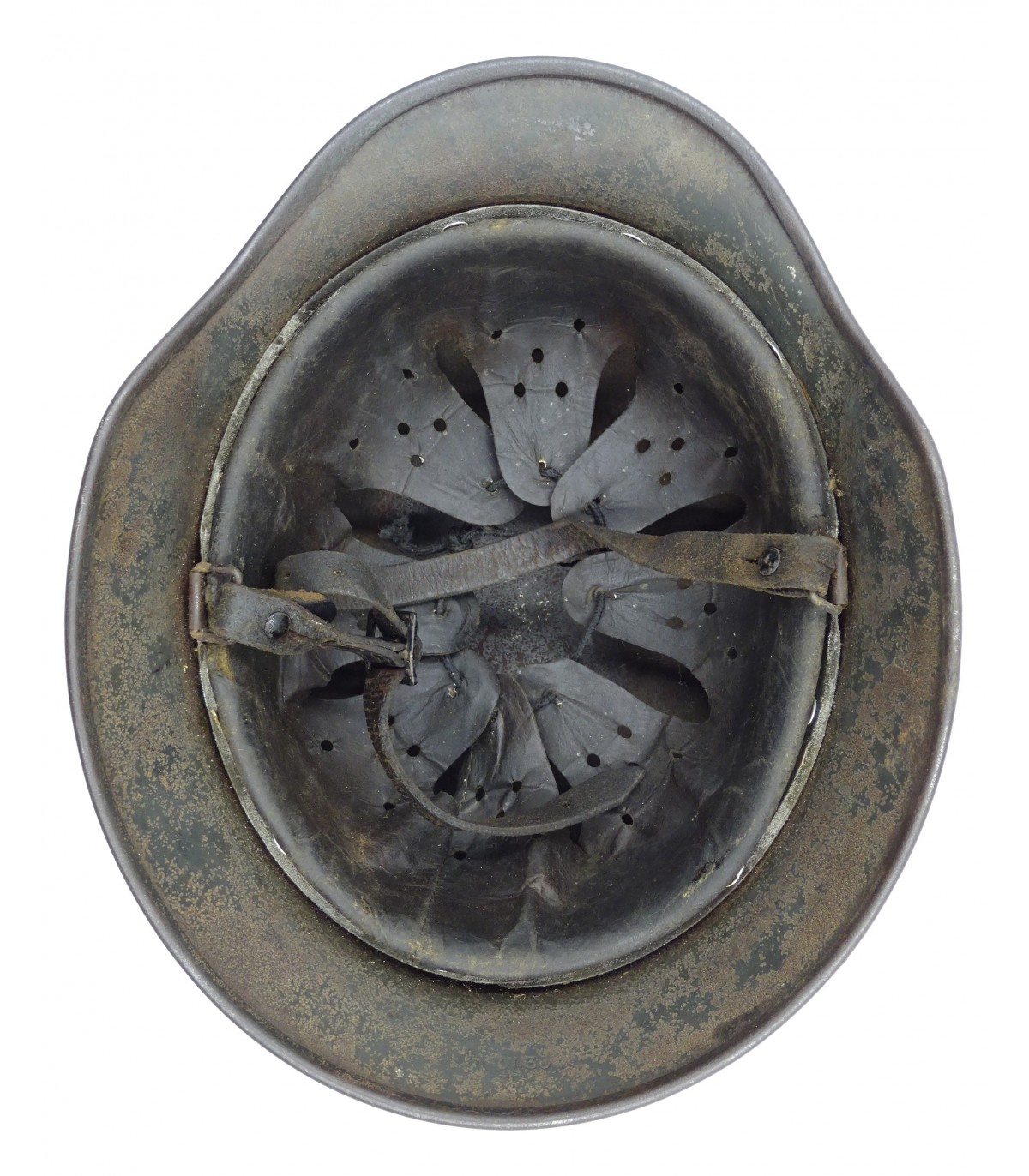 Complet. Q64, #DN302 (?). Jugulaire et coiffe cuir huilées car assez foncées. Camouflage 3 tons type Normandie, marron, vert et sable à 70%. Bon casque de combat camouflé en 44. BE-.