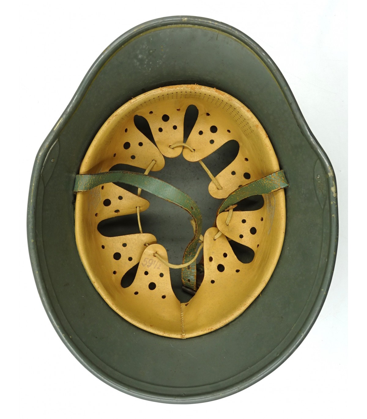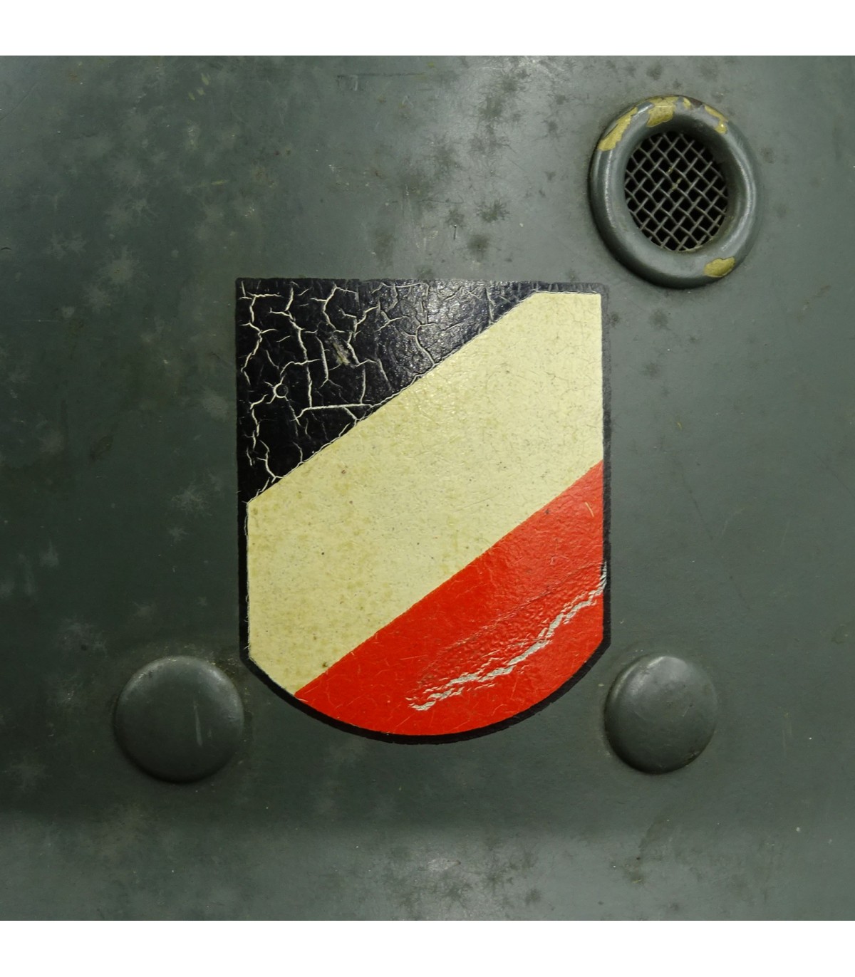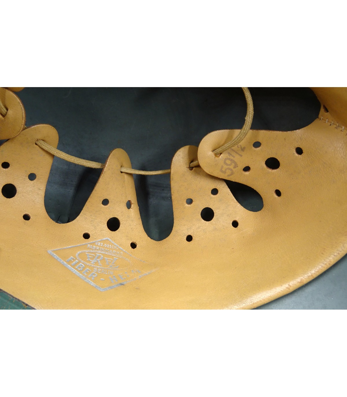 Complet. Belle peinture feldgrau à près de 100%. Jonc métallique. Taille 59 1/2. Beau marquage argent 'Erel Fiber-Helm'. Fibre vulcanisée. Aigle WH à 90%, écusson tricolore à près de 100%. Assez rare. TBE.