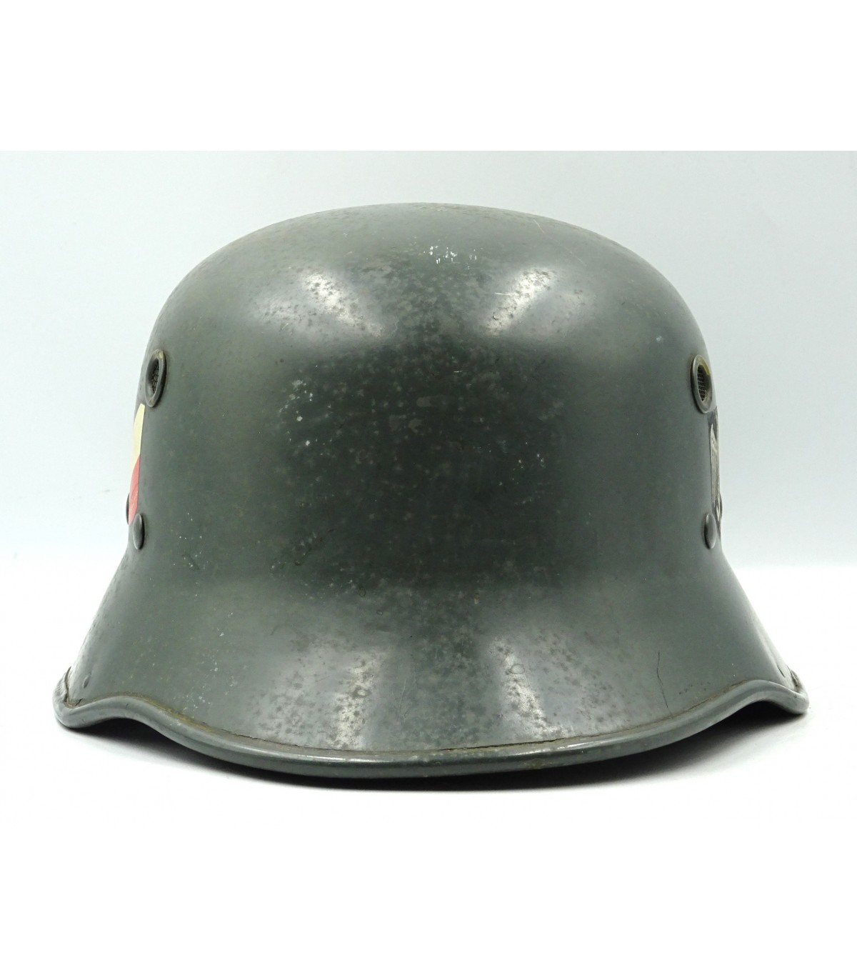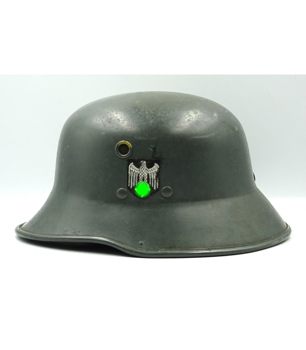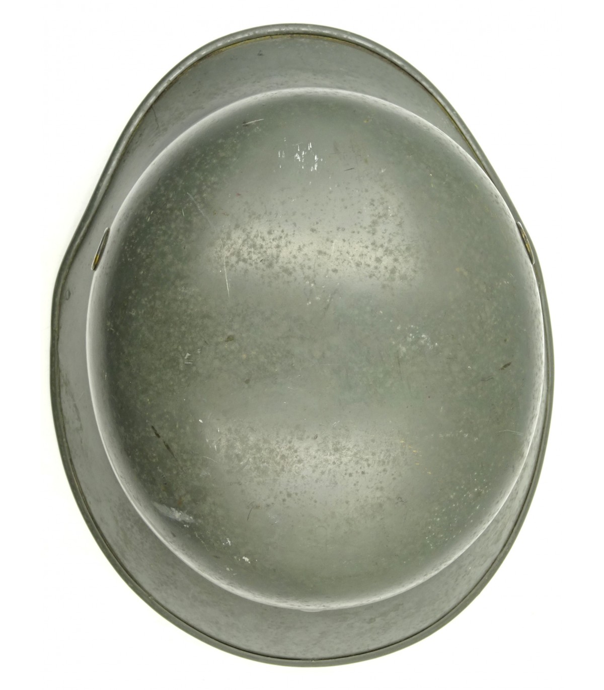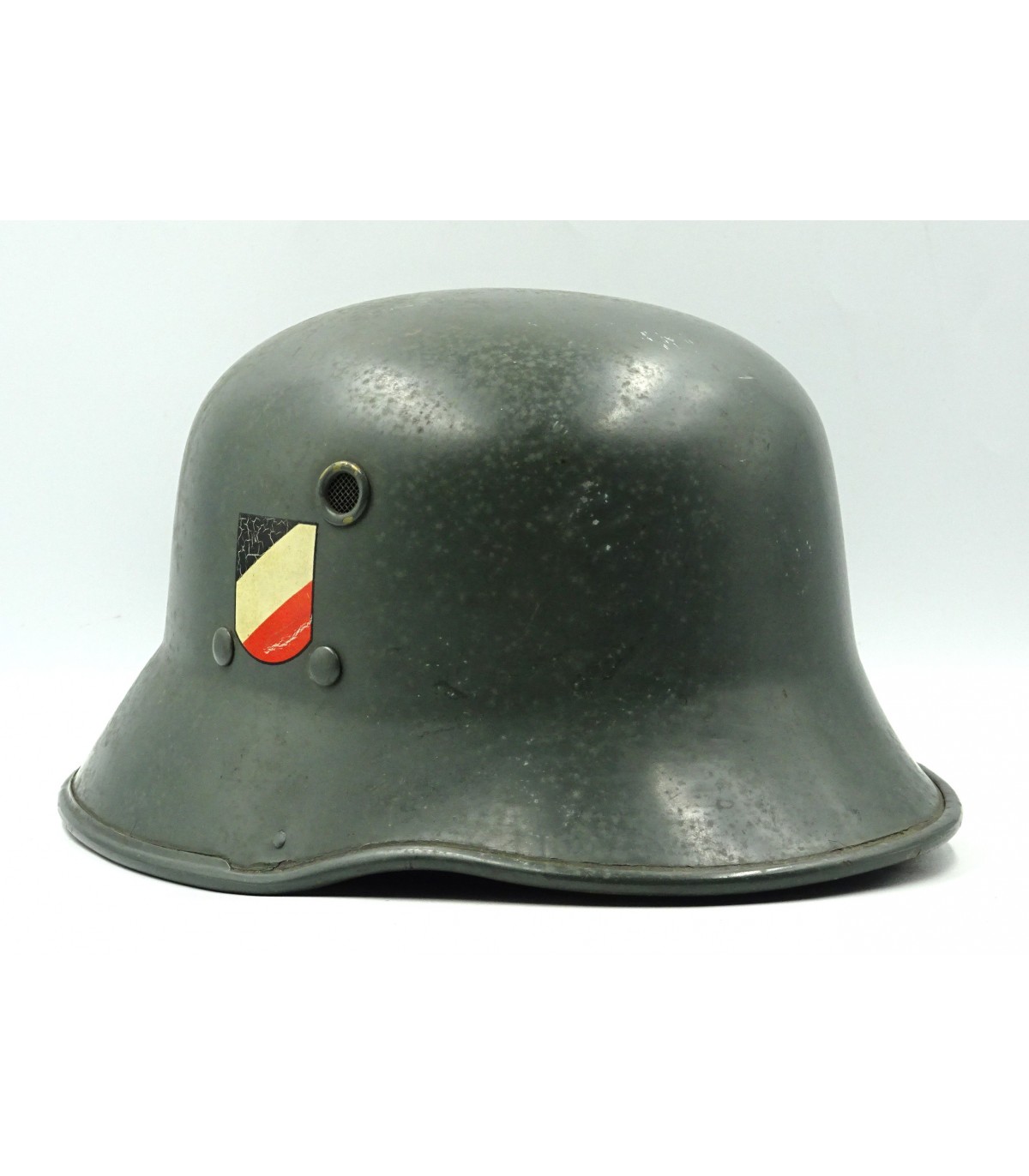 Complet. Belle peinture feldgrau à près de 100%. Jonc métallique. Taille 59 1/2. Beau marquage argent 'Erel Fiber-Helm'. Fibre vulcanisée. Aigle WH à 90%, écusson tricolore à près de 100%. Assez rare. TBE.