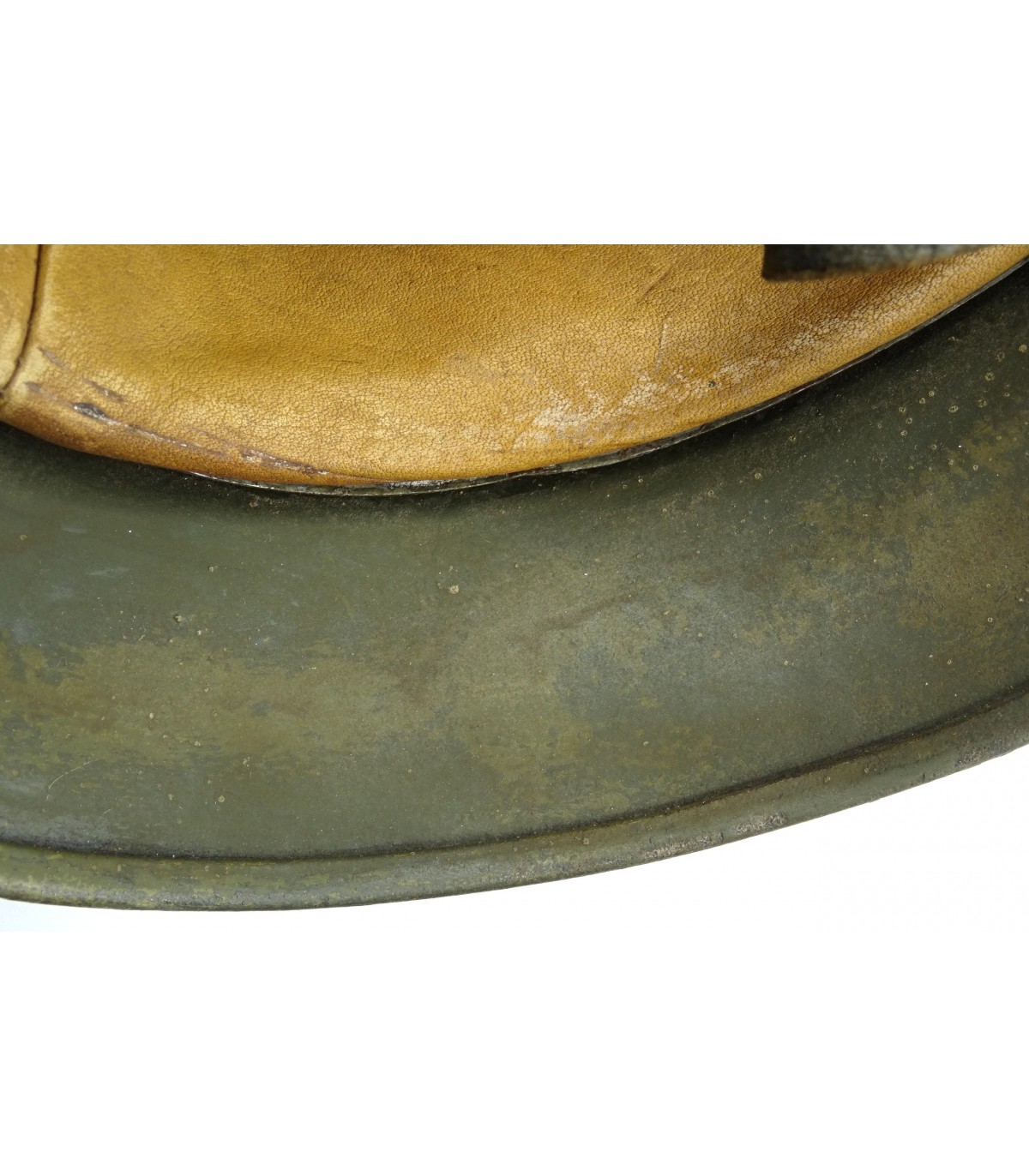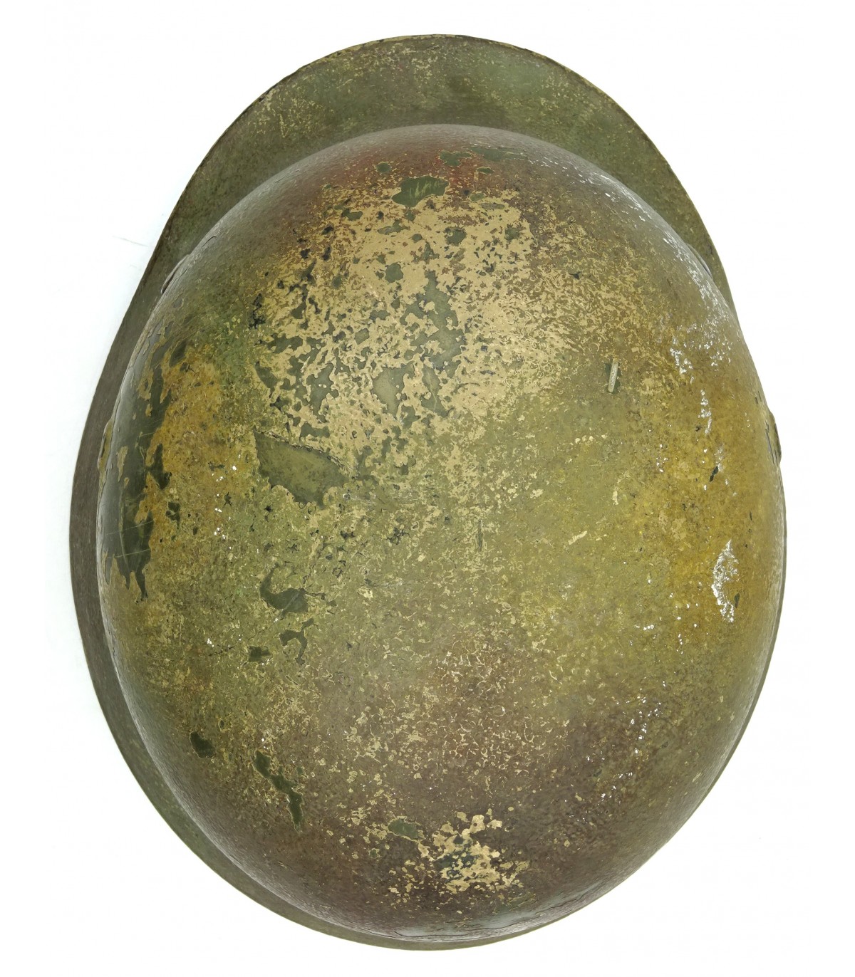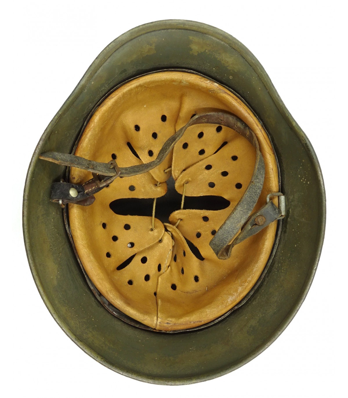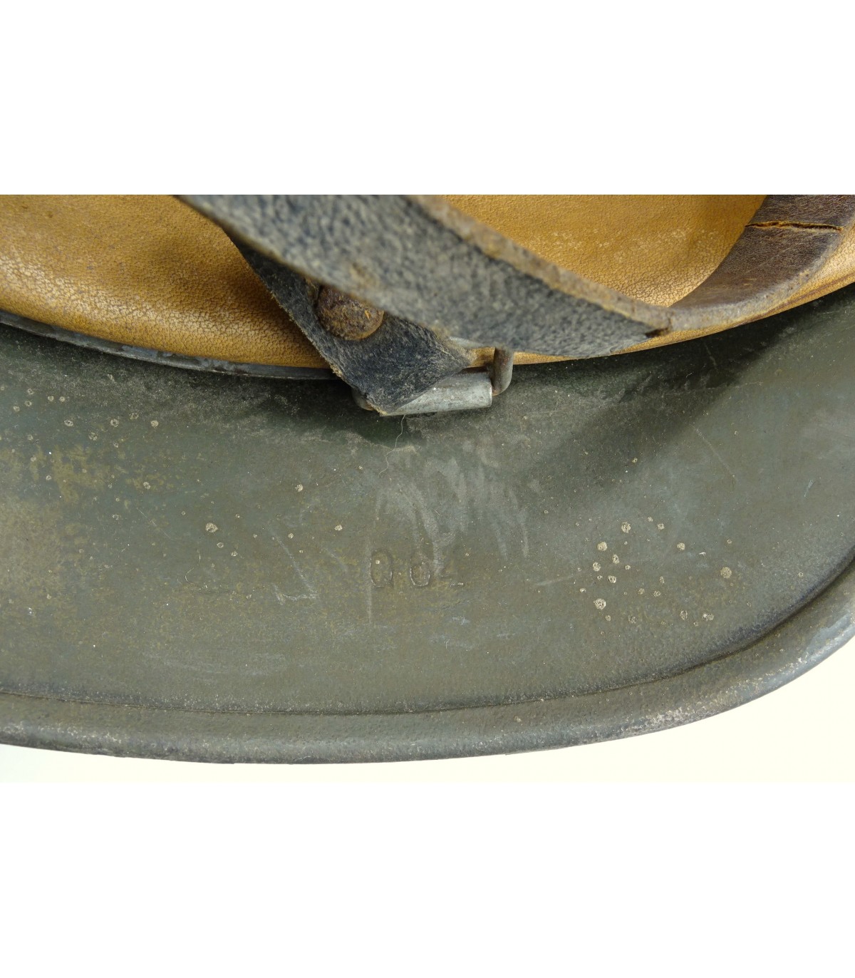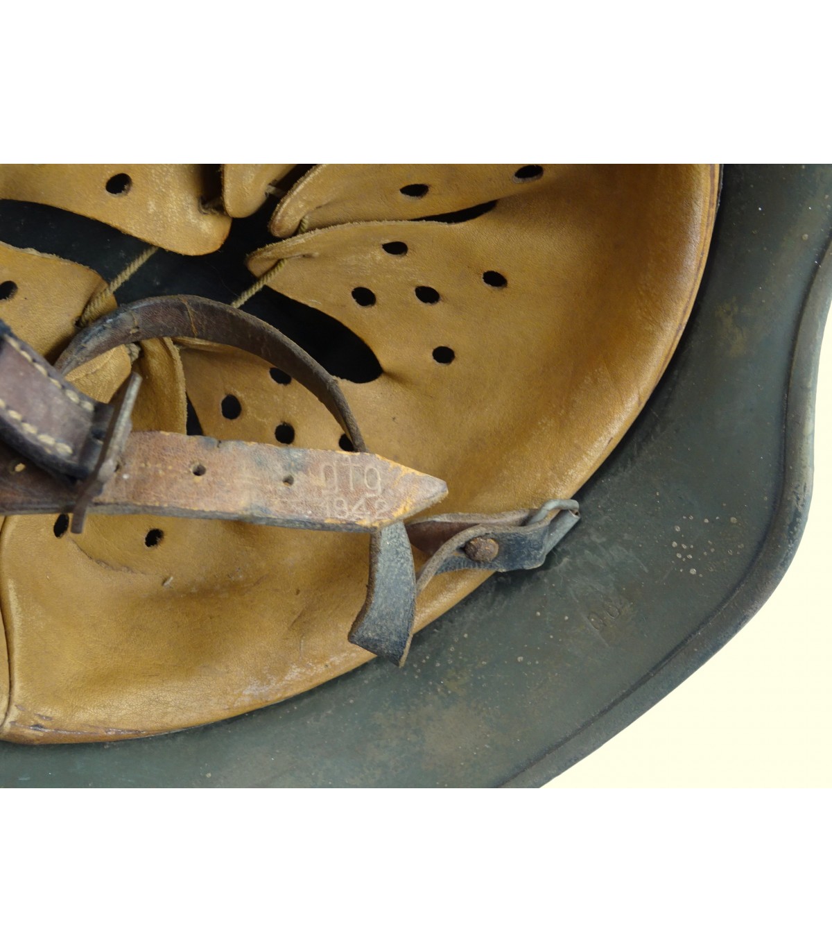 Q64, #6740. Complet. Taille 57. Peinture de camouflage 3 tons appliquée au pistolet, sable, marron et vert, à 95%. Cuir de coiffe souple et clair. Superbe casque 'Normandie' en TBE.
