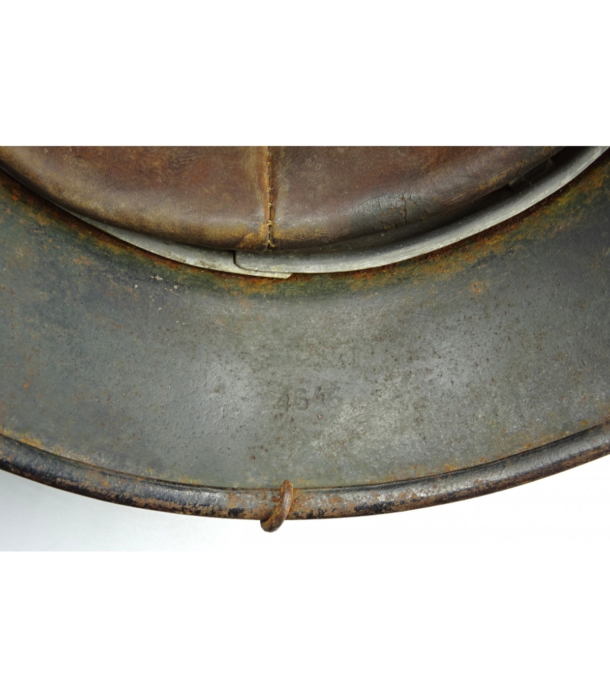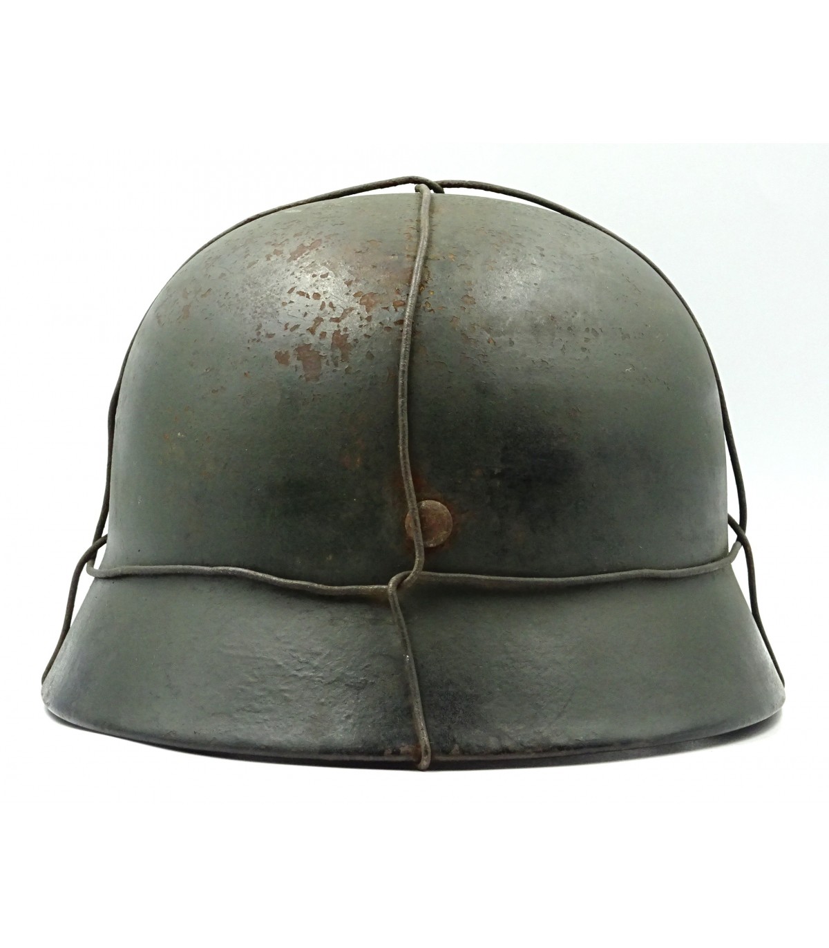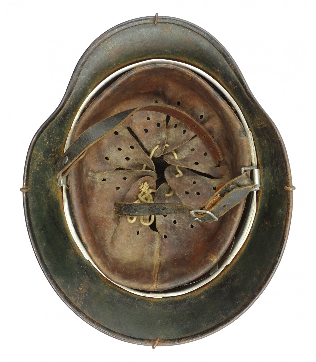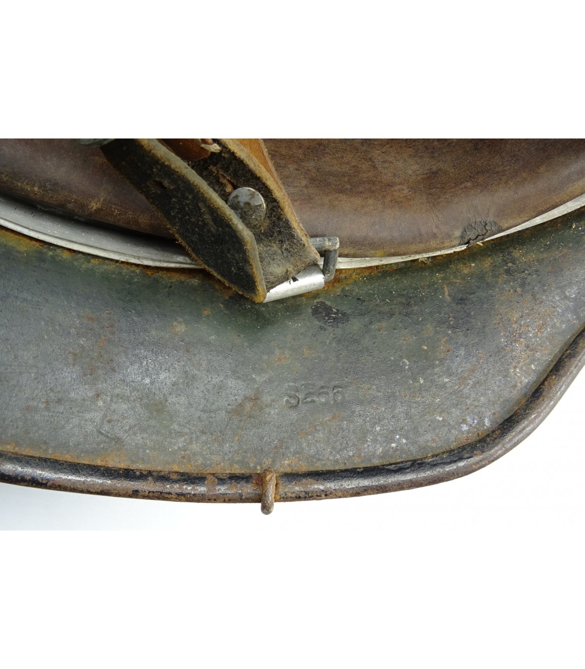 Complet. SE66, #4645. Cerclage de coiffe alu, boucleteau de jugulaire alu (jugulaire cassée et complète). Peinture de camouflage feldgrau à 95% et fil de fer de fixation de feuillage. Cuir de coiffe intact et assez souple. BE-TBE.