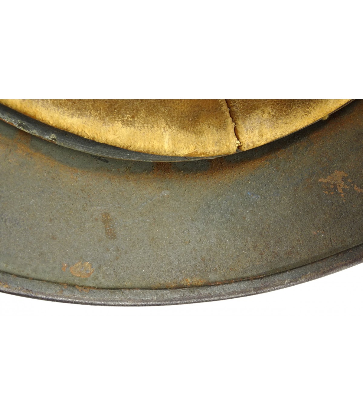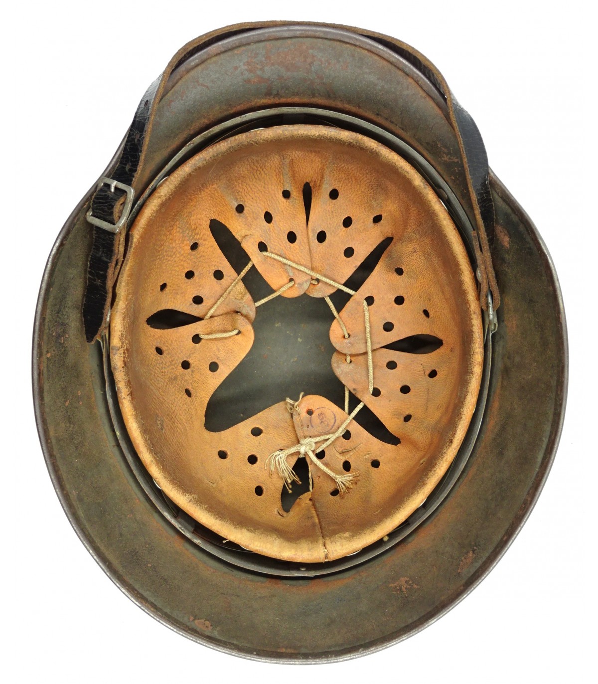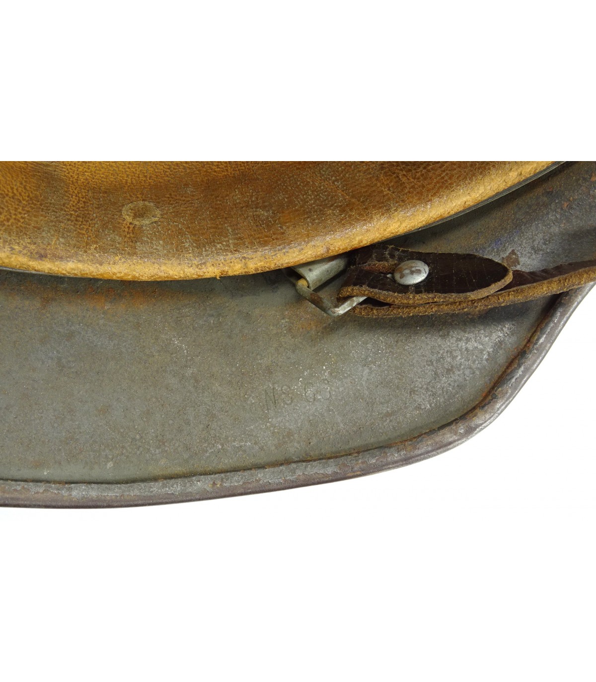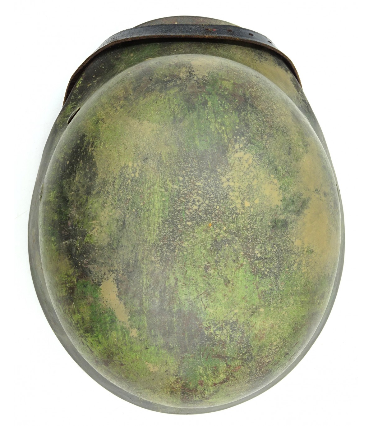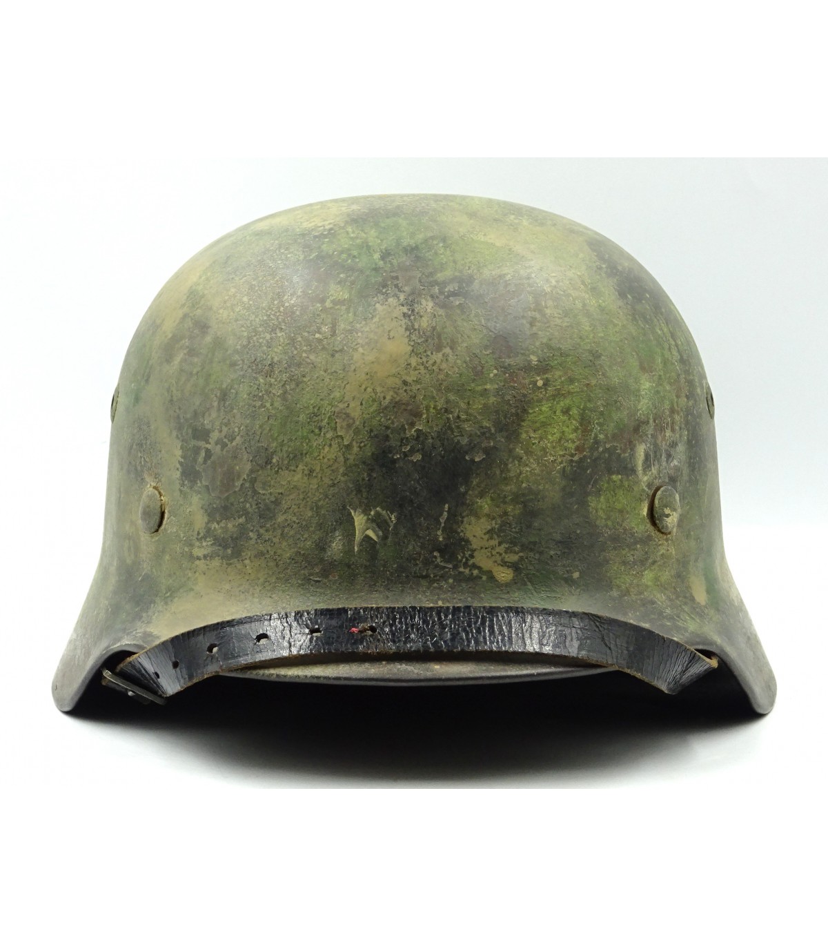 Complet. NS66, #D23, taille 58. Peinture camouflée sable et vert sur fond feldgrau à 70%. Jugulaire marquée 43. Coiffe cuir clair et souple. BE.