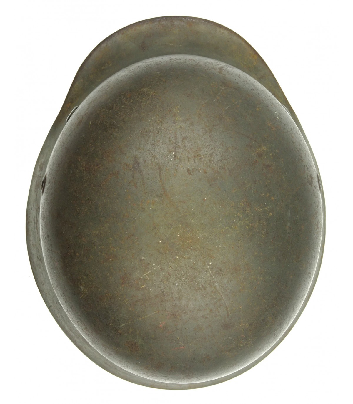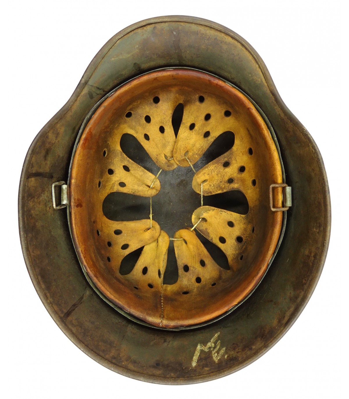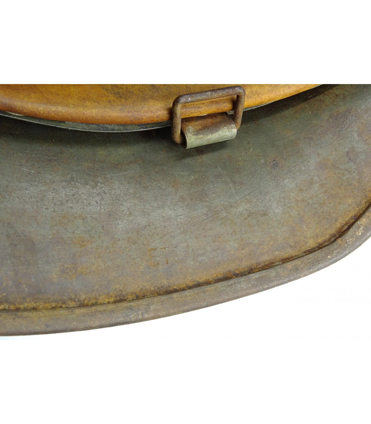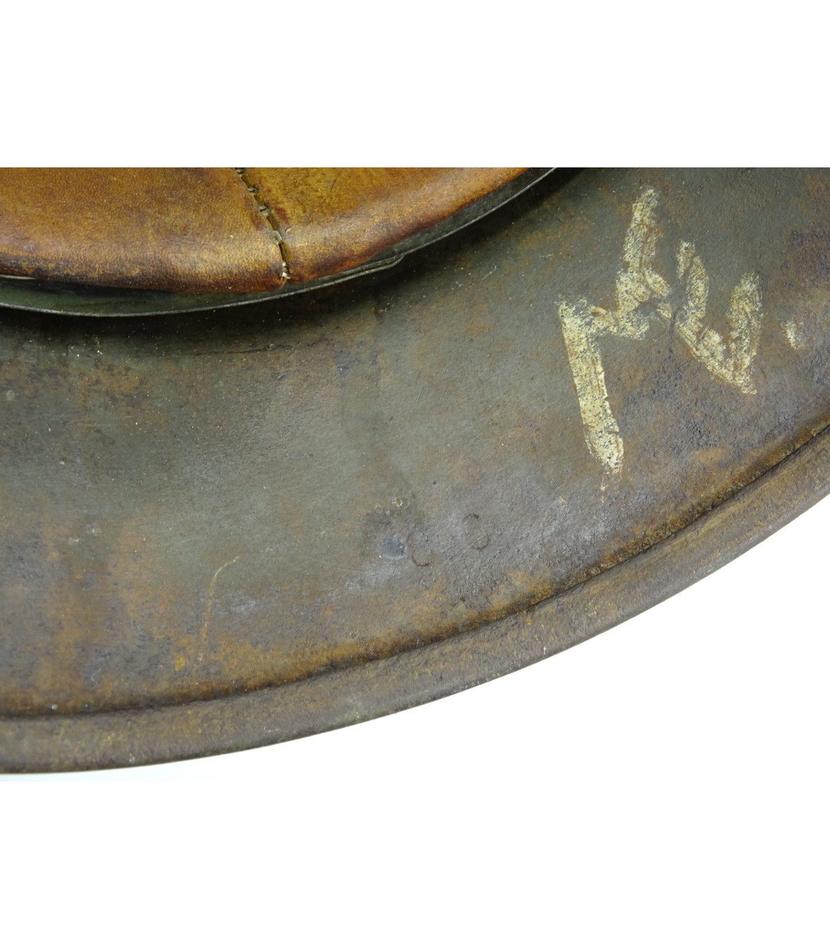 ET64, numéro illisible. T57. Peinture feldgrau à 80%, aigle WH à 70%. Complet sauf jugulaire. Cuir de coiffe souple. Initiales du propriétaire. Beau casque de combat en BE-TBE.