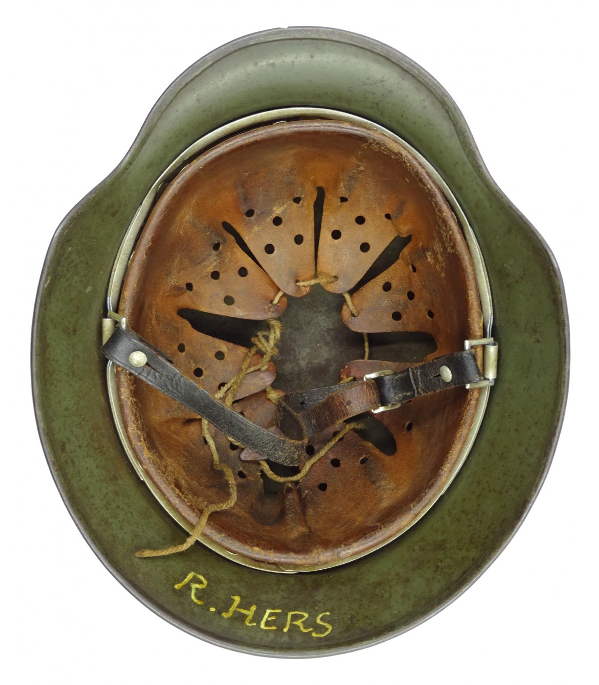 Peinture vert-pomme à 95-98%. Aigle WH à près de 100%. Ecusson belge peint à la main sur côté droit à 95-98%Complet. ET66, #4511, taille 58. Cuir de coiffe souple, jugulaire datée 40. On rappelle que les premiers volontaires belges de la Legion Wallonie ont été incorporés dans l'Infanterie-Bataillon 373 avant de constituer la division SS-Wallonie sous les ordres de Léon Degrelle. Voir : https://en.wikipedia.org/wiki/Walloon_Legion. Rarissime survivant de la Légion Wallonie dans un état exceptionnel !