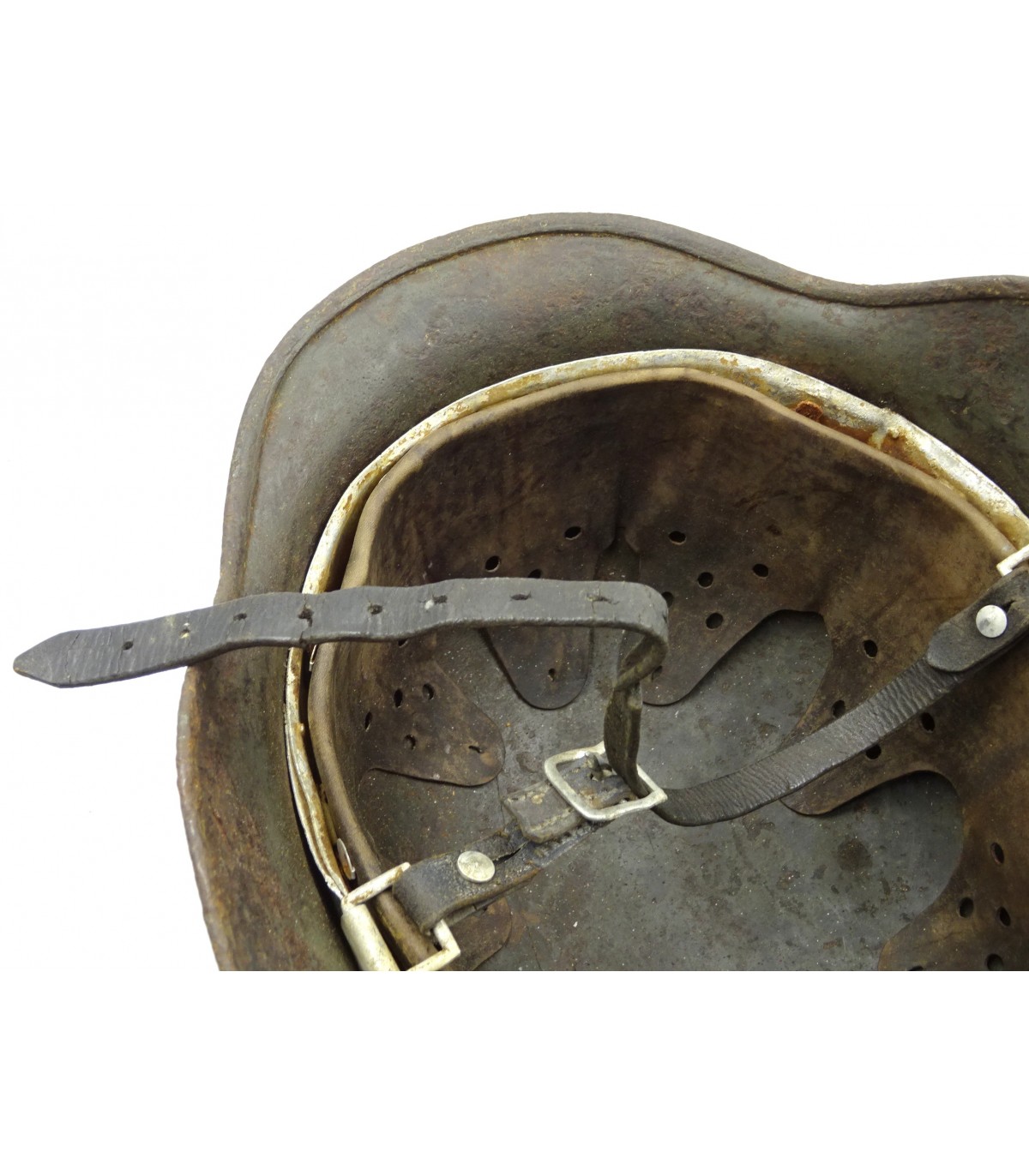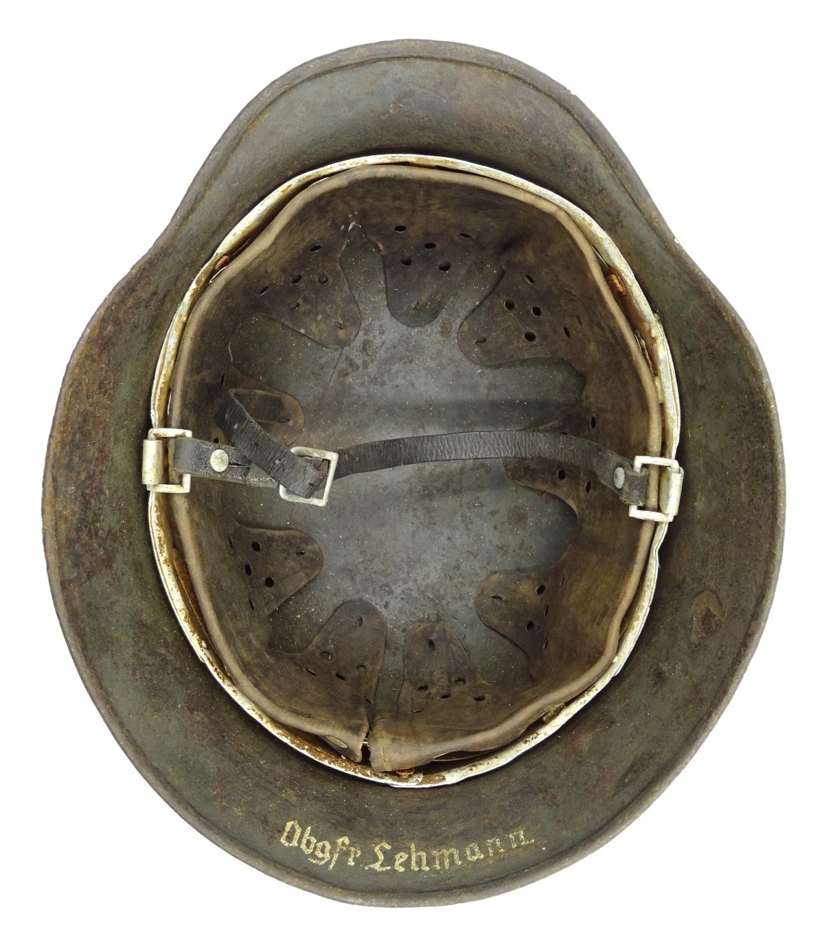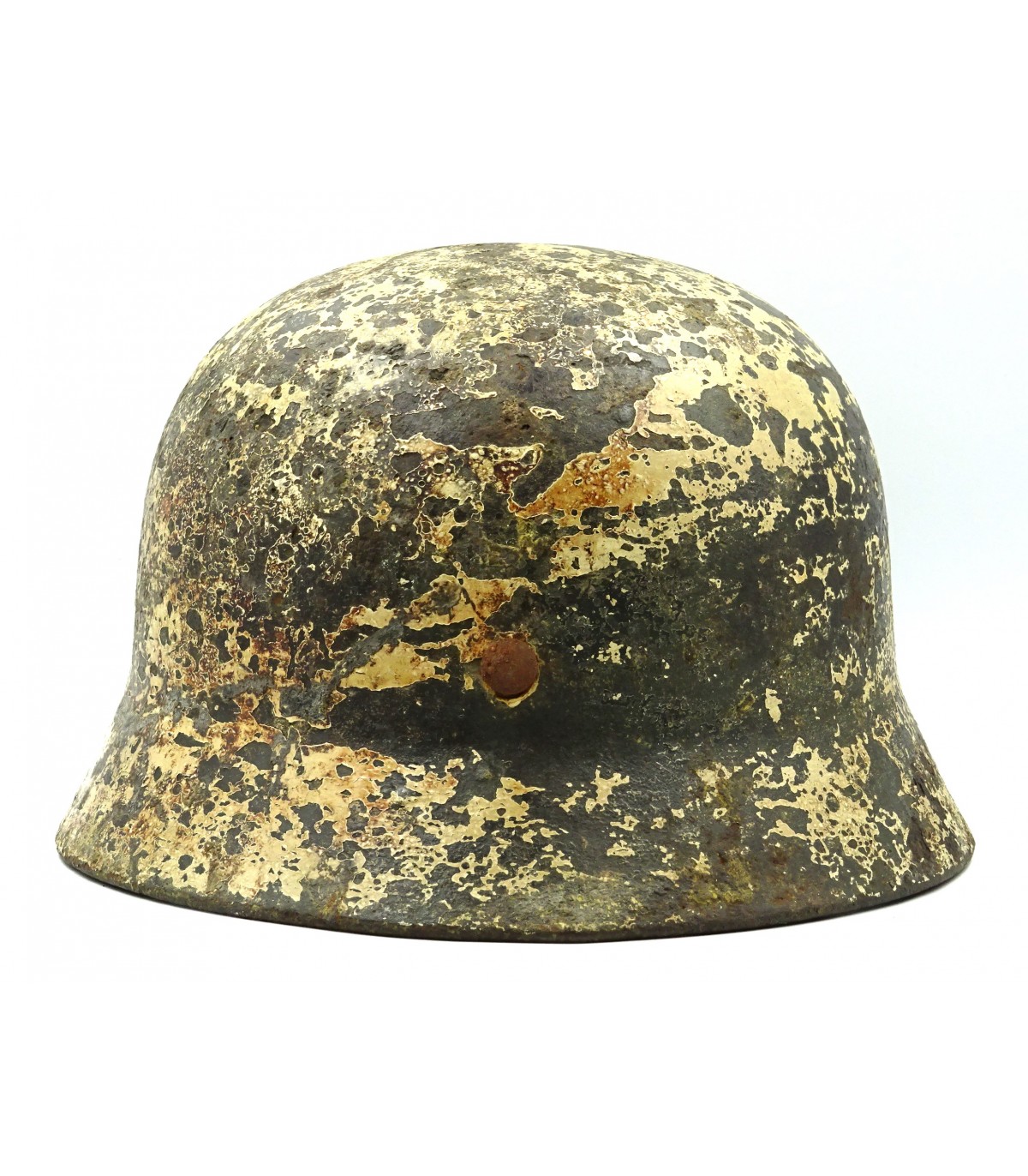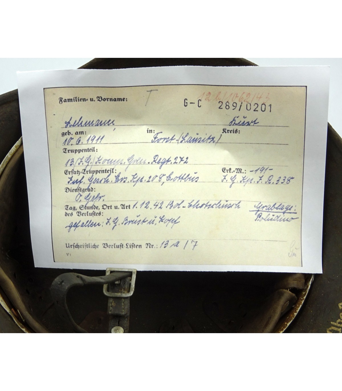Casque de l'Obergefreiter Kurt Lehmann du Gren.-Rgt.272, tombé au front le 1er décembre 1942. Complet, coiffe et jugulaire en EM. Camouflage de neige à 30-40%. Avec certificat de décès. Pièce émouvante en ABE-.