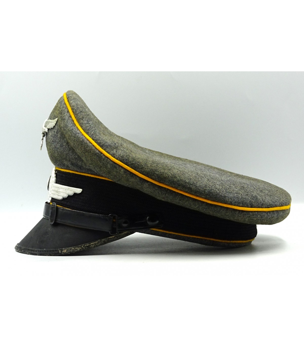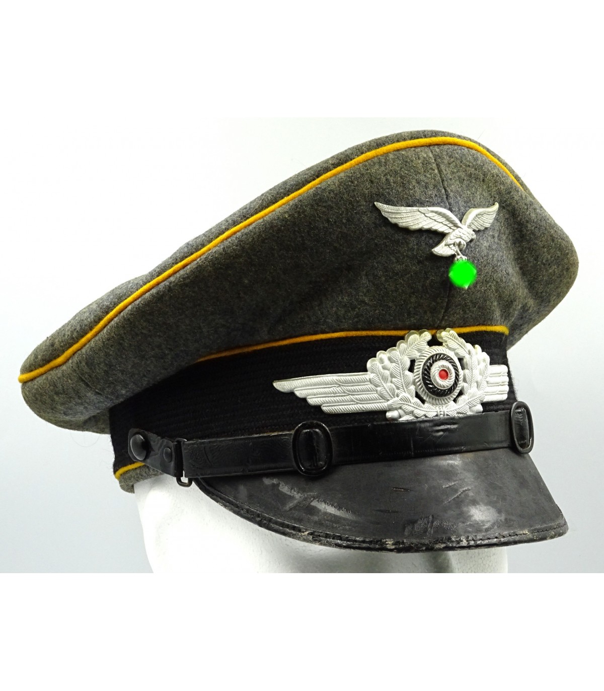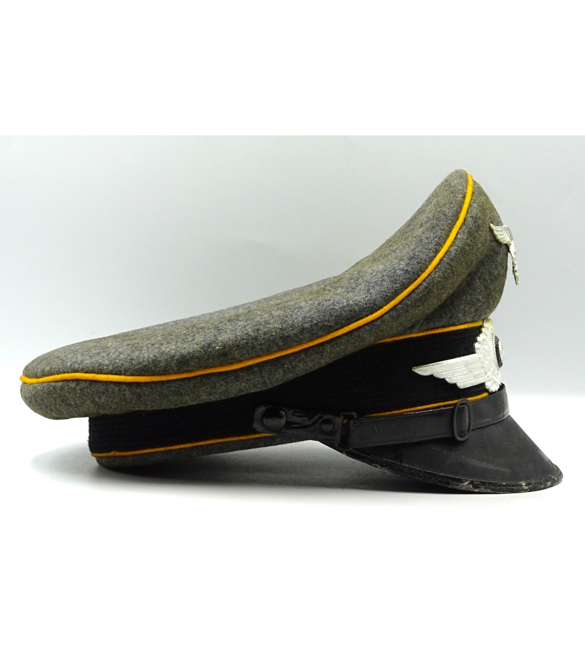Coiffe laine gris-LW, passepoils jaune d'or du personnel volant, insignes alu, jugulaire en cuir verni. Nominette intérieure. Visière à bordure en toile cirée, dessous vert. Forme haute. BE-TBE.