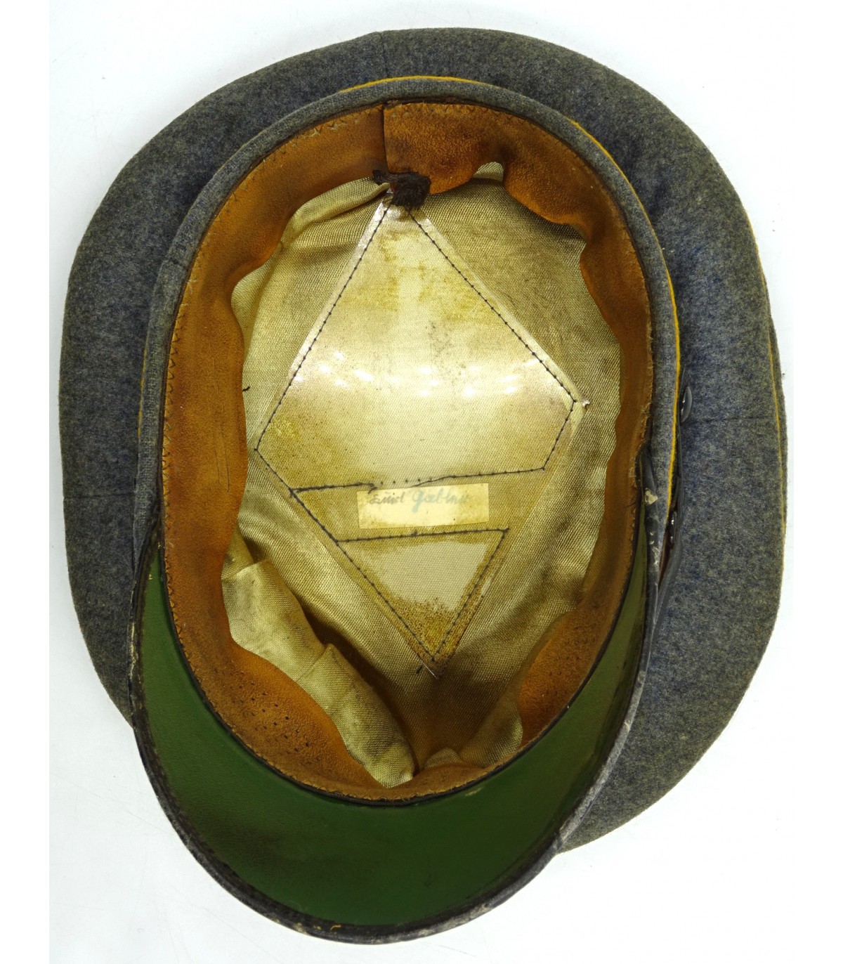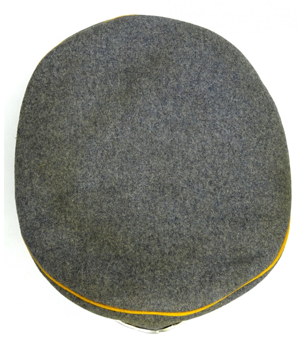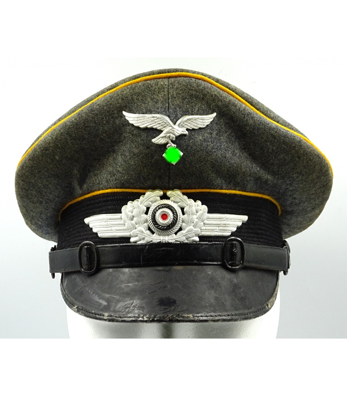 Coiffe laine gris-LW, passepoils jaune d'or du personnel volant, insignes alu, jugulaire en cuir verni. Nominette intérieure. Visière à bordure en toile cirée, dessous vert. Forme haute. BE-TBE.