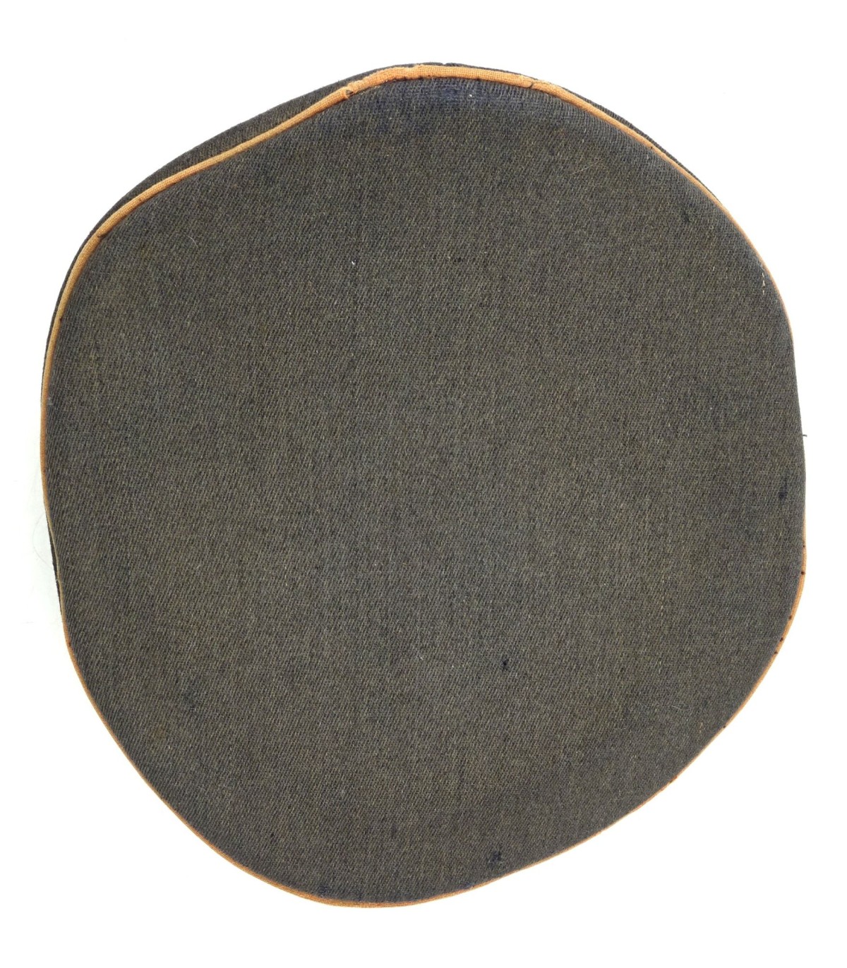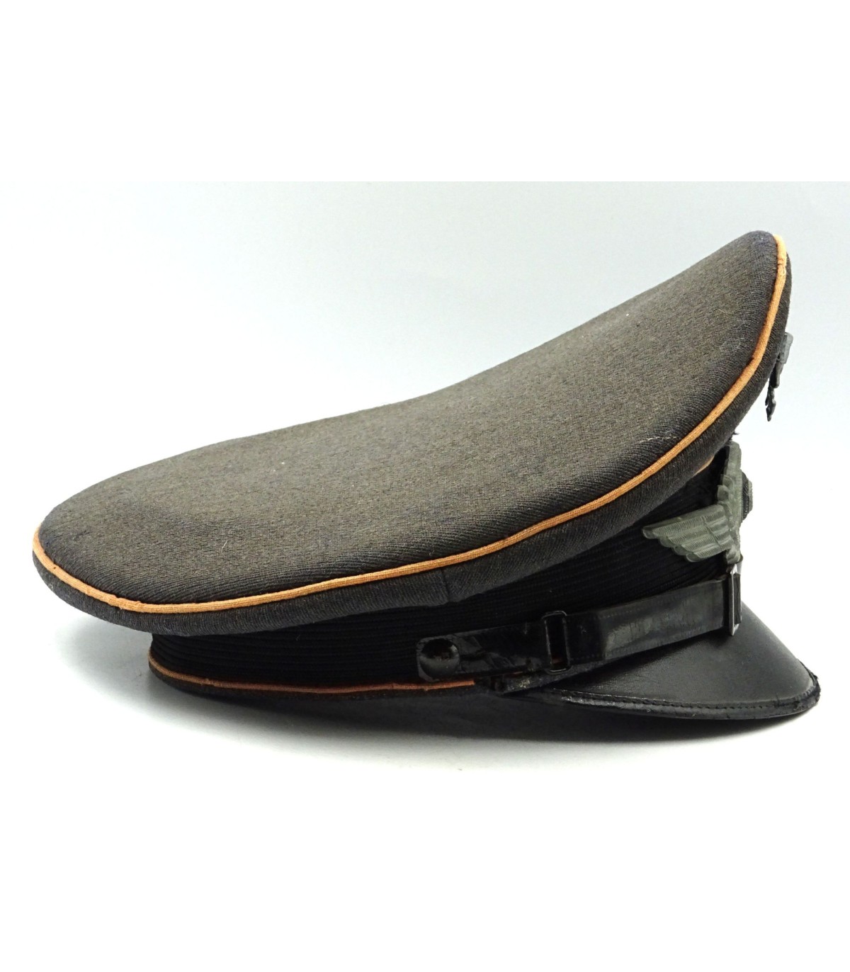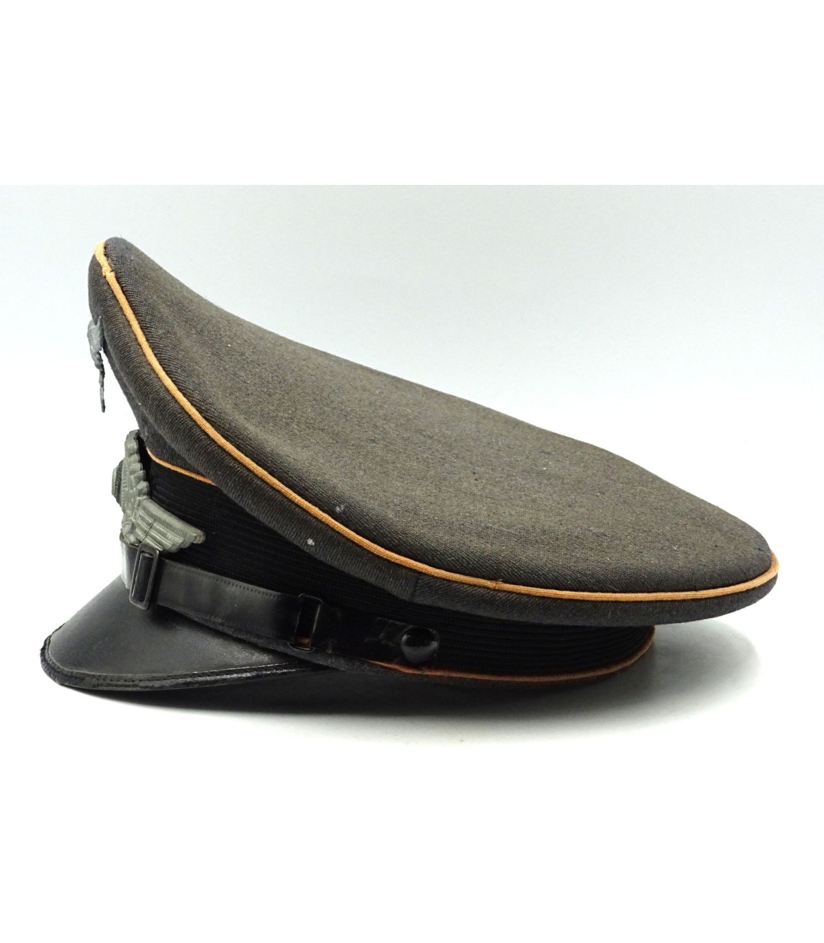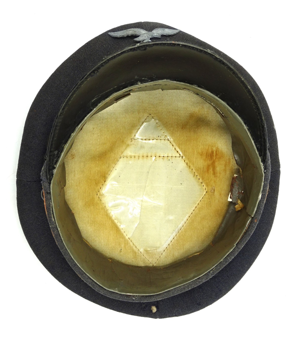 Coiffe en tricotine, insignes en zinc, visière à bordure en toile cirée. Bandeau de transpiration en cuir ersatz, réparé. Quelques trous de mites. Belle forme 'cassée'. ABE-.