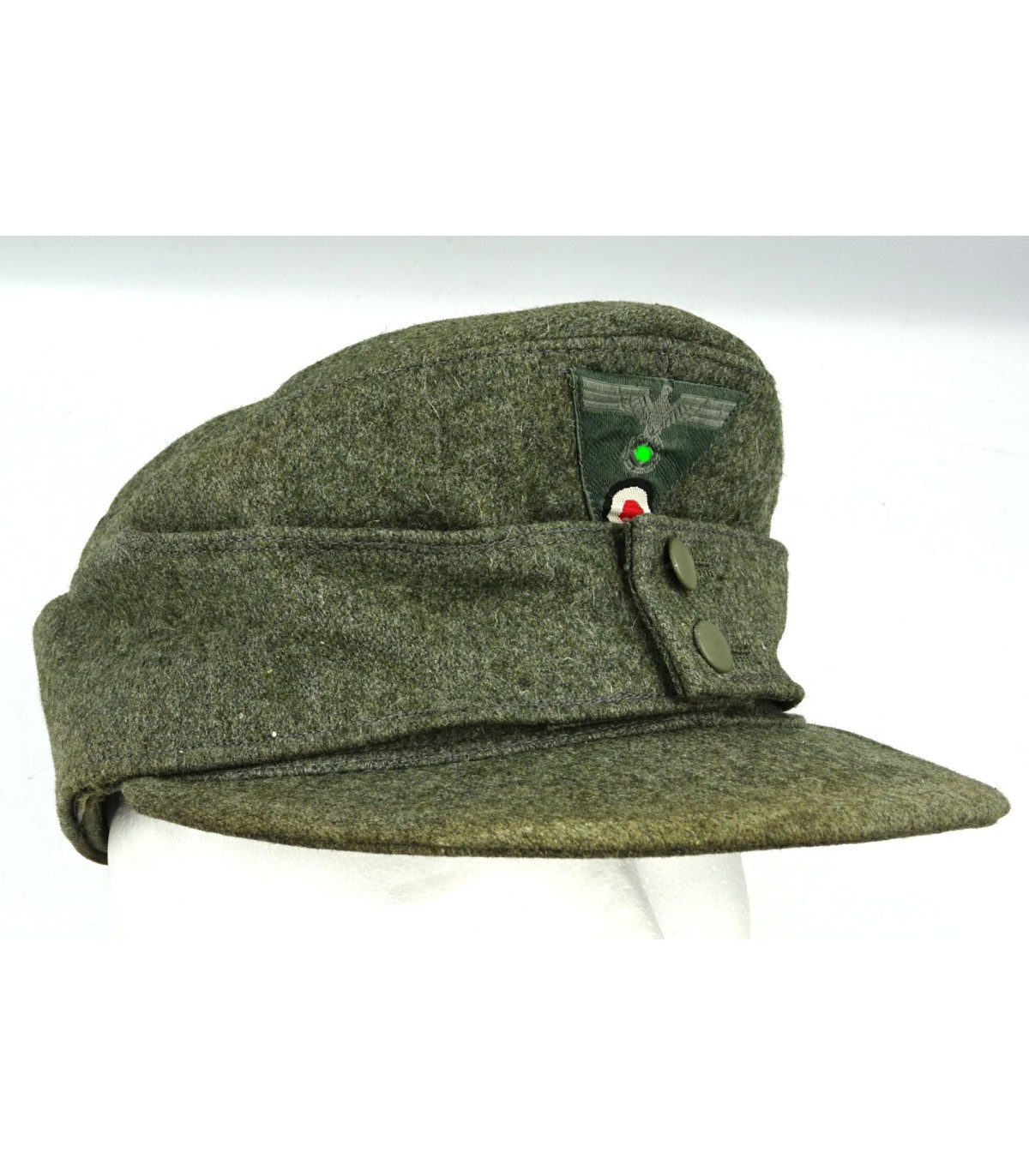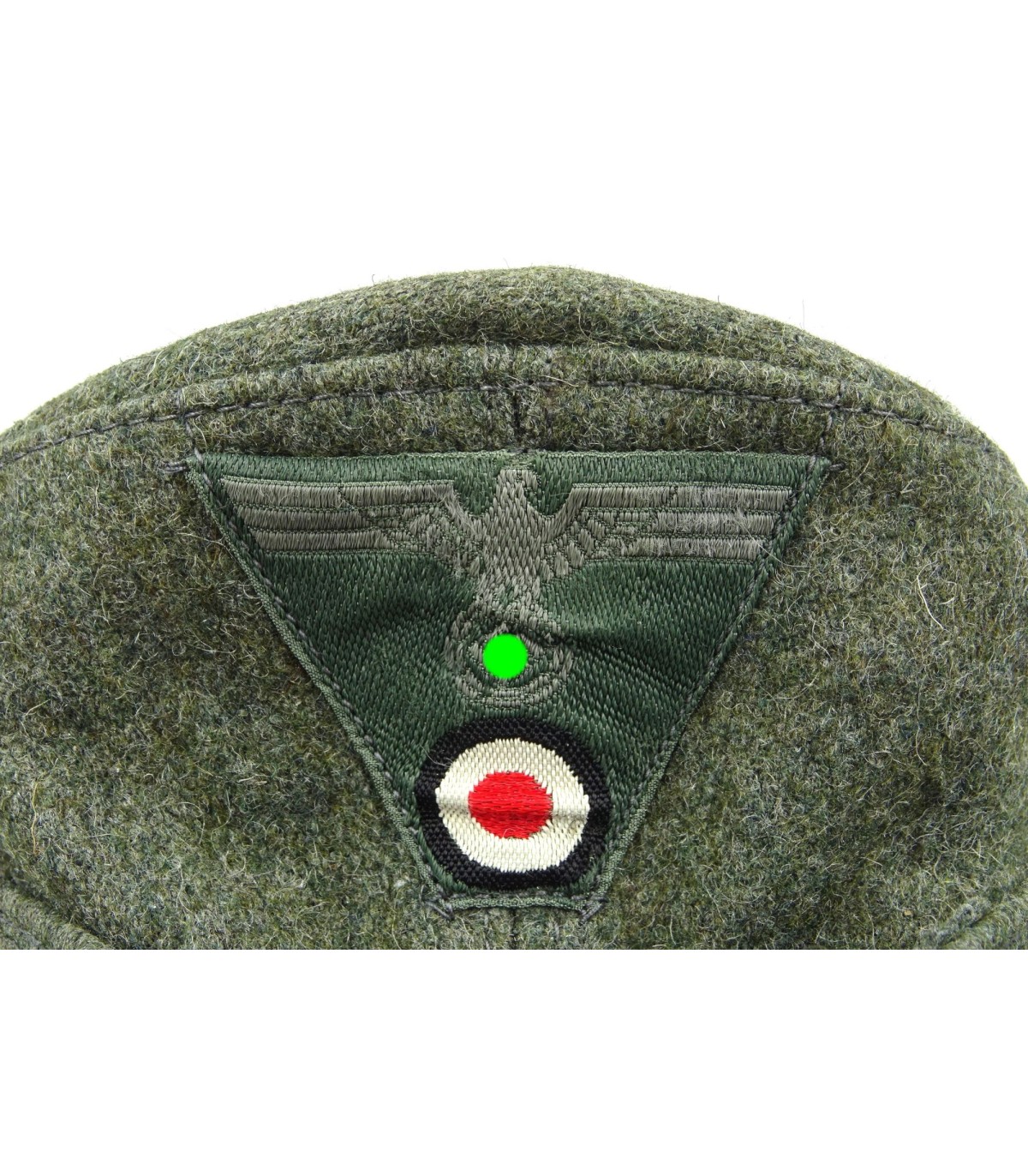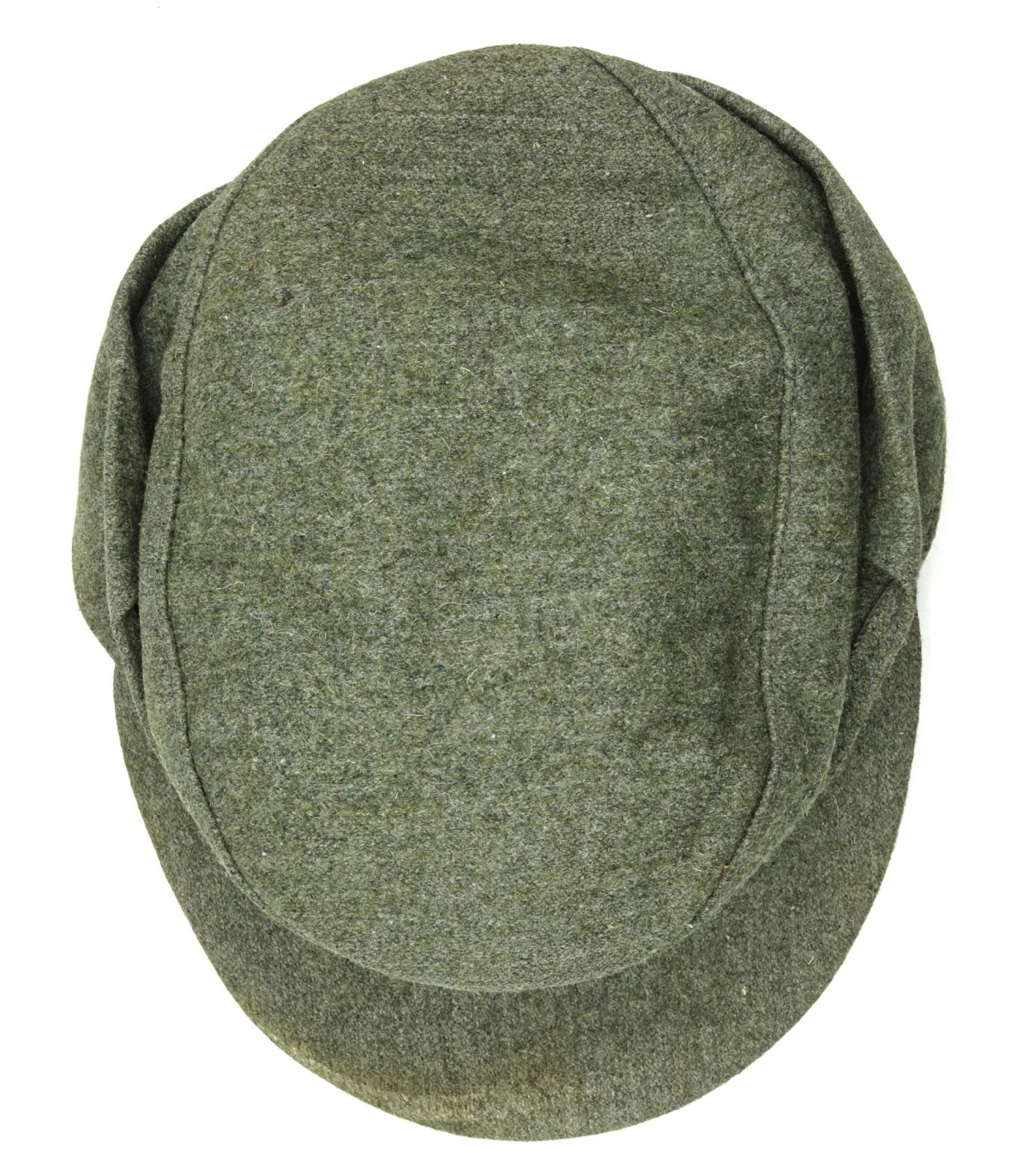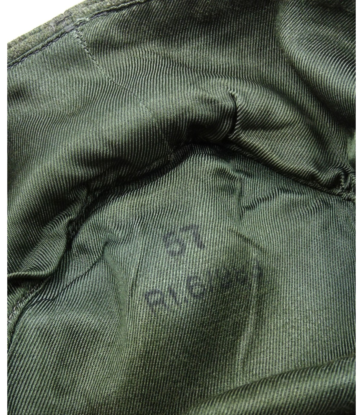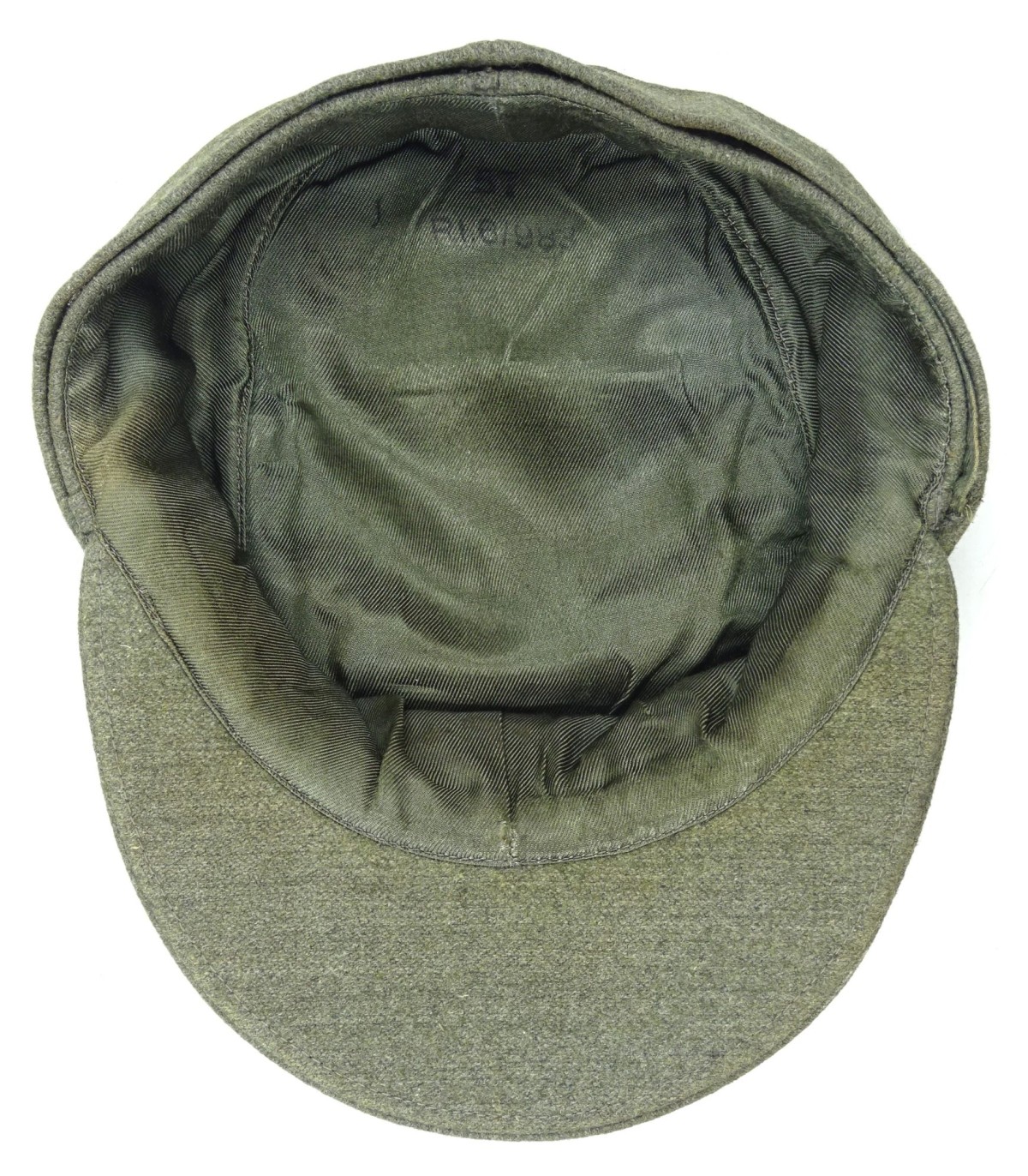 Complète. Drap feldgrau tardif. Insigne trapézoïdal tissé bevo et piqué machine. Boutons grénelés feldgrau. Doublure en satinette verdâtre, marquée RI.6/983. Taille 57. TBE.