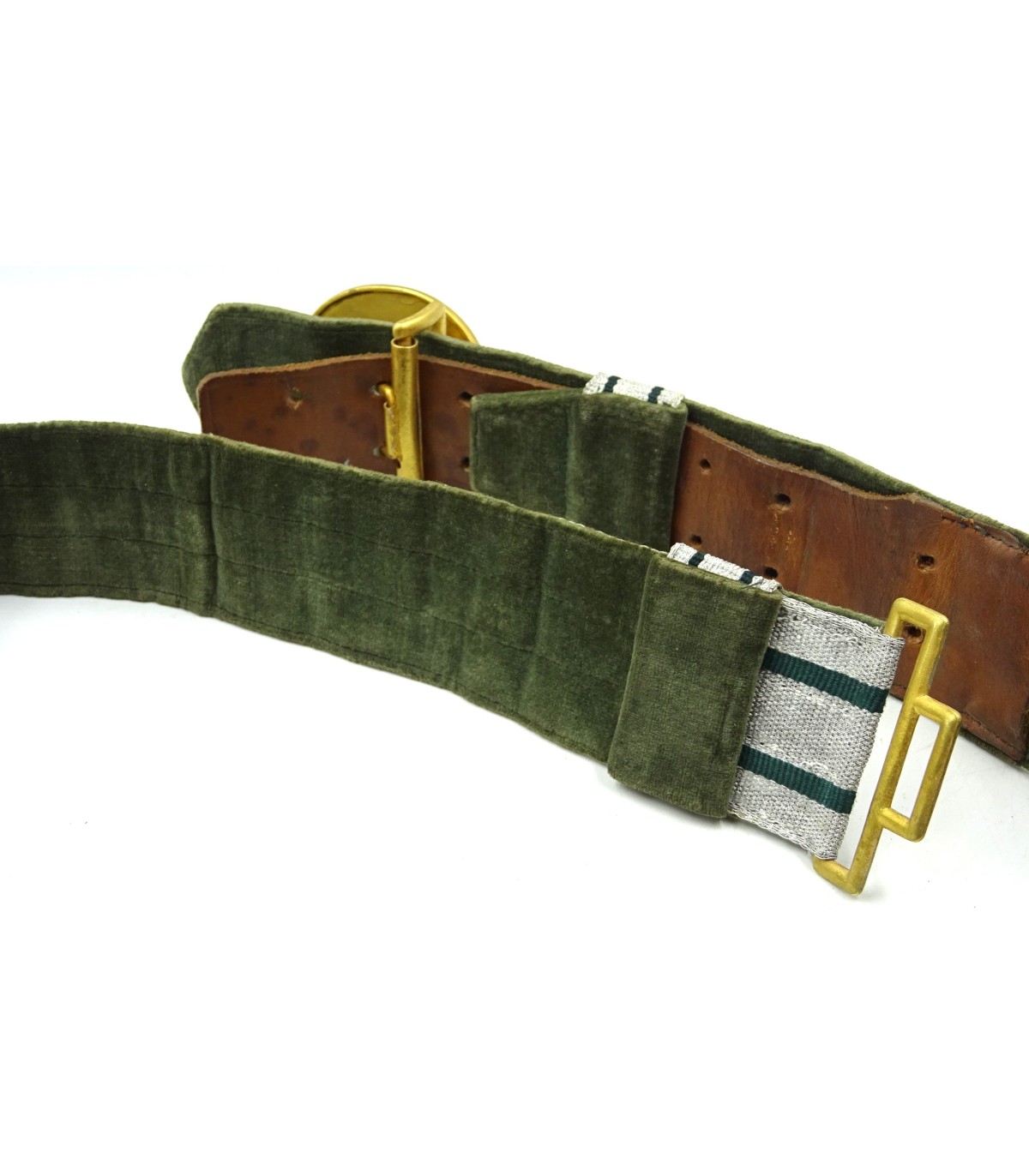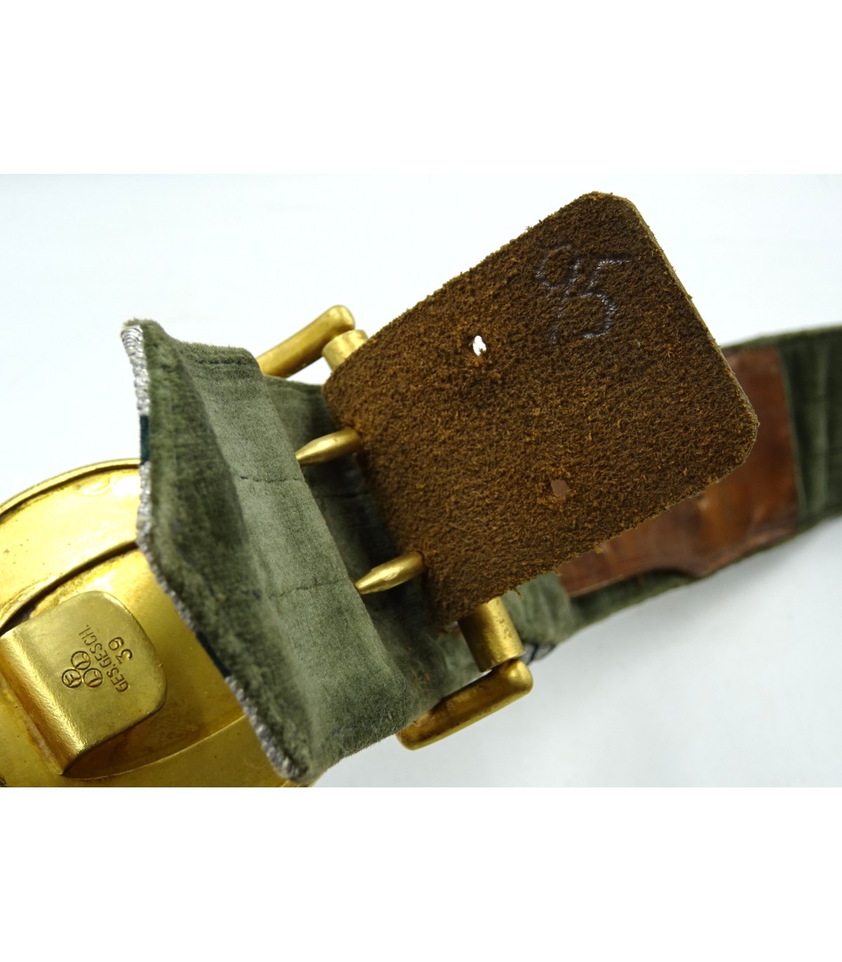 Brocard argent et vert-foncé, boucle ovale en aluminium doré de chez FLL, marquée ges.gesch.39. Lègère oxyadtion partielle de l'aluminum du brocart sinon TBE. Rare.