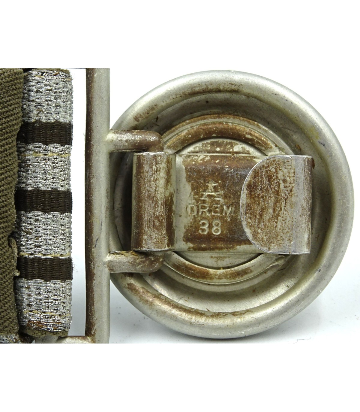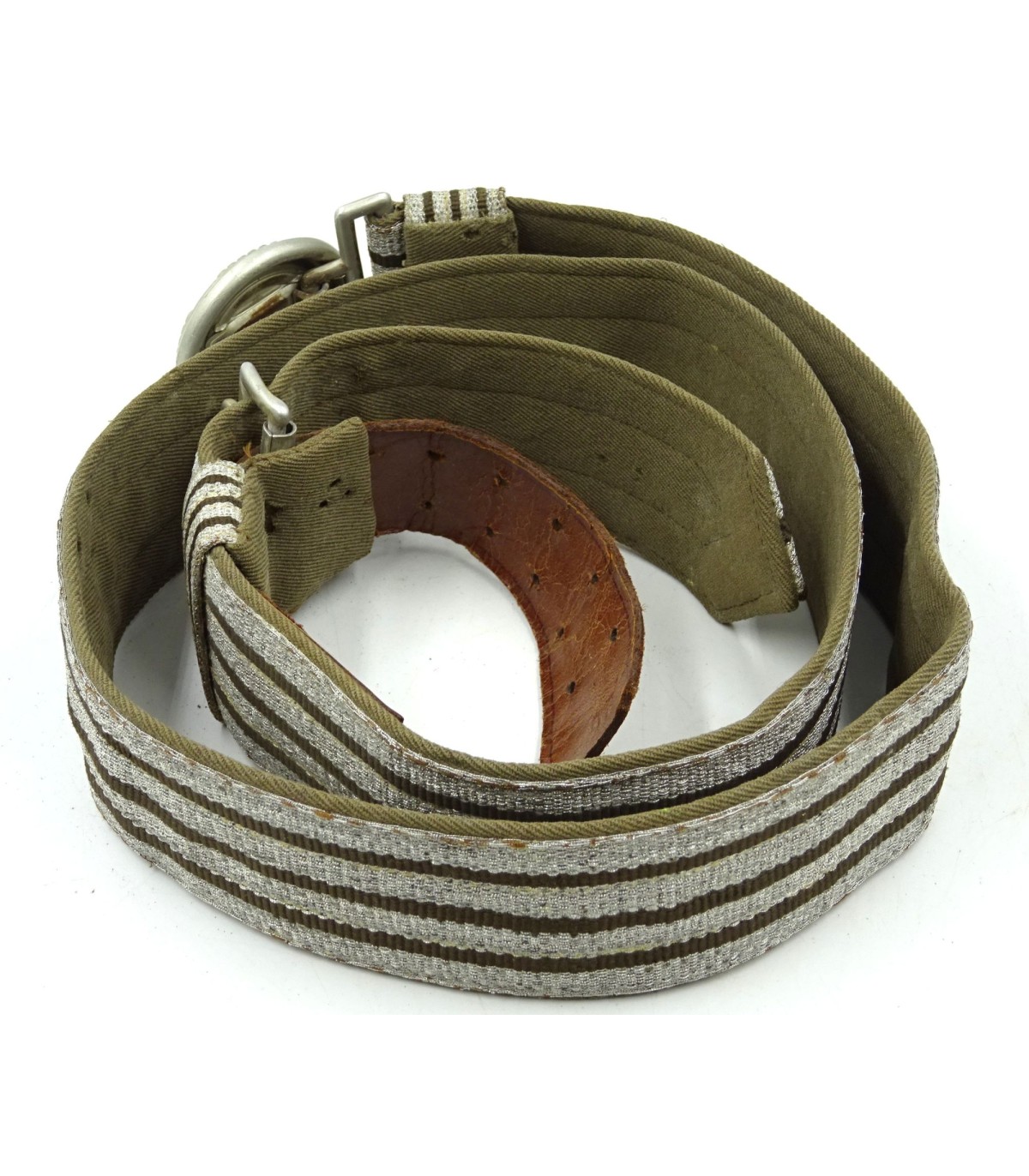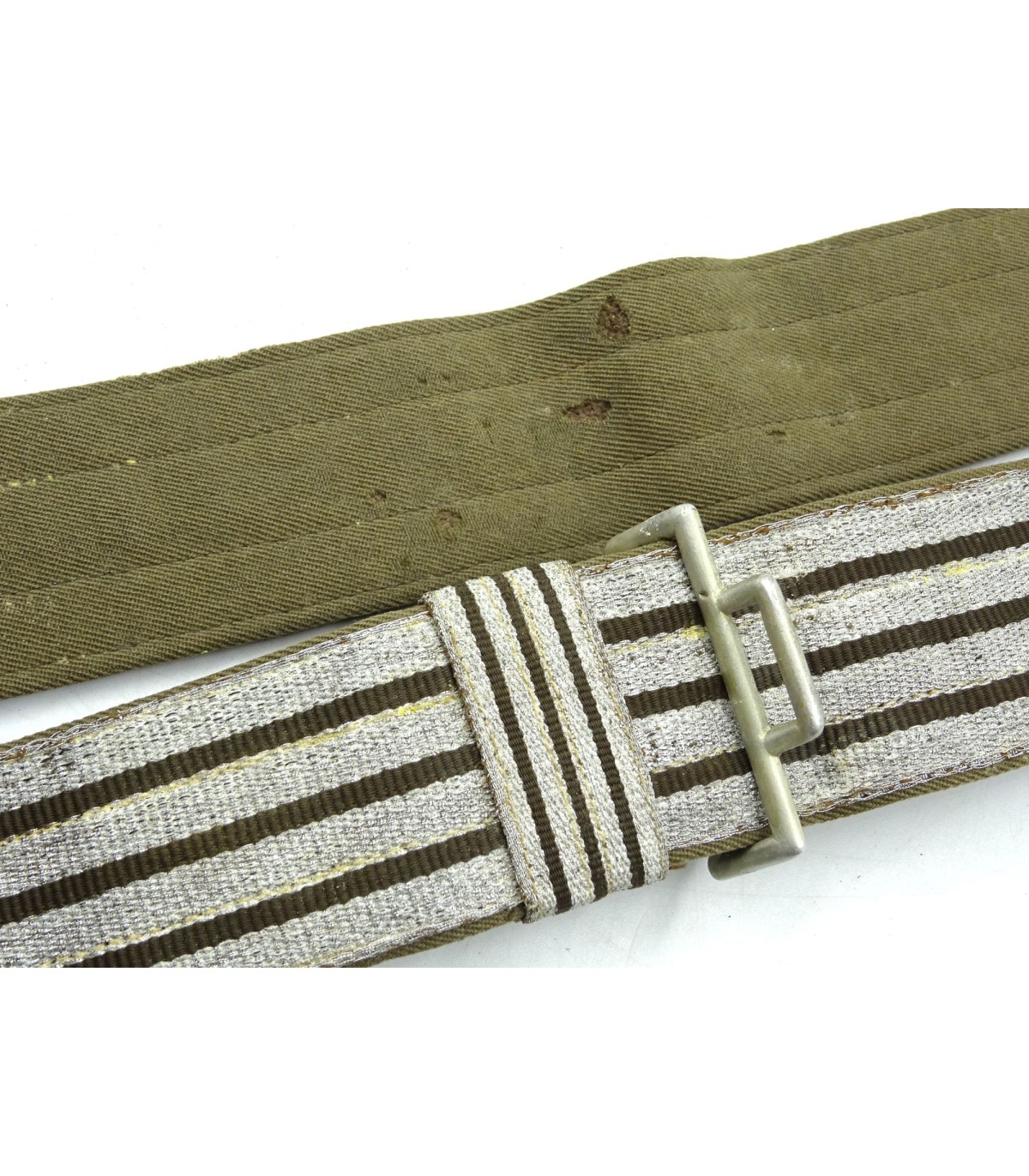 Ceinturon de brocart argent et marron, dessous de gabardine brune (trous de mites). Longueur 100cm. Brocart avec ses 2 passants, BE-TBE. Boucle ronde de chez Assmann en alu, avec ses 2 attaches. TBE.
