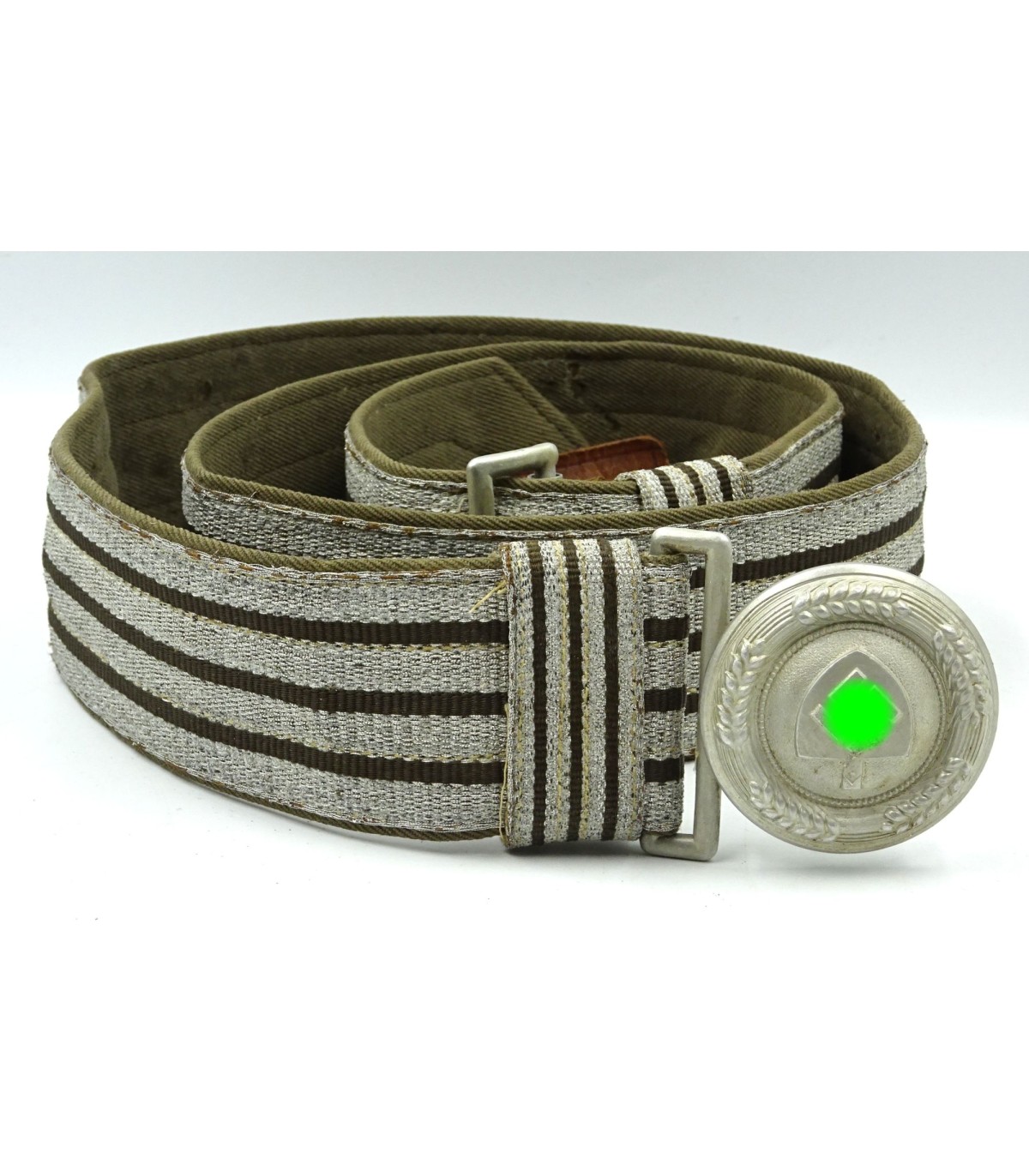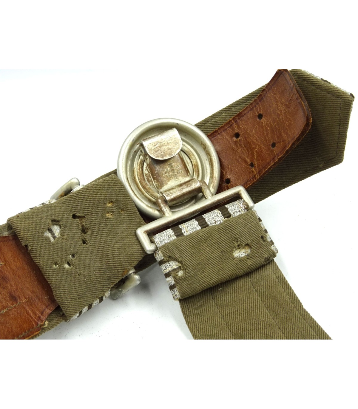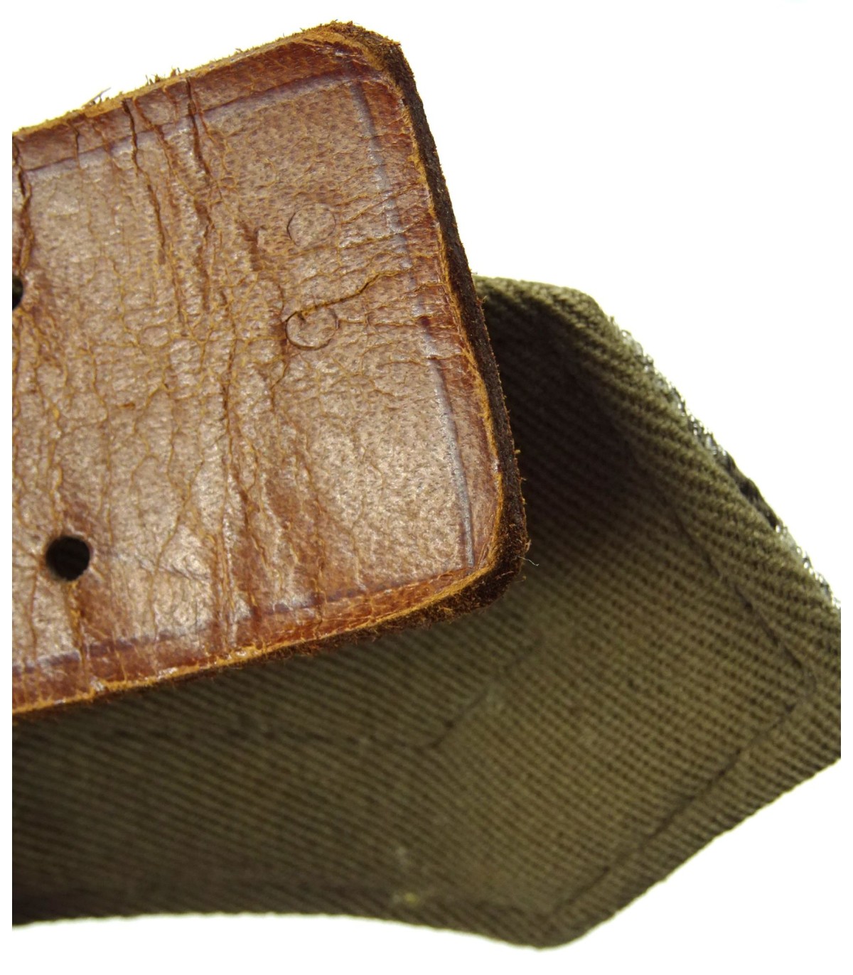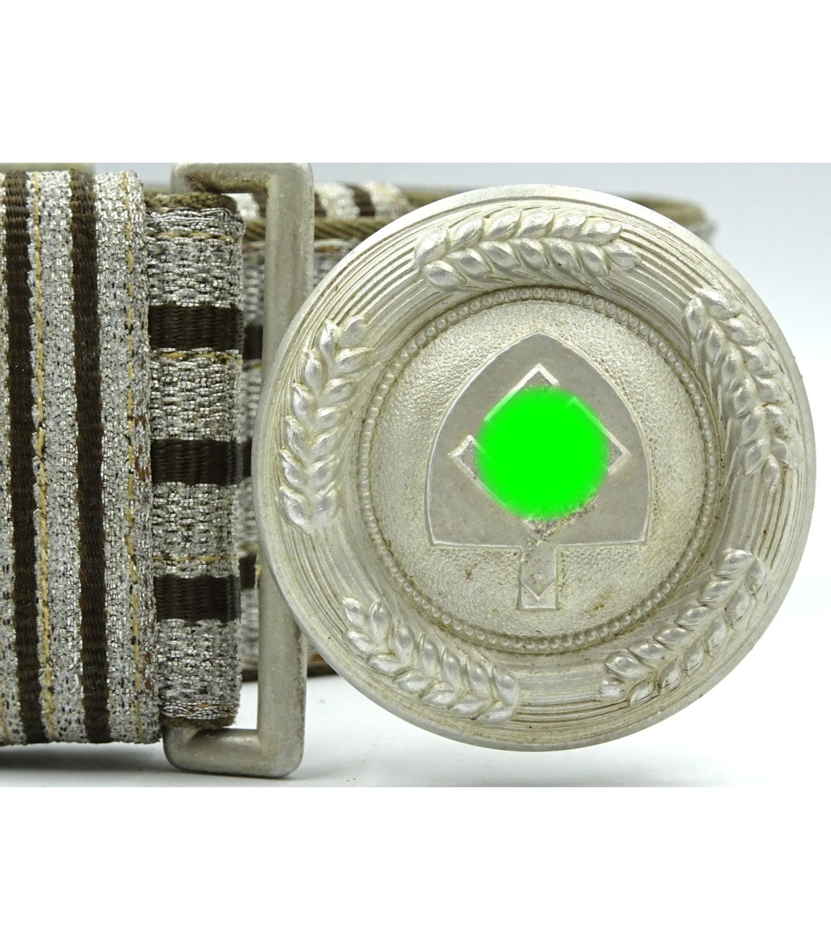Ceinturon de brocart argent et marron, dessous de gabardine brune (trous de mites). Longueur 100cm. Brocart avec ses 2 passants, BE-TBE. Boucle ronde de chez Assmann en alu, avec ses 2 attaches. TBE.