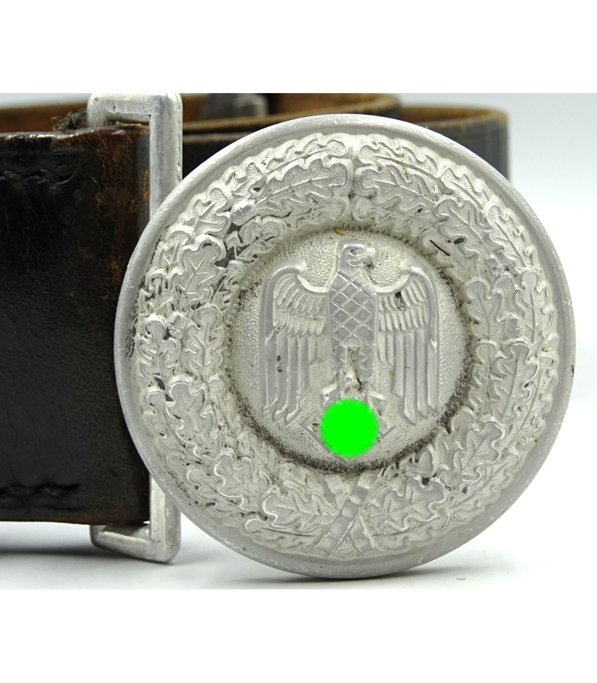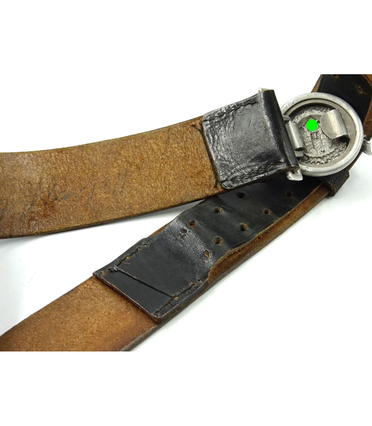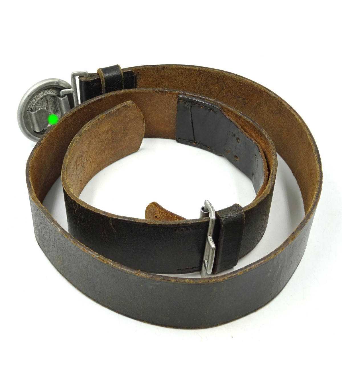 Rare ceinturon en cuir noir à boucle ronde en aluminium. Avec ses 2 passants. Longueur 105cm. BE.
