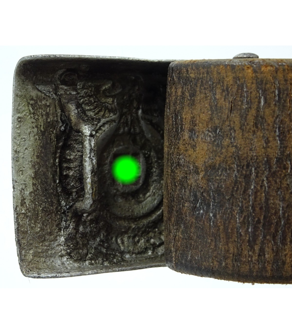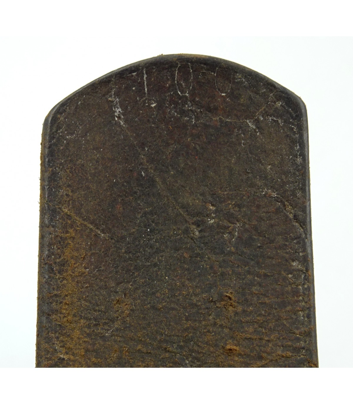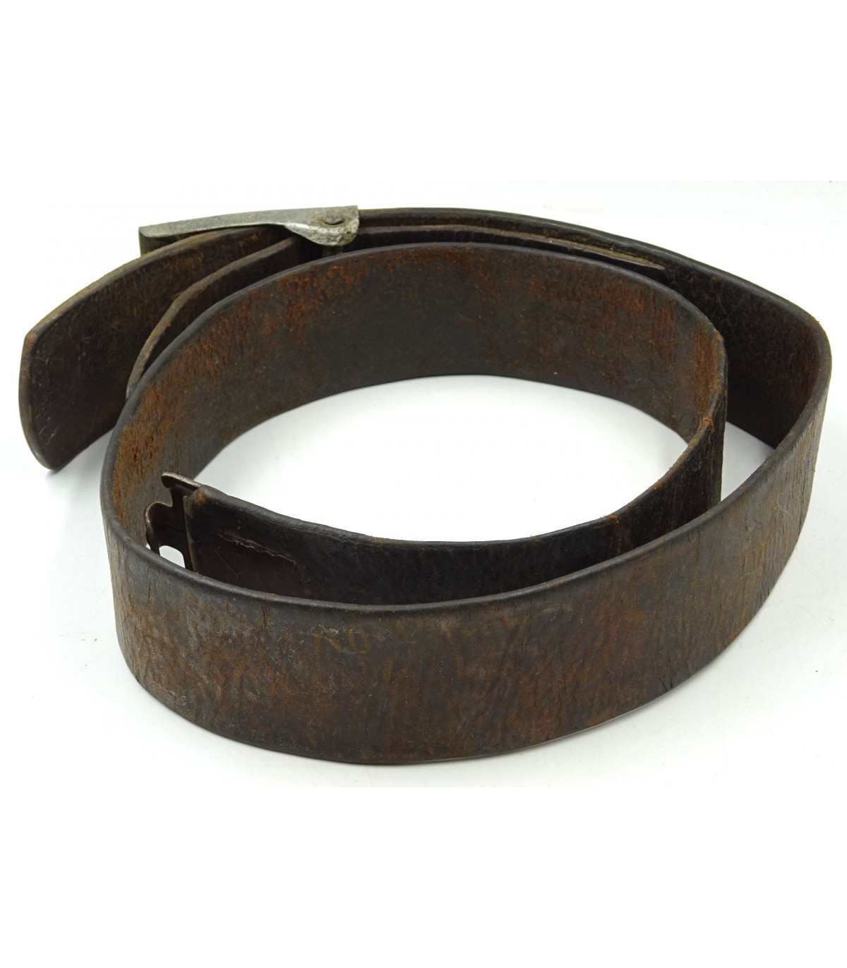 Boucle acier sans marquages, oxydation générale non traversante. Cuir de ceinturon à crochet acier, longueur 100cm. EM.
