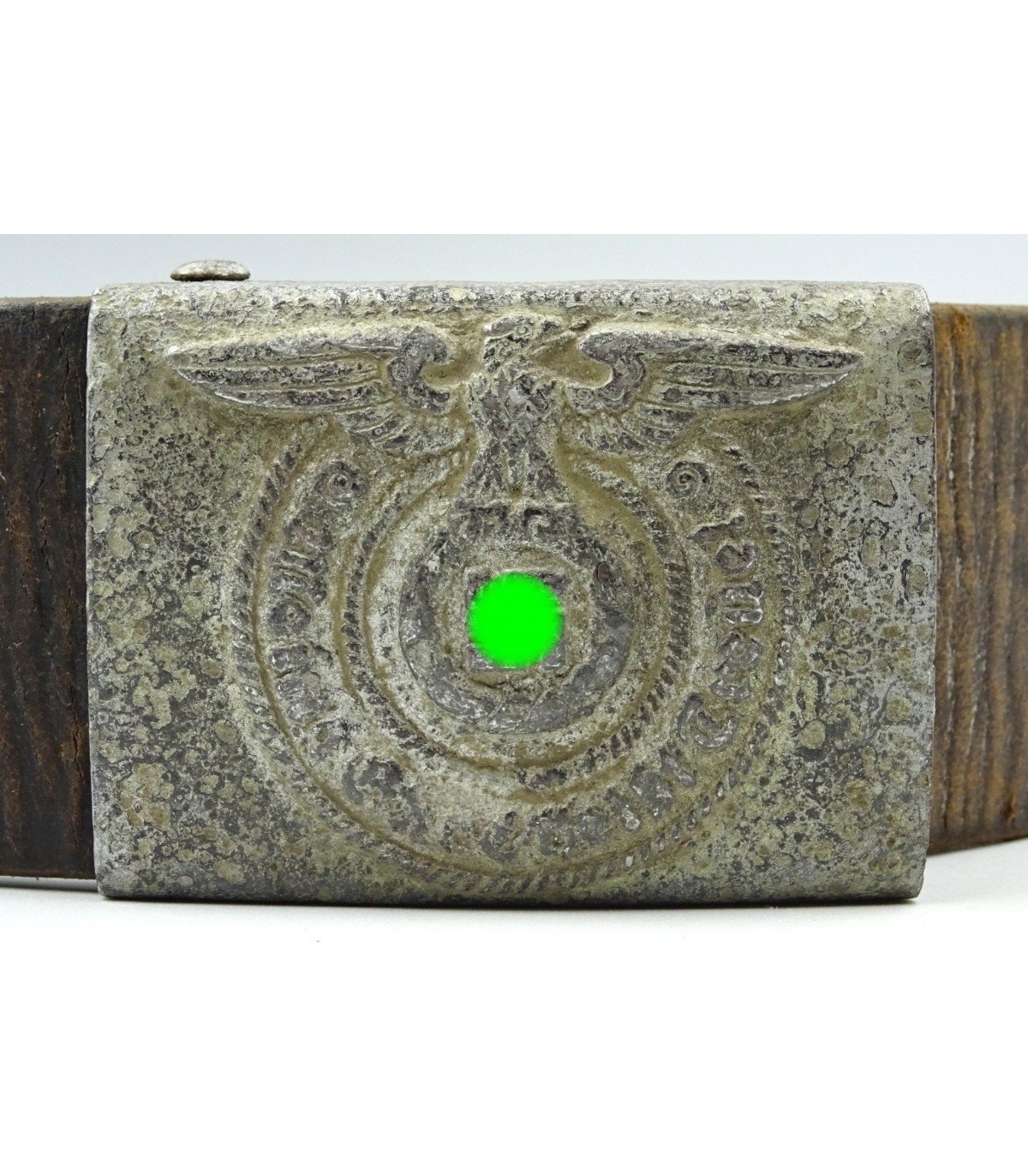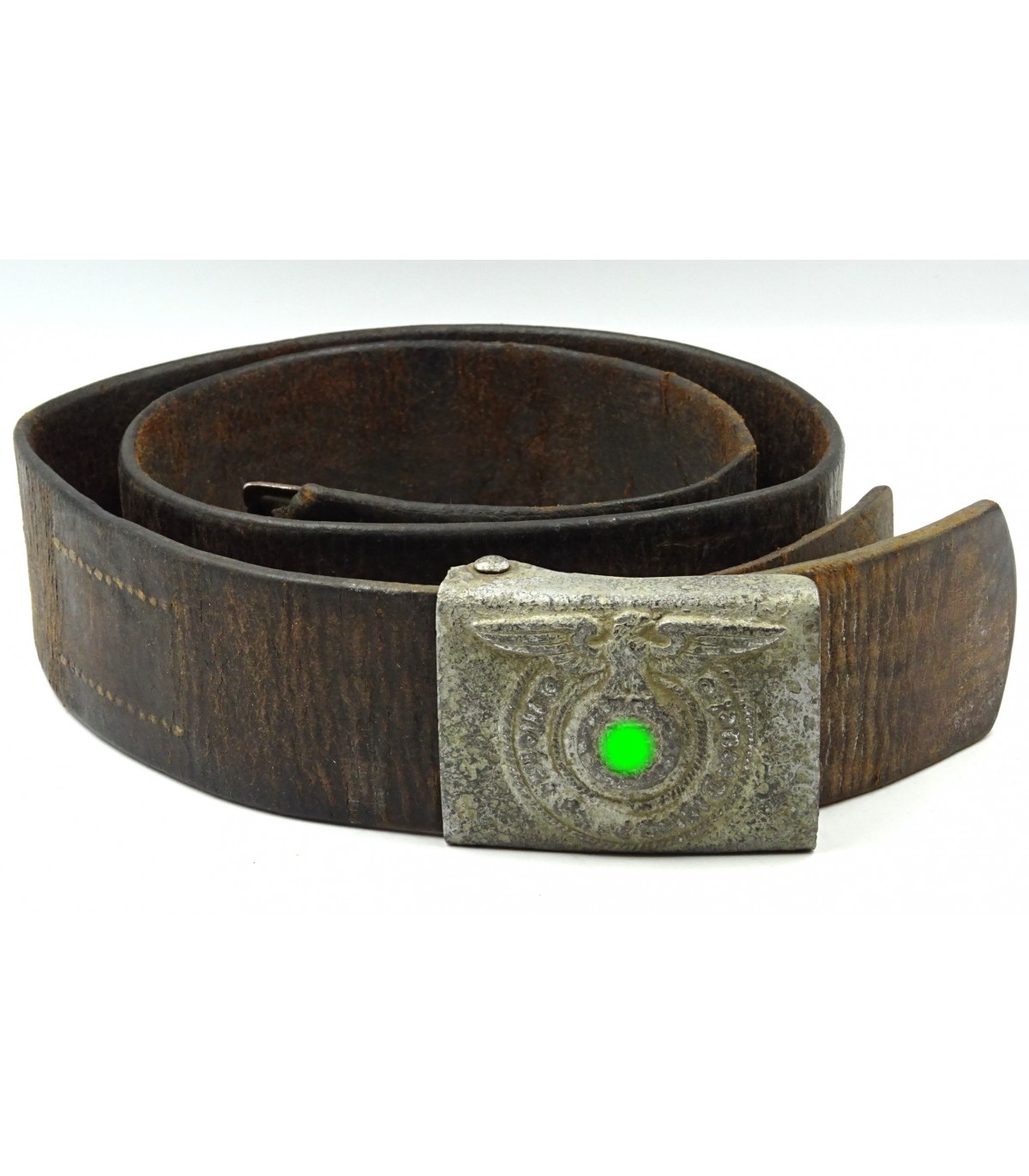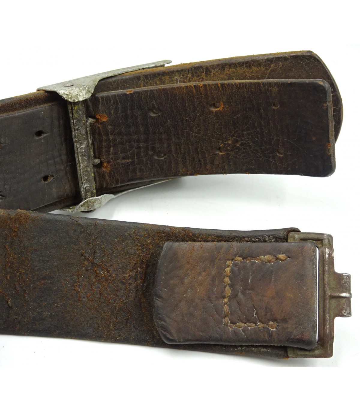 Boucle acier sans marquages, oxydation générale non traversante. Cuir de ceinturon à crochet acier, longueur 100cm. EM.
