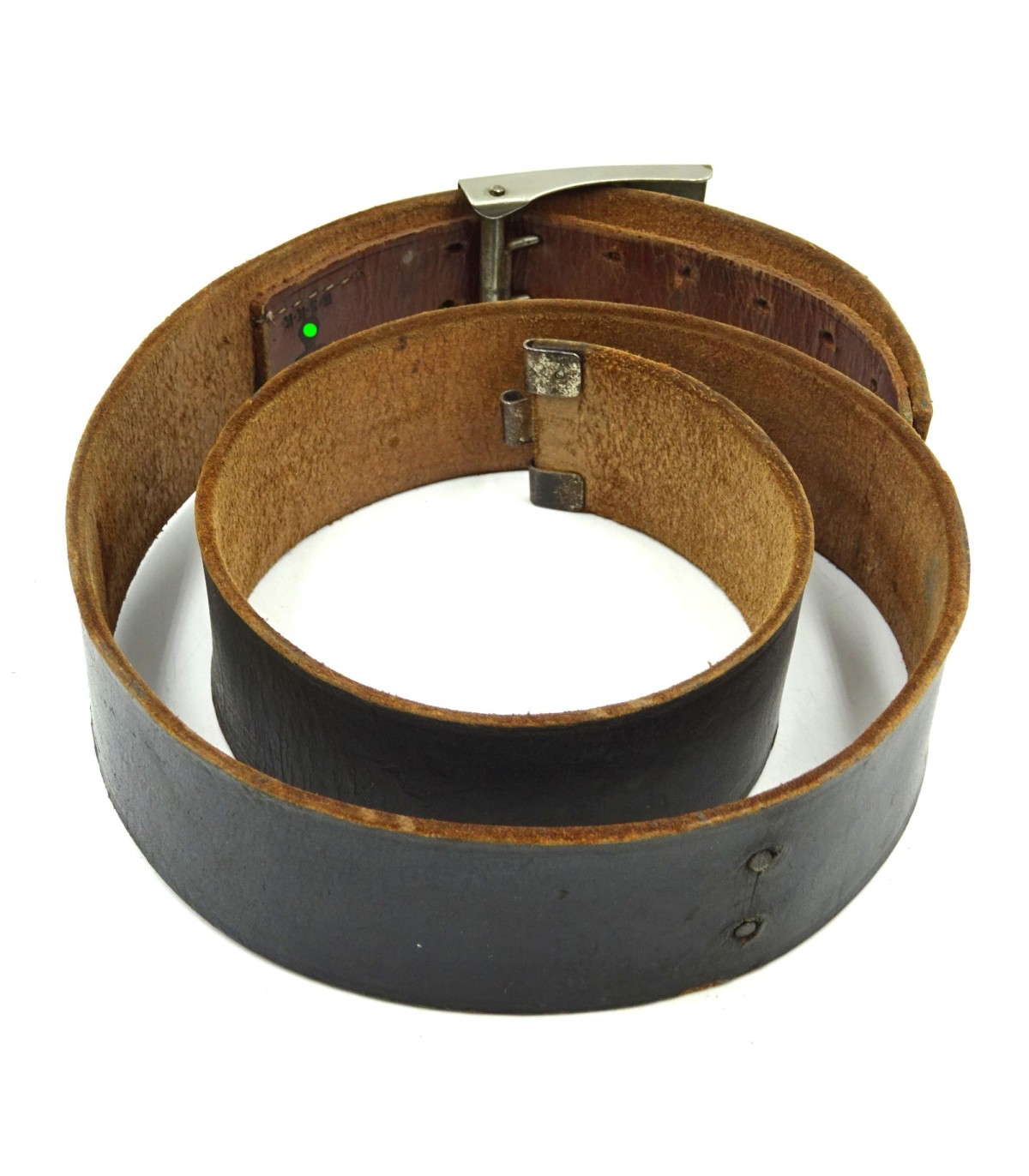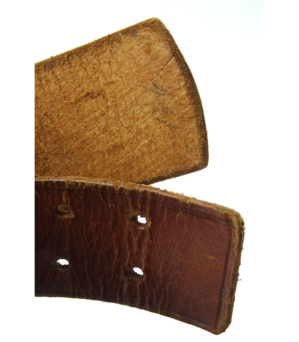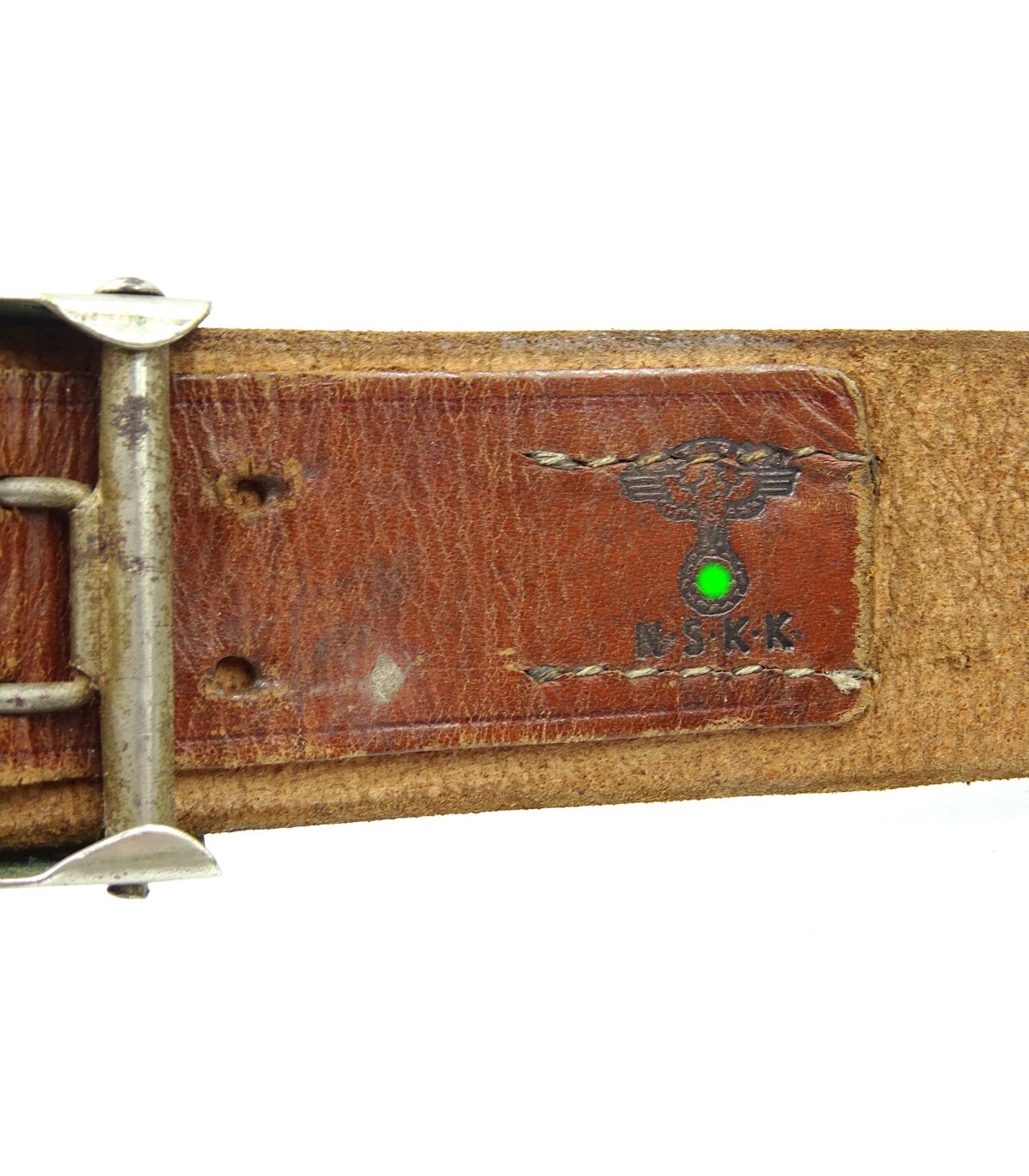 Boucle laiton nicklé, svastika tournante. Cuir marqué NSKK avec aigle, longueur 104cm. TBE.