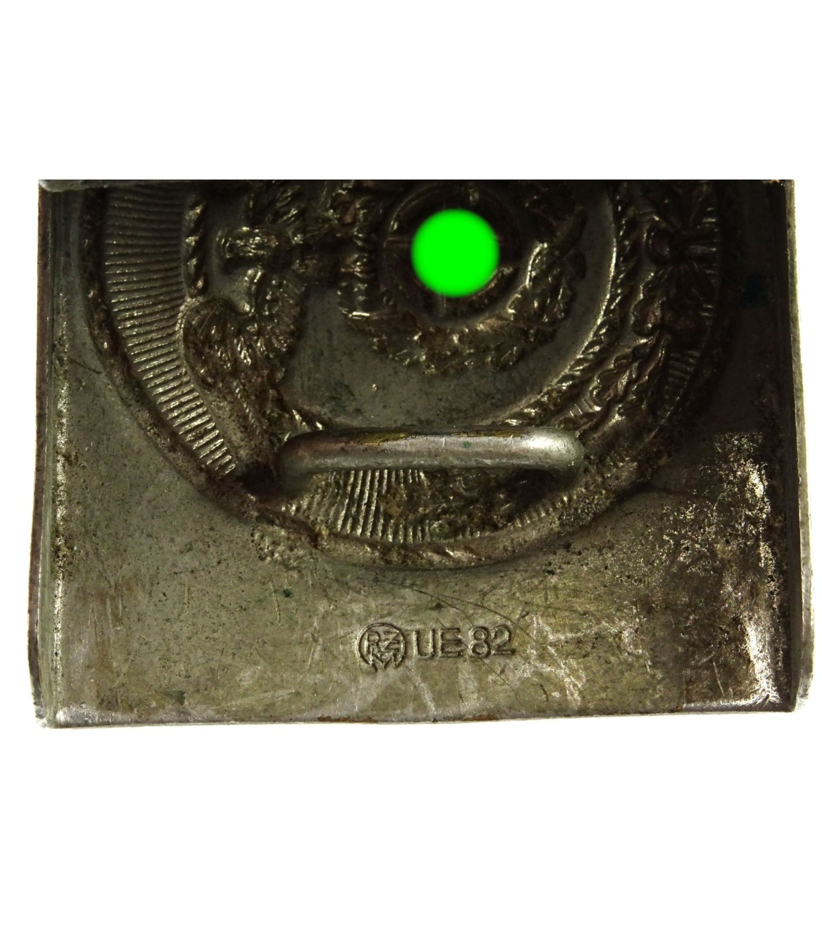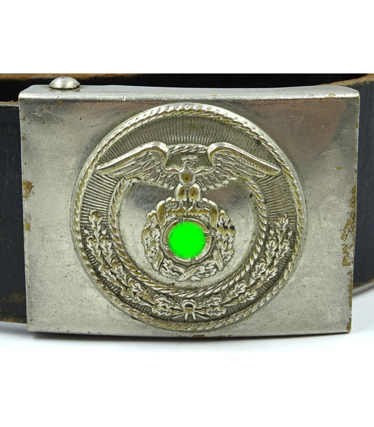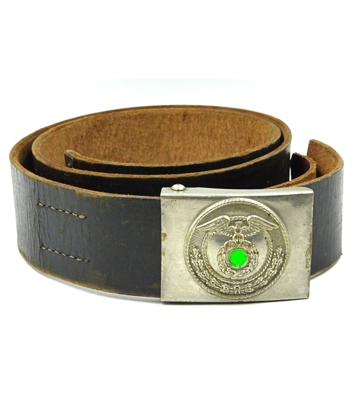 Boucle laiton nicklé, svastika tournante. Cuir marqué NSKK avec aigle, longueur 104cm. TBE.