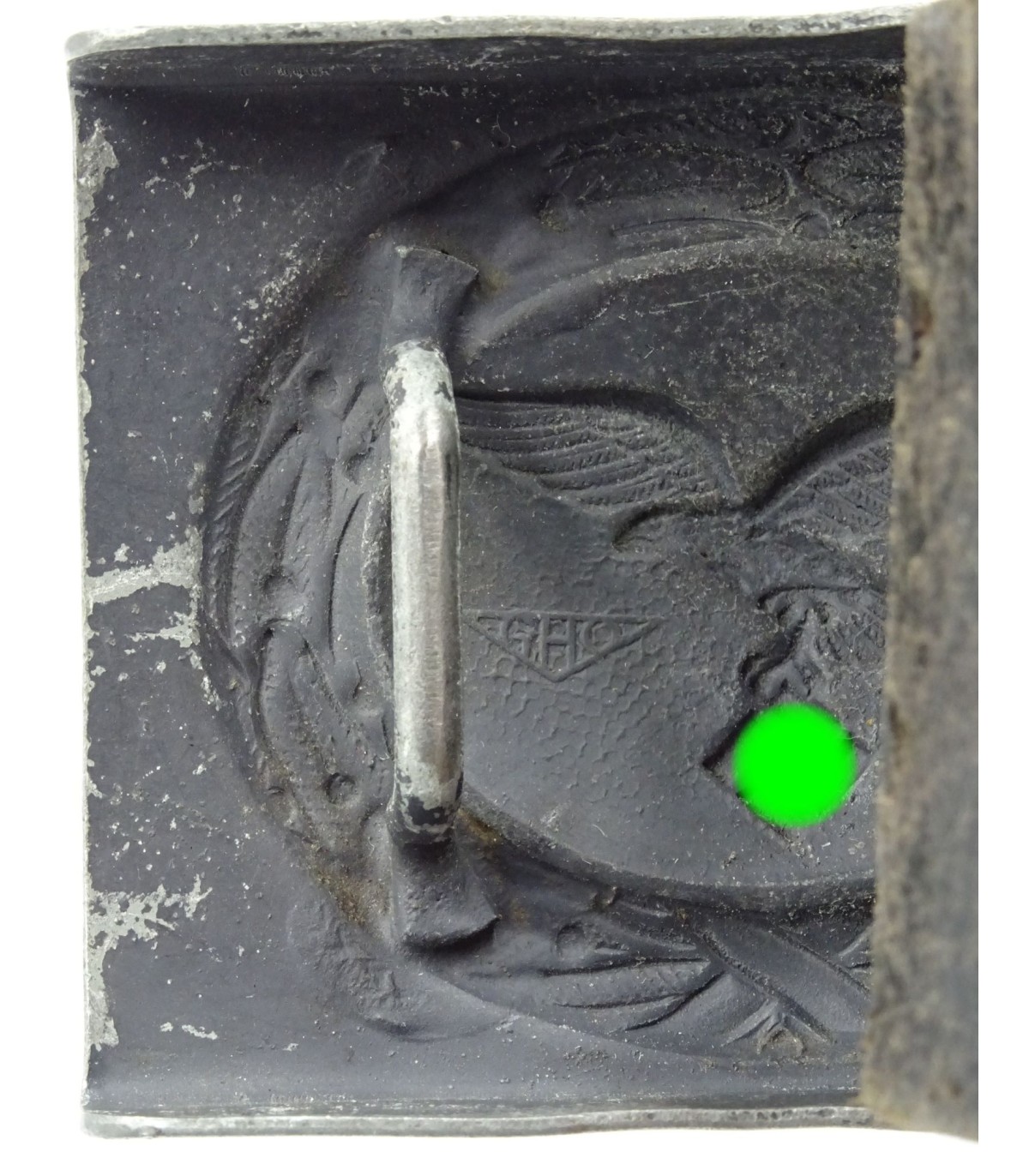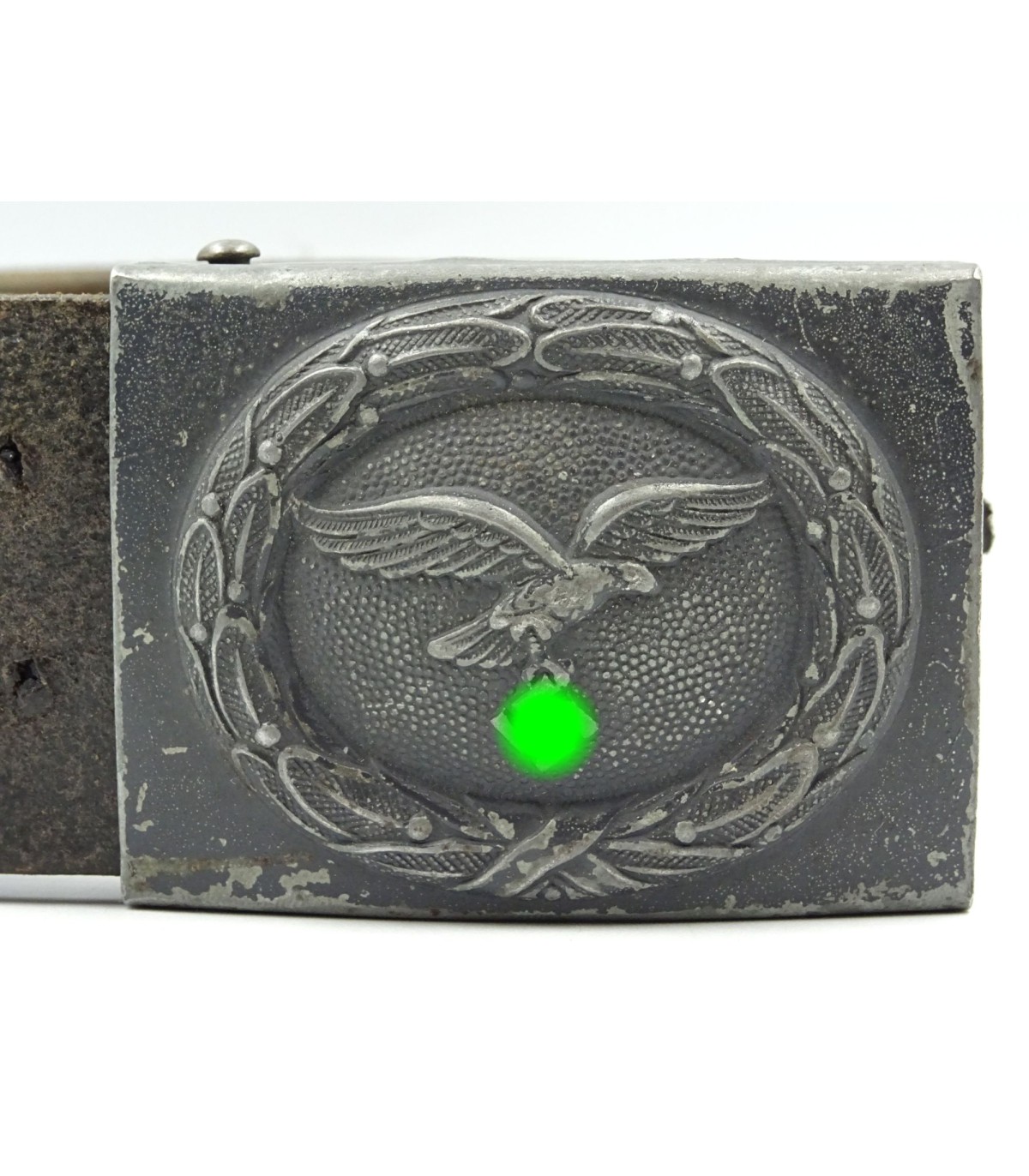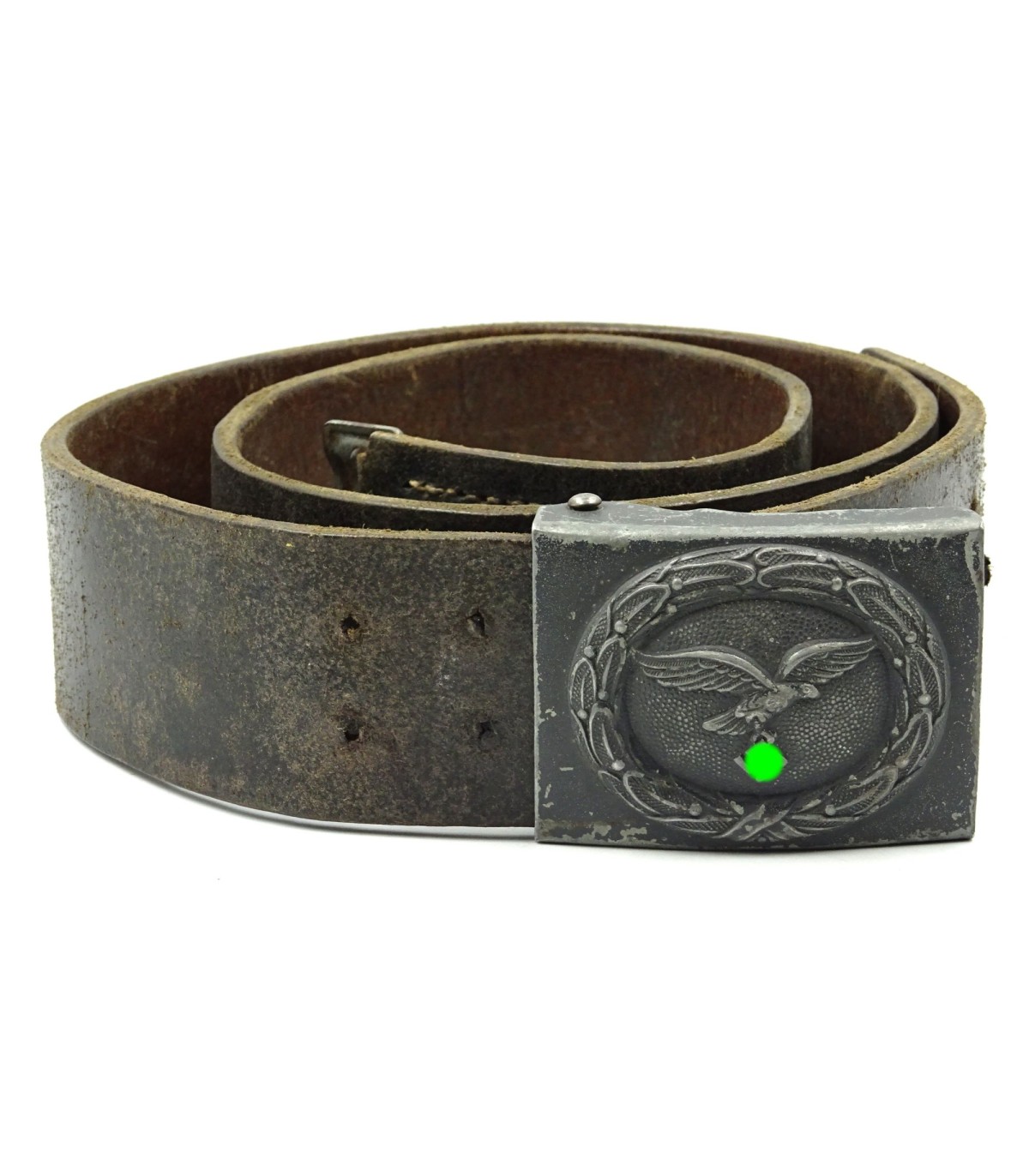 Boucle acier, 2e modèle, peinture gris-LW à 80-90%. Cuir de ceinturon Mle 43, longueur 100cm. BE-TBE.