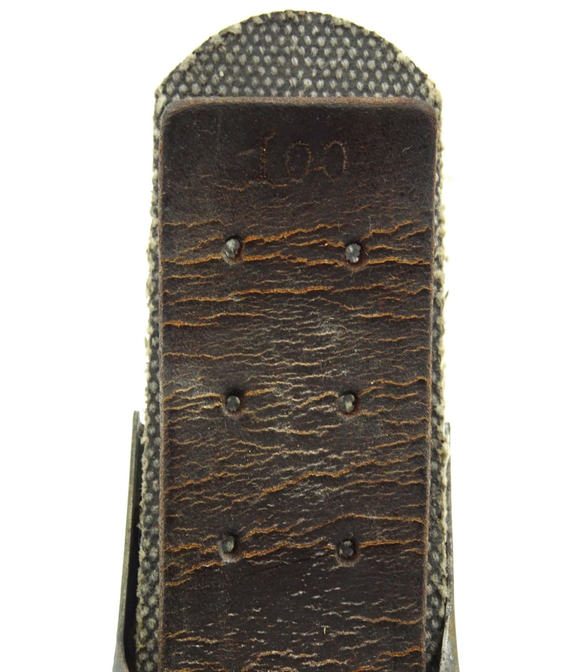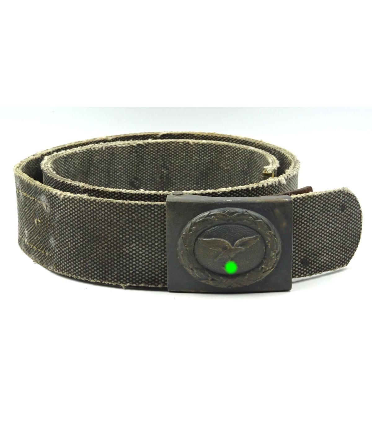 Boucle acier 2e modèle, peinture gris-LW à 80-90%, avec languette toile. Ceinturon toile gris-LW fin de guerre, longueur 100cm. Rare. BE-TBE.
