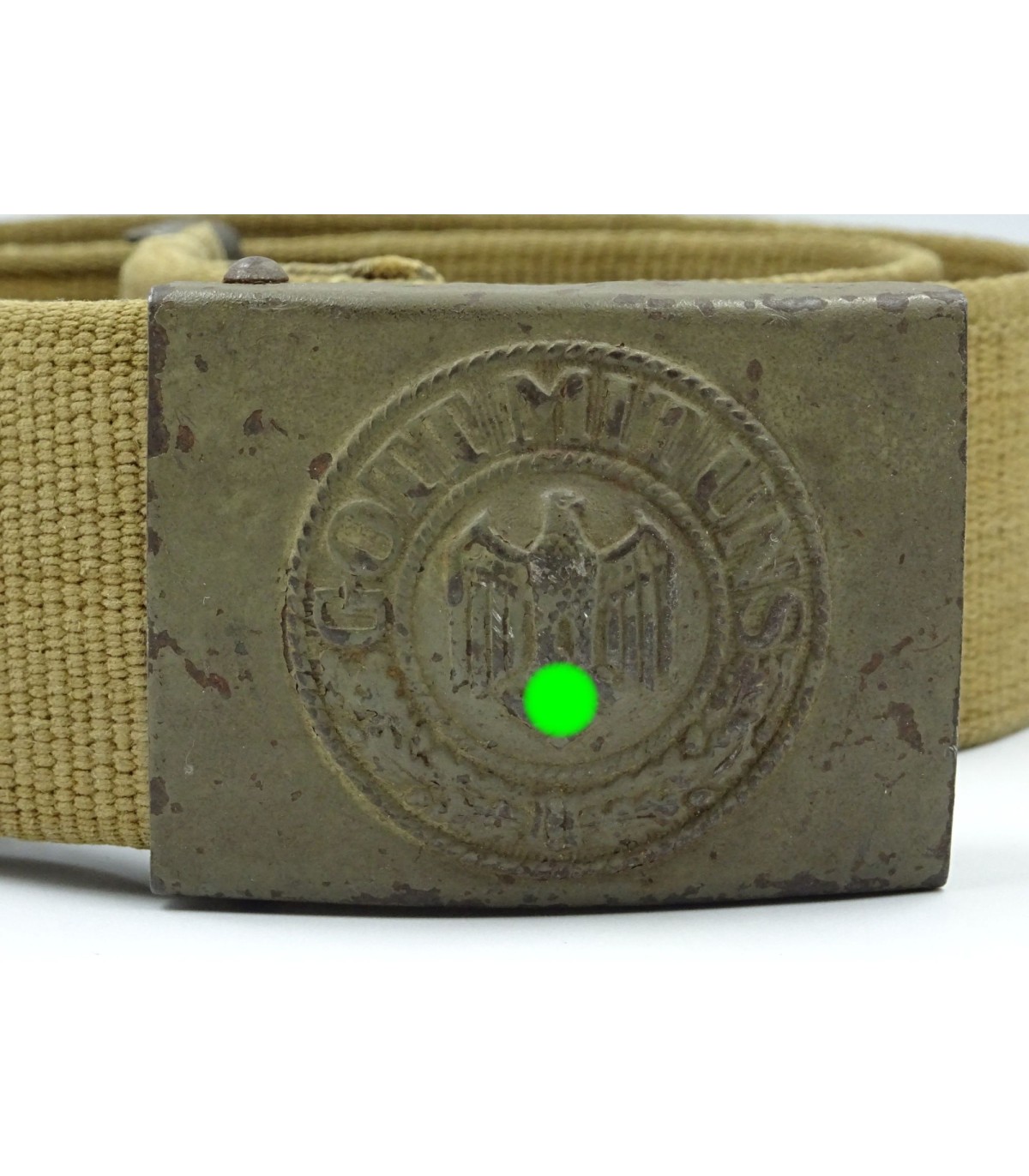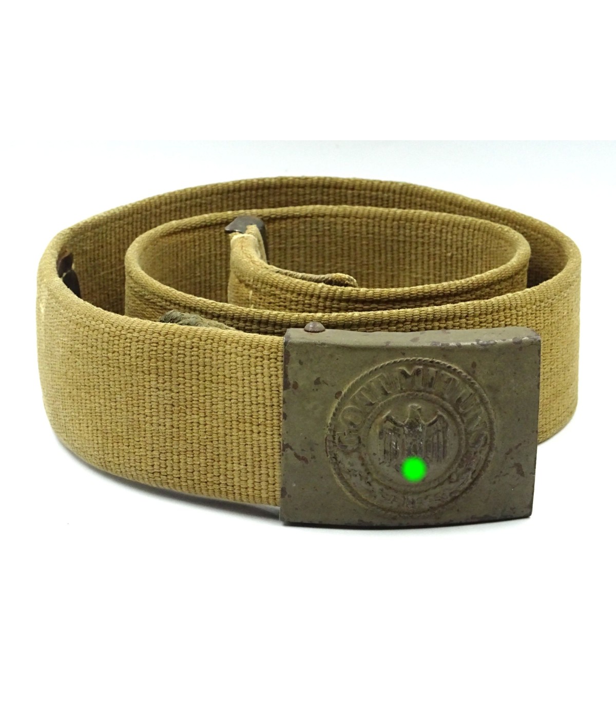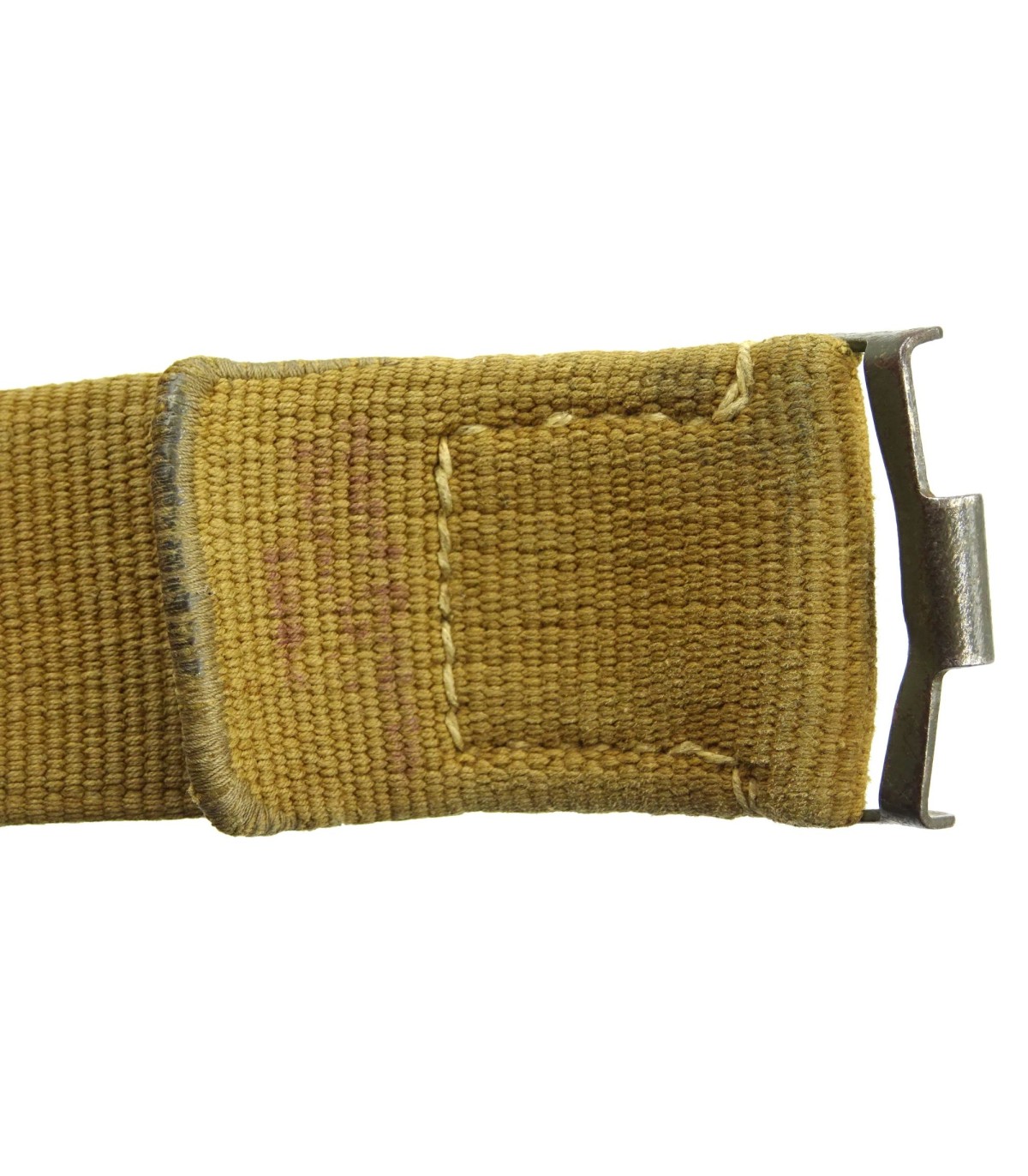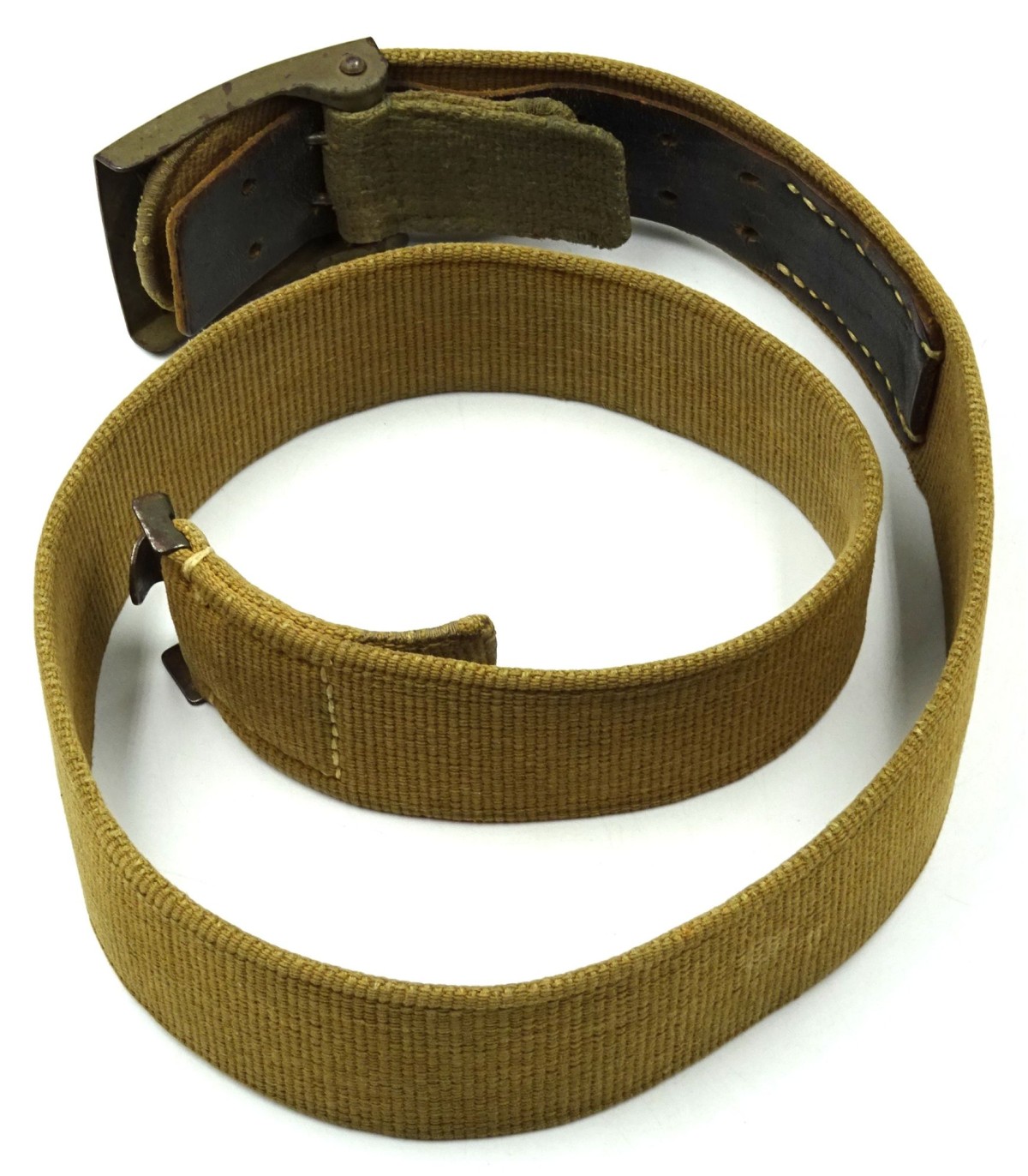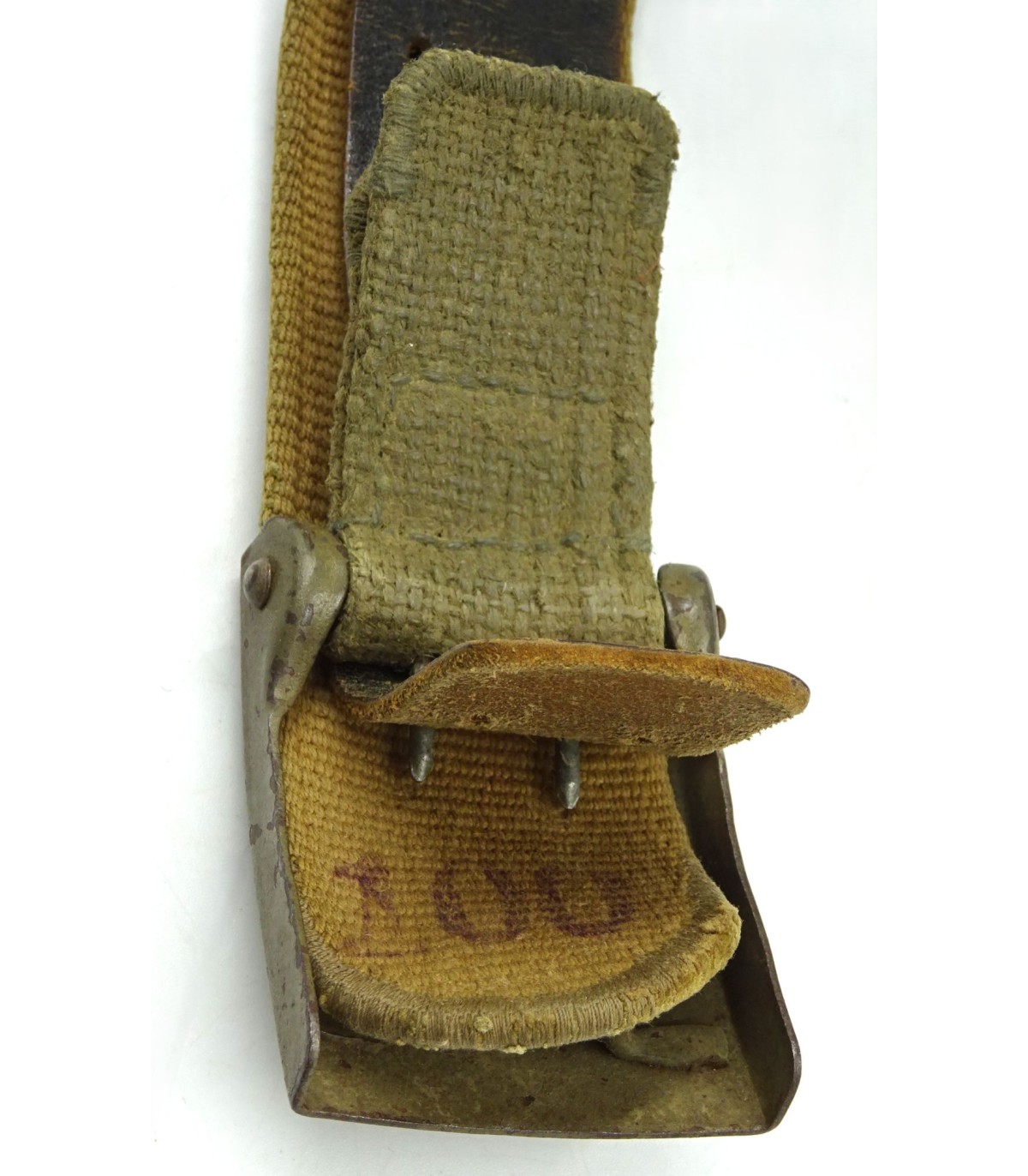 Boucle acier, peinture vert-olive à 90%, avec languette toile. Ceinturon toile sable, crochet spécifique, longueur 95cm. Bel exemplaire en TBE.