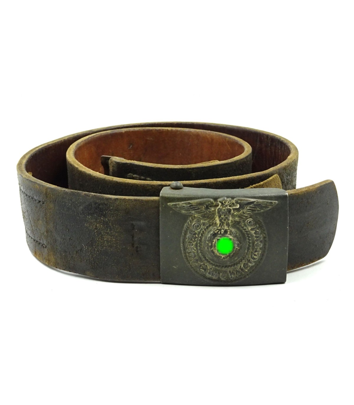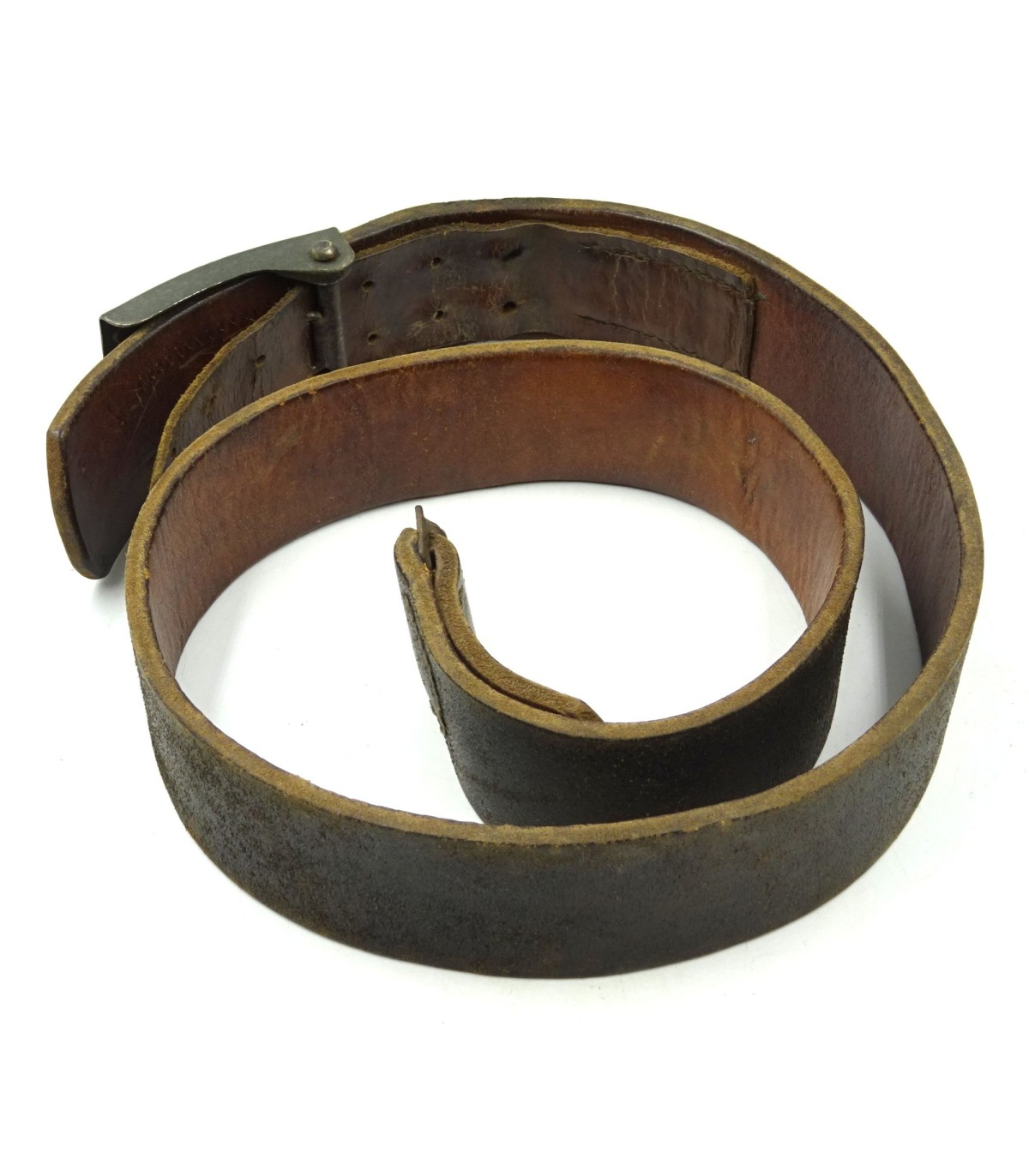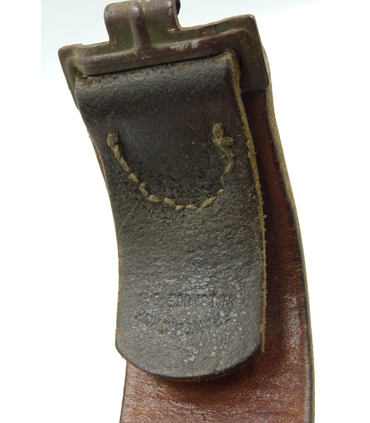 Boucle acier Rodo, peinture feldgrau à 90%. Cuir longueur 95cm, marquage fabricant de 1941. TBE.