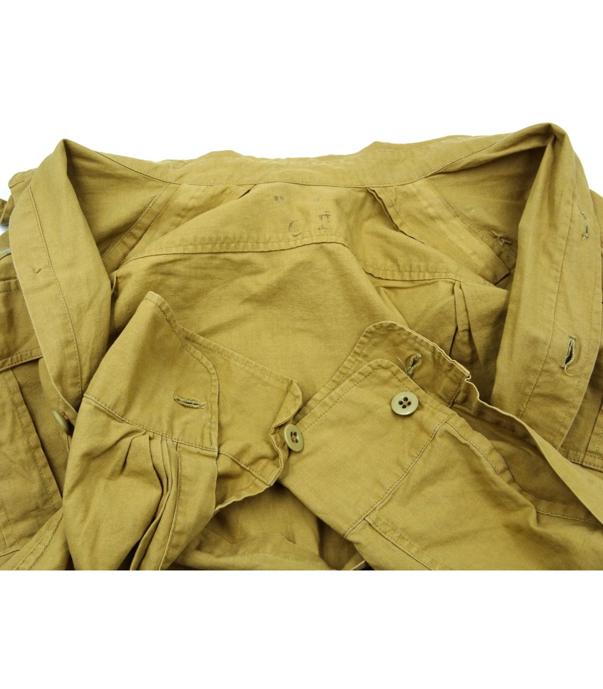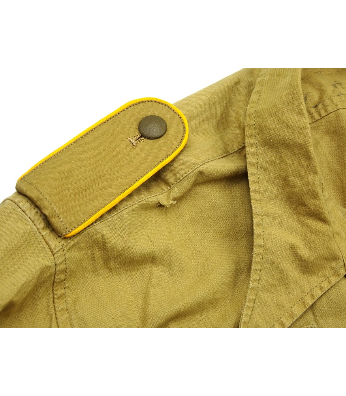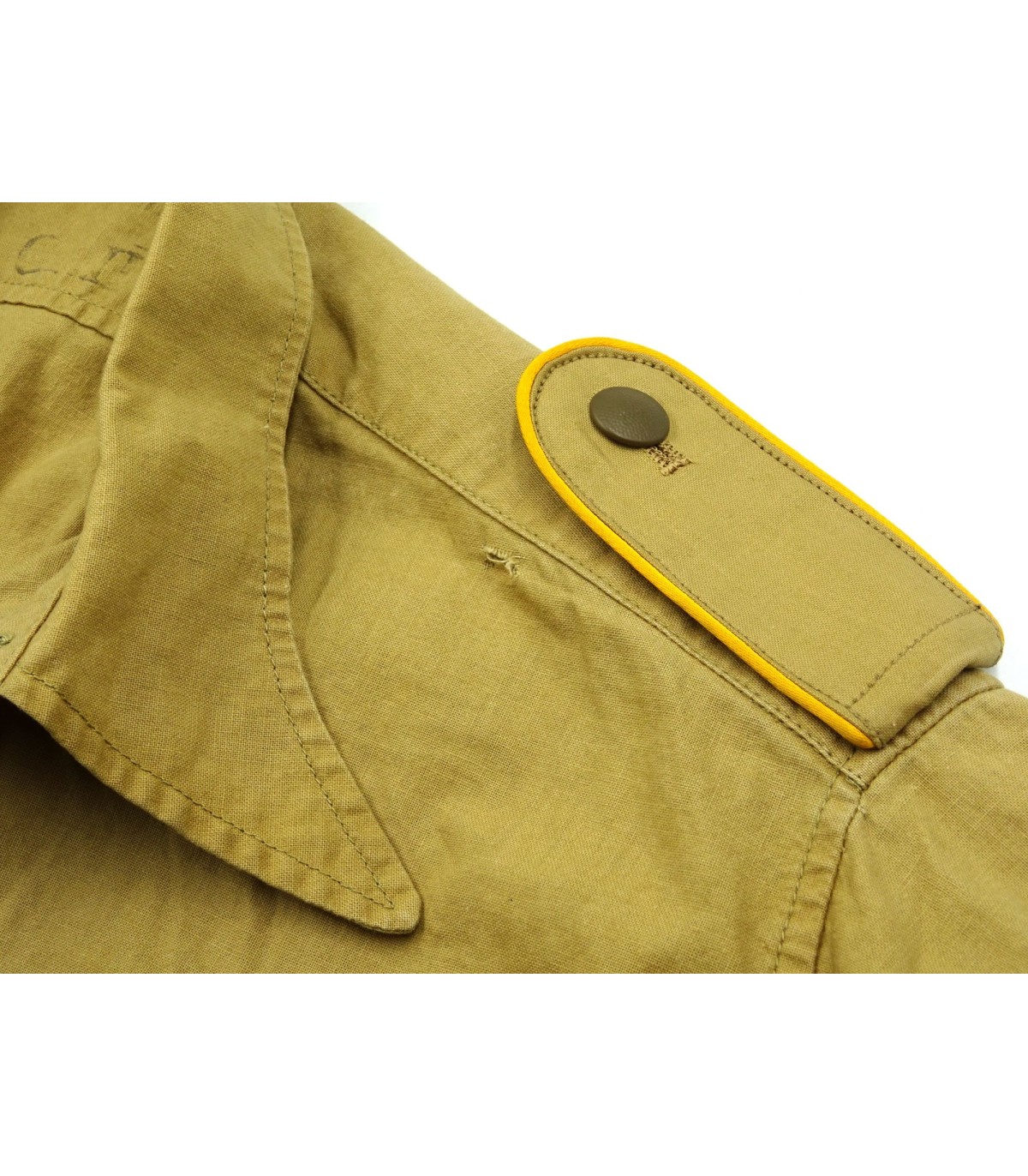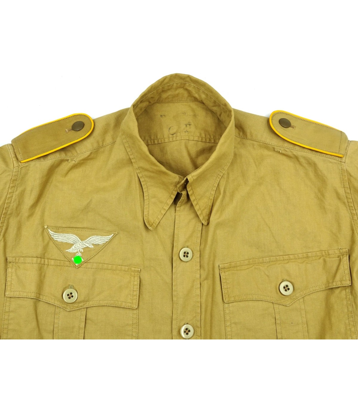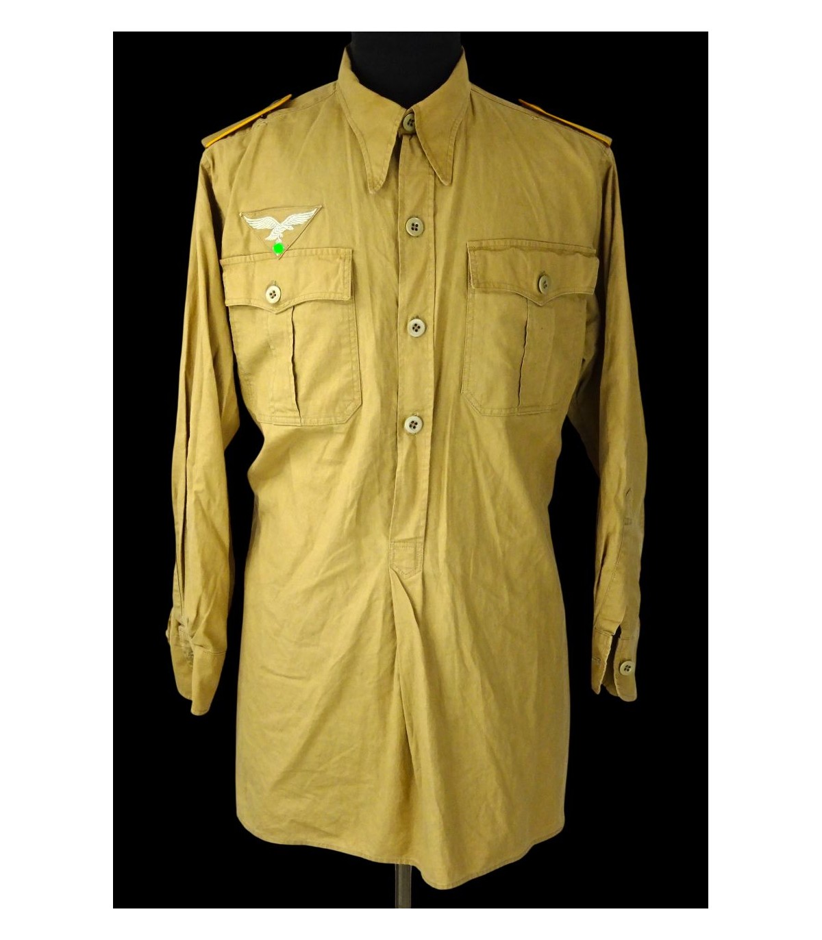 Chemise tropicale sable, manches longues, aigle de poitrine brodé machine et piqué en triangle, pattes d'épaules troupe passepoil jaune d'or des personnels volants de la LW, aviateurs et parachutistes. 2 petits accrocs sinon TBE.