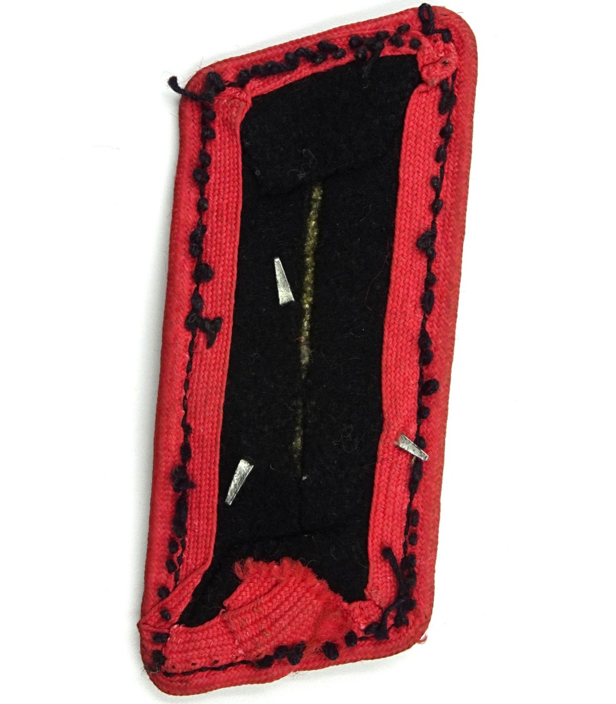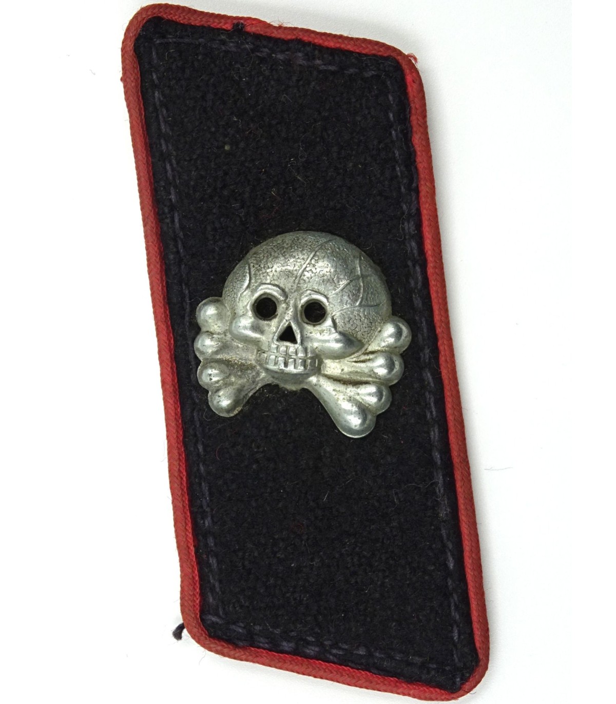 Patte de col de blouson croisé noir des troupes blindées. Fond noir, passepoil rose, tête de mort en zinc. Coté gauche, décousue d'un blouson. TBE.