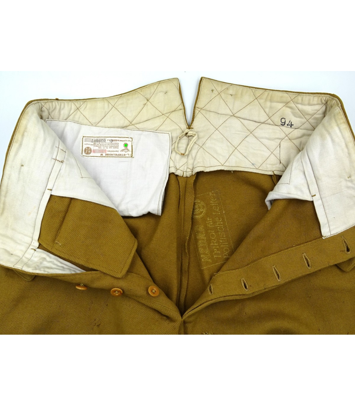 Tricotine brune. Poches à rabats boutonnés. Très belle étiquette PL-Stiefelhose. Tour de taille 86cm. Quelques trous de mites, partiellement réparés. ABE-.