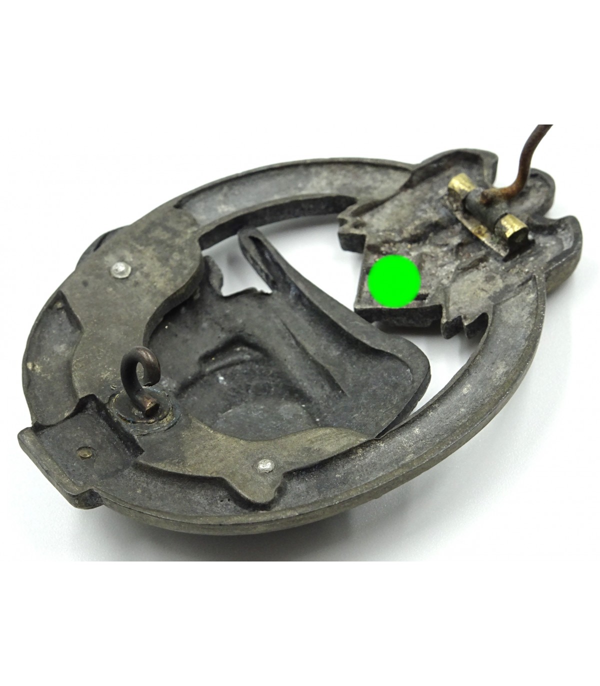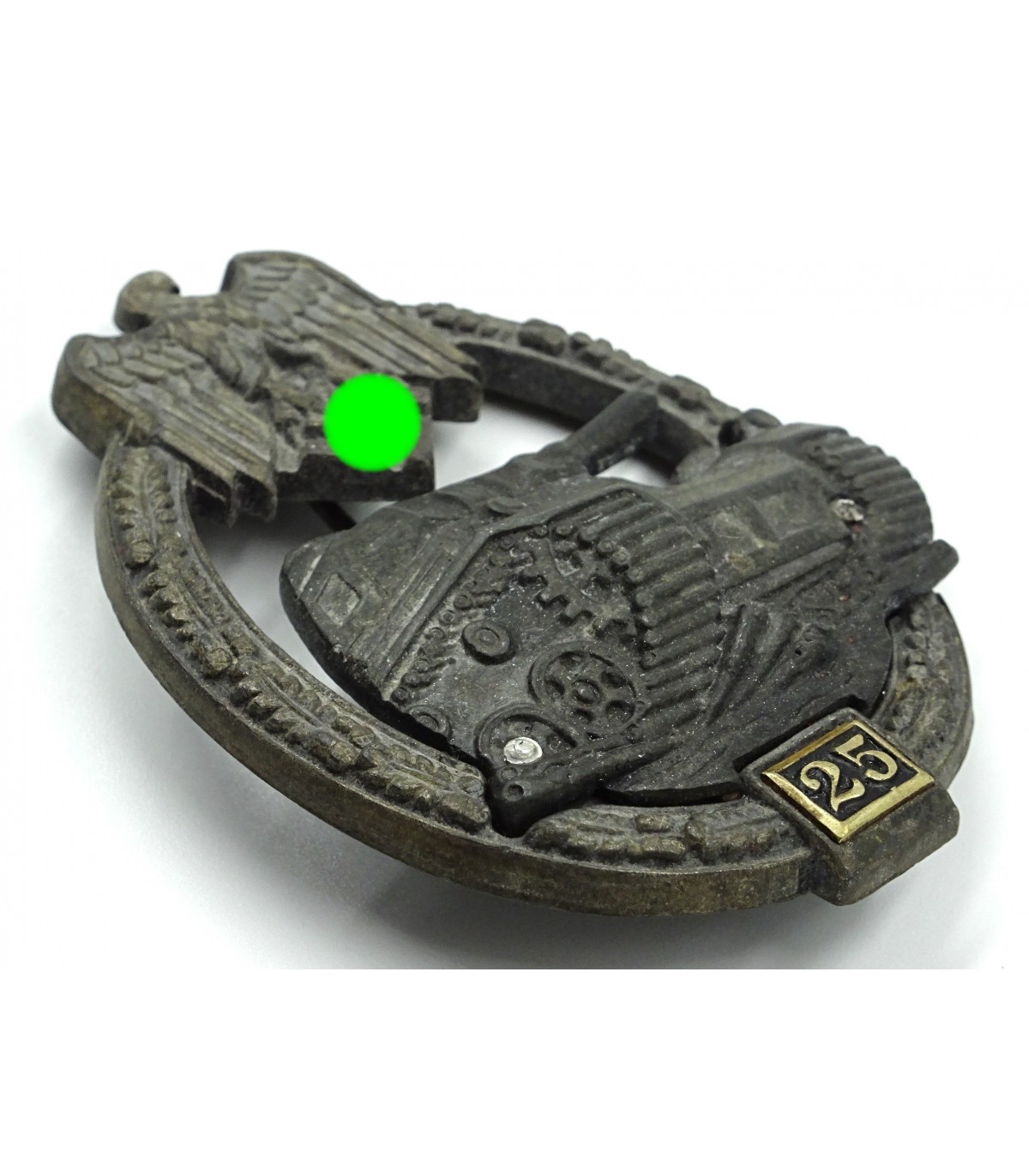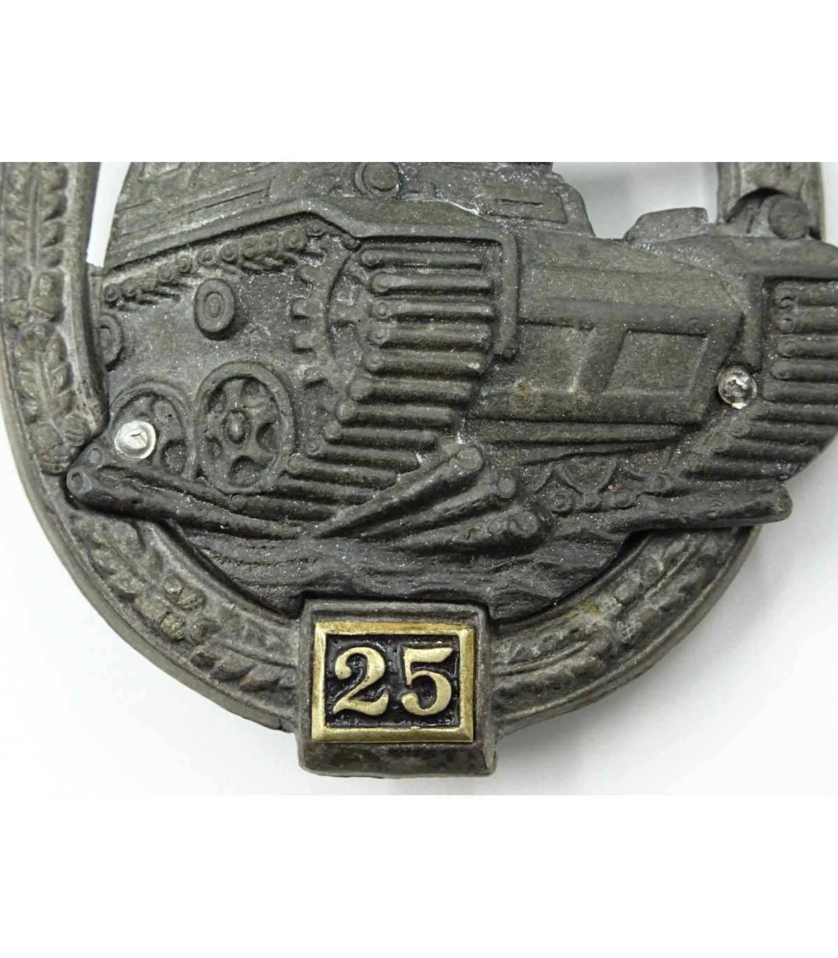 Fabrication semi-creuse. Char riveté. Métal gris. Plaquette '25' rivetée. Epingle ronde. Patine générale. Rare. BE-TBE.