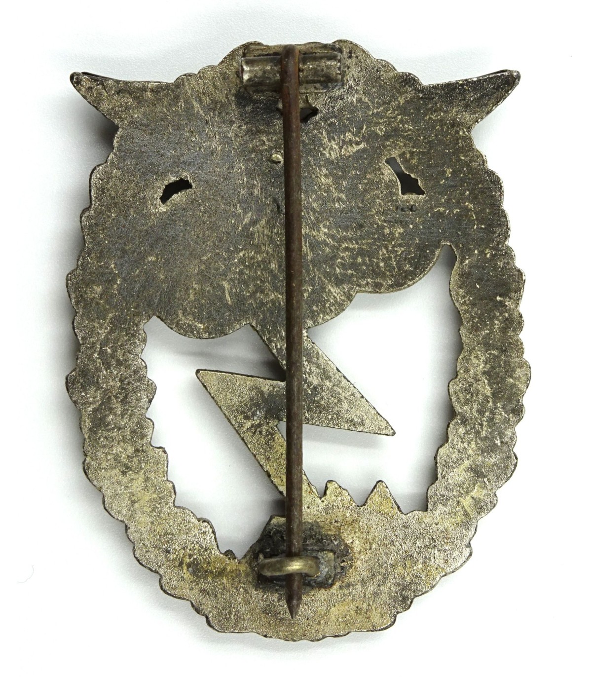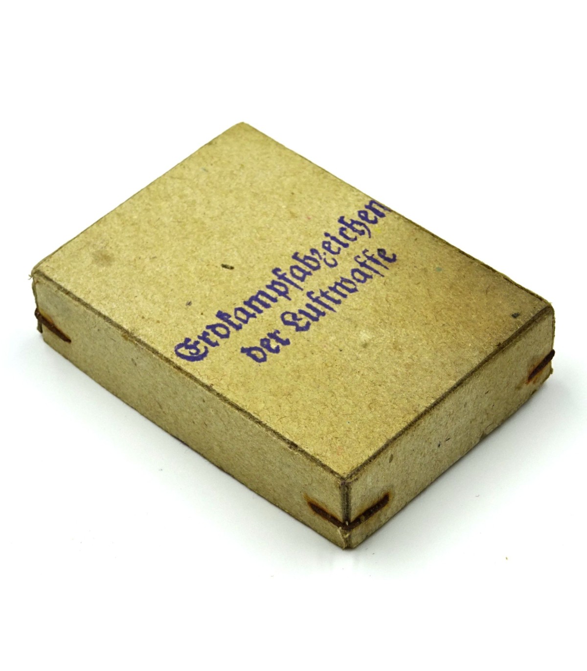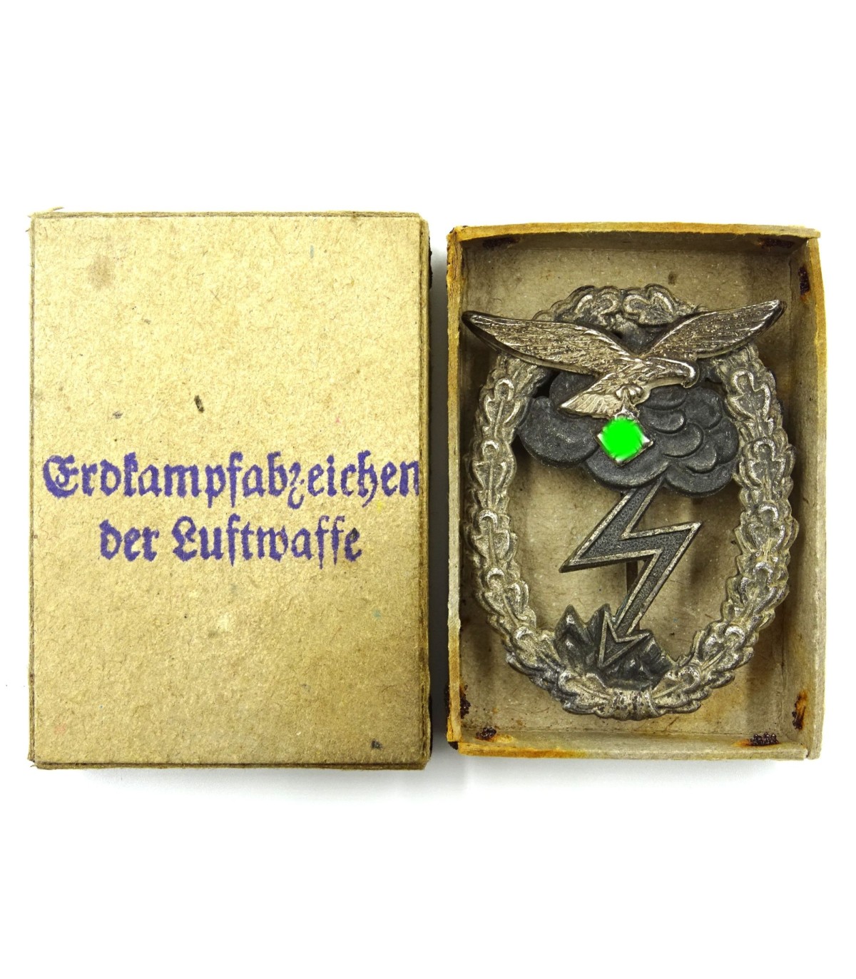 Bonne fabrication en 2 parties, aigle LW rapporté. En boitier carton marqué 'Erdkanpfabzeichen der Luftwaffe'. Insigne TBE, boitier BE-.