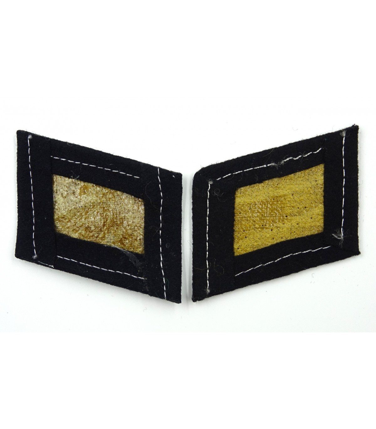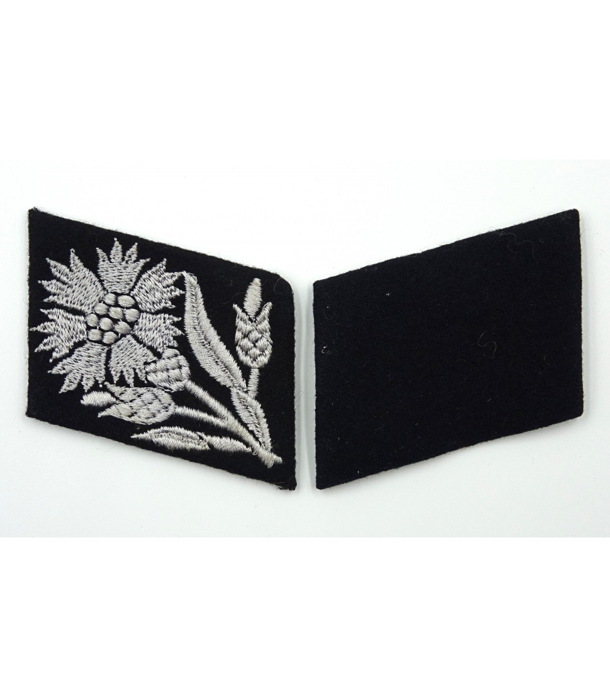 22.SS-Freiwilligen-Kavallerie-Division 'Maria-Theresia'. Brodé machine sur fond de drap d'insigne en laine noire. Provenance: atelier de fabrication d'uniforme de Dachau, pillé par les GI en 1945, où la plupart de ces derniers ont prélevé les côtés droit et délaissé les pattes gauches, ce qui rend les jeux complets particulièrement rares. TBE.