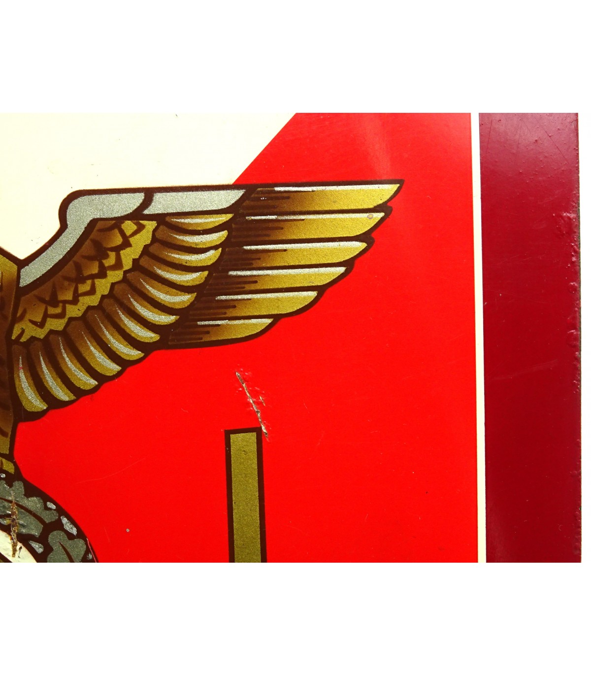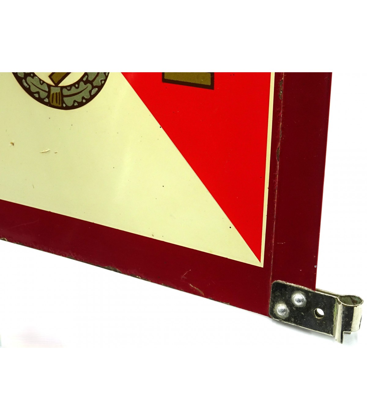 Superbe fanion tôle double face, aigle et 'GL' or sur fond rouge et blanc, tour rouge foncé. Format 29x29. Fixations marquées RZM M3/61. TBE.
