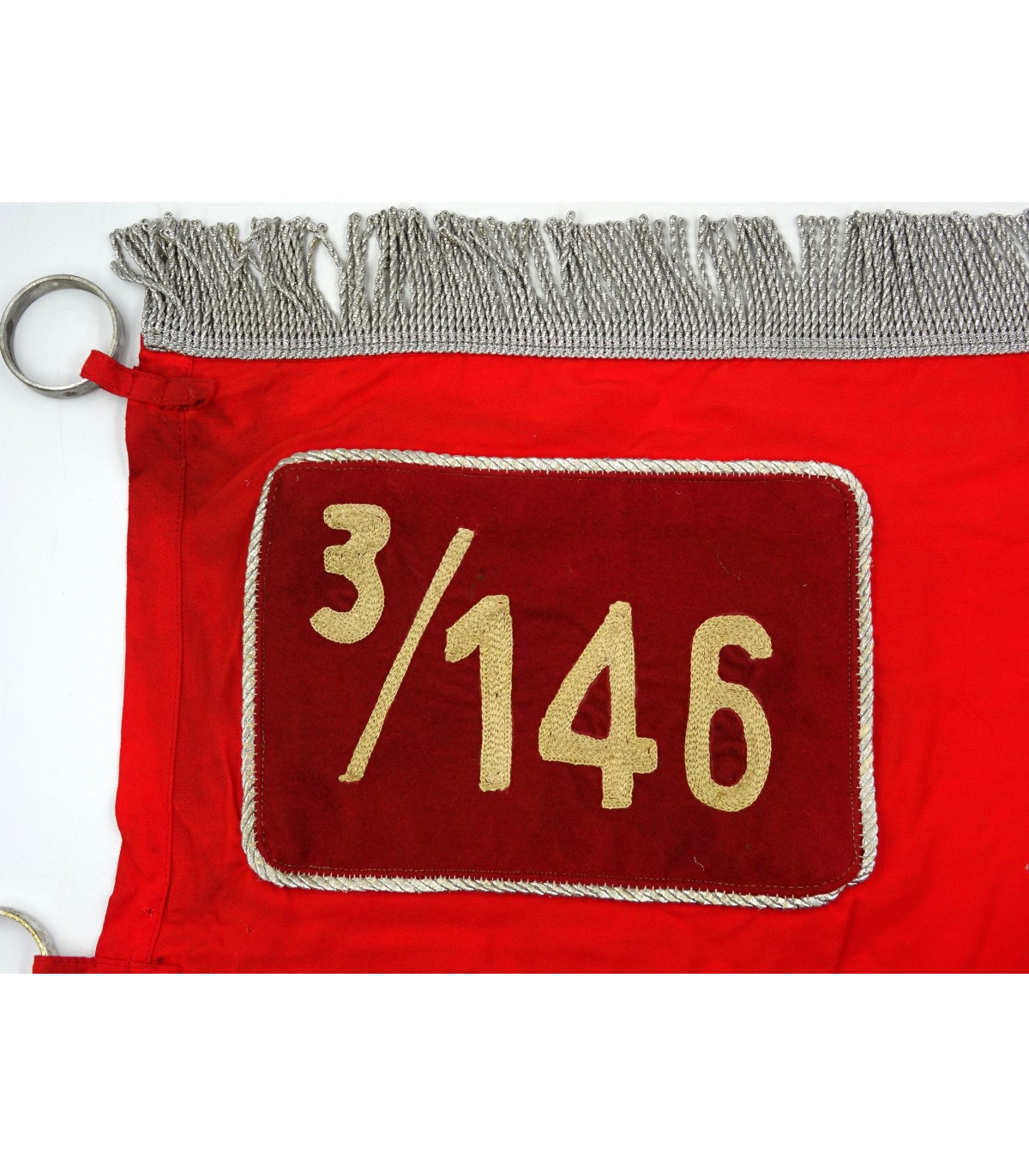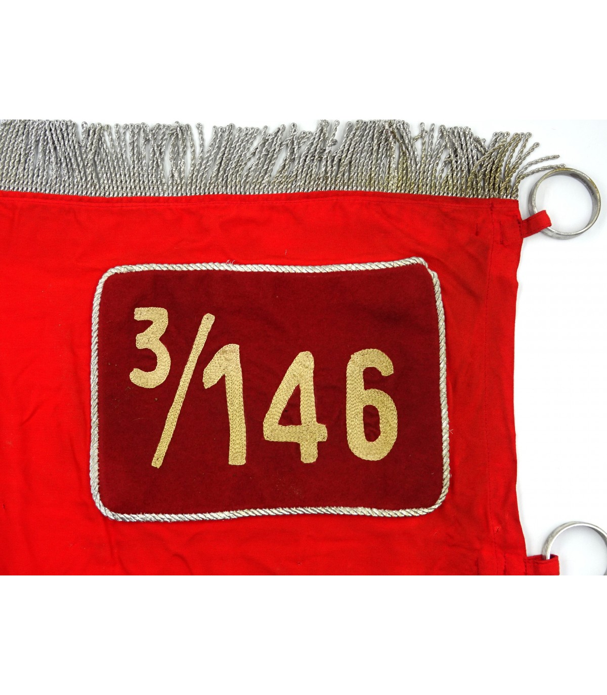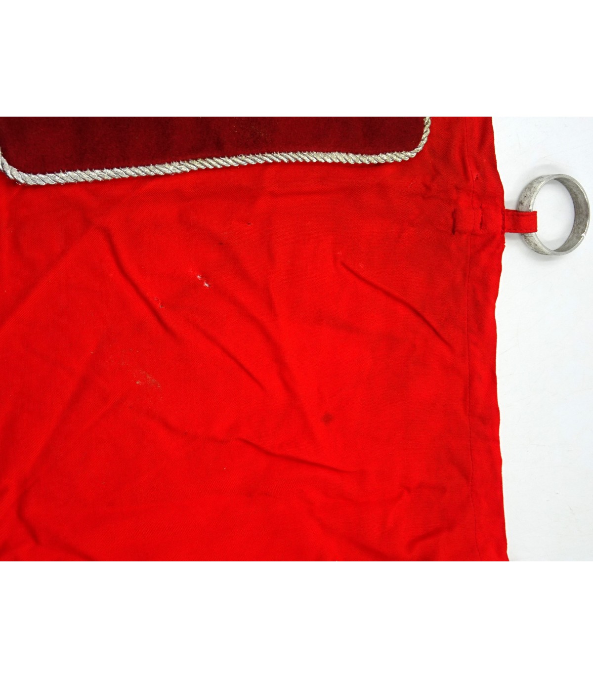 3e Sturm du 146e Standarte, numéros brodés sur fond de laine rouge foncé, pourtour alu. Franges alu. 7 anneaux alu. 165x125. Quelques petits trous sans importance. BE-TBE.