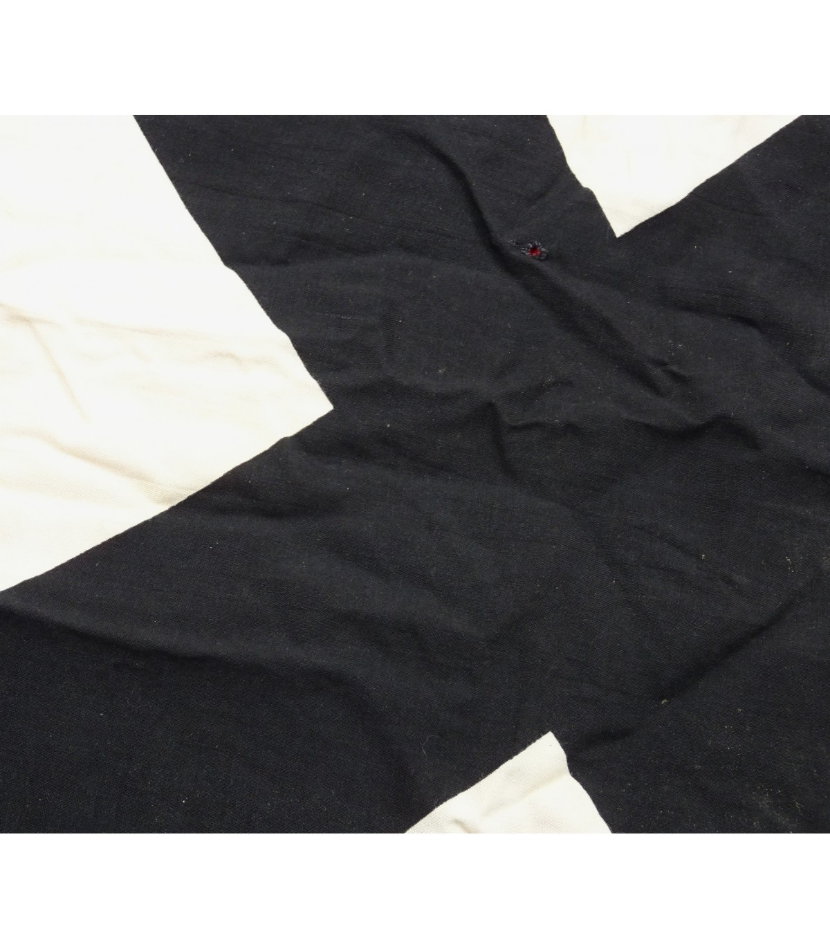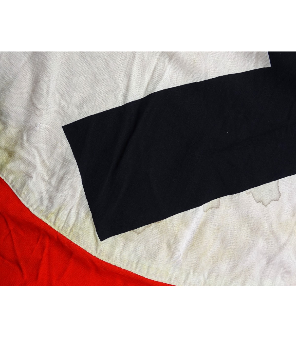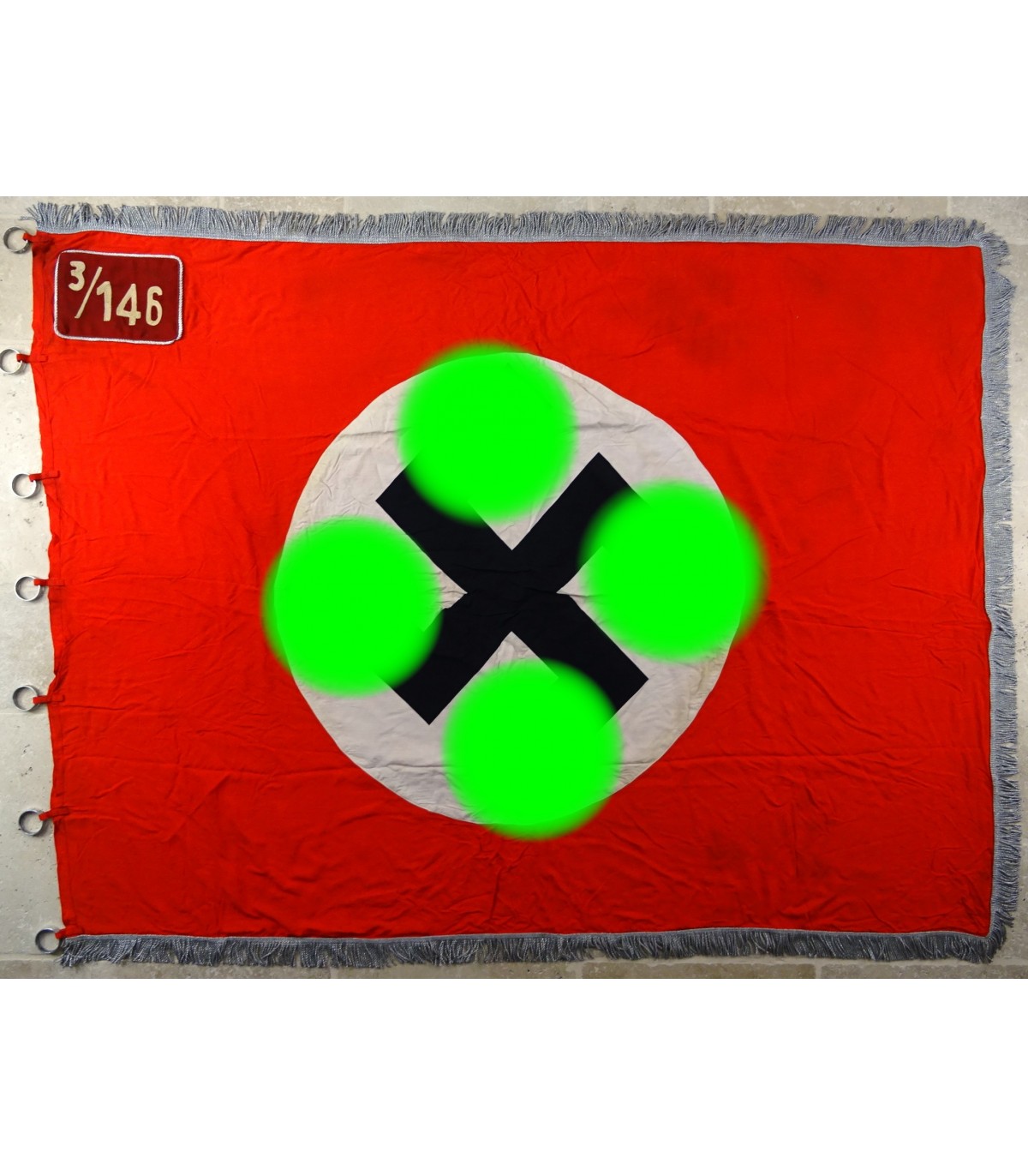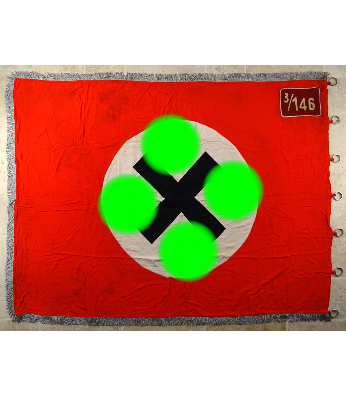3e Sturm du 146e Standarte, numéros brodés sur fond de laine rouge foncé, pourtour alu. Franges alu. 7 anneaux alu. 165x125. Quelques petits trous sans importance. BE-TBE.